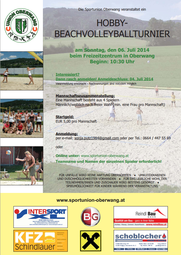 Am 6. Juli 2014 findet im Zuge des Fussball-Vereinsturniers auch ein Hobby-Volleyball-Beach-Turnier statt und wir würden uns über viele Mannschaften freuen.