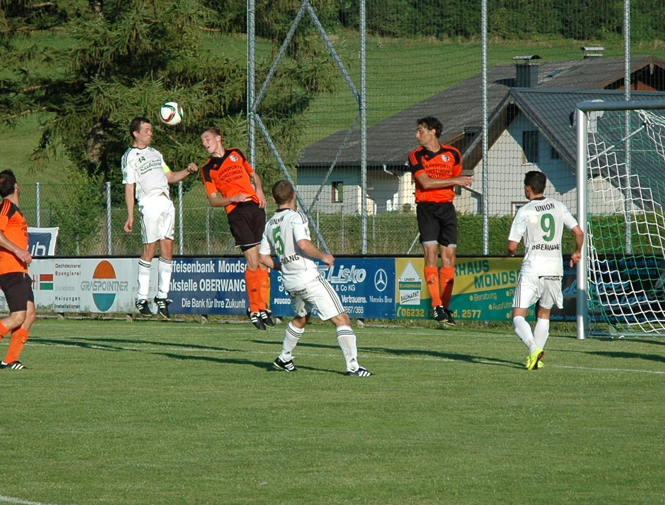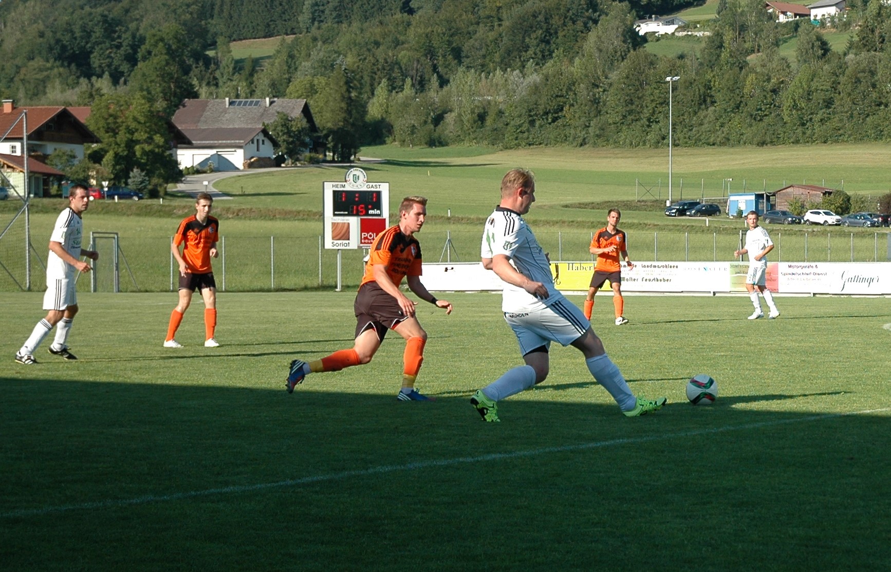 Selbst das sehr heiße Wetter kann die Mannschaften nicht davon abhalten, von Anfang an den Weg zum gegnerischen Tor zu suchen. Ein flottes Spiel entwickelt sich, in dem die Gäste aus Roitham das erste Ausrufezeichen setzen können. Gabor Sagi wird mit einem Pass aus dem Mittelfeld bedient und lässt Tormann Alexander Breitenthaler mit einem Schuss ins Eck keine Chance. (9.) Oberwang zeigt sich aber nicht geschockt und arbeitet sofort am Ausgleich. Der gelingt sechs Minuten später schon. Robert Speer flankt zur Mitte, wo Rene Putz freisteht und zum 1:1 einschiebt. In der 20. Minute kommt Roman Wimmer zur nächsten Chance, sein Kopfball geht ins Außennetz. Zum Ende der ersten Halbzeit flacht das Spiel ab, Oberwang ist aber die etwas gefährlichere Mannschaft. Mario Lettner kann vom Flügel bis zum Tor vordringen, erst Torwart Roman Messics kann ihn stoppen. (34.) Kurz vor der Pause wird ein Schuss von Markus Lametschwandtner abgeblockt, Robert Speer schießt im Nachschuss volley drüber. Mit 1:1 geht es in die Pause.
