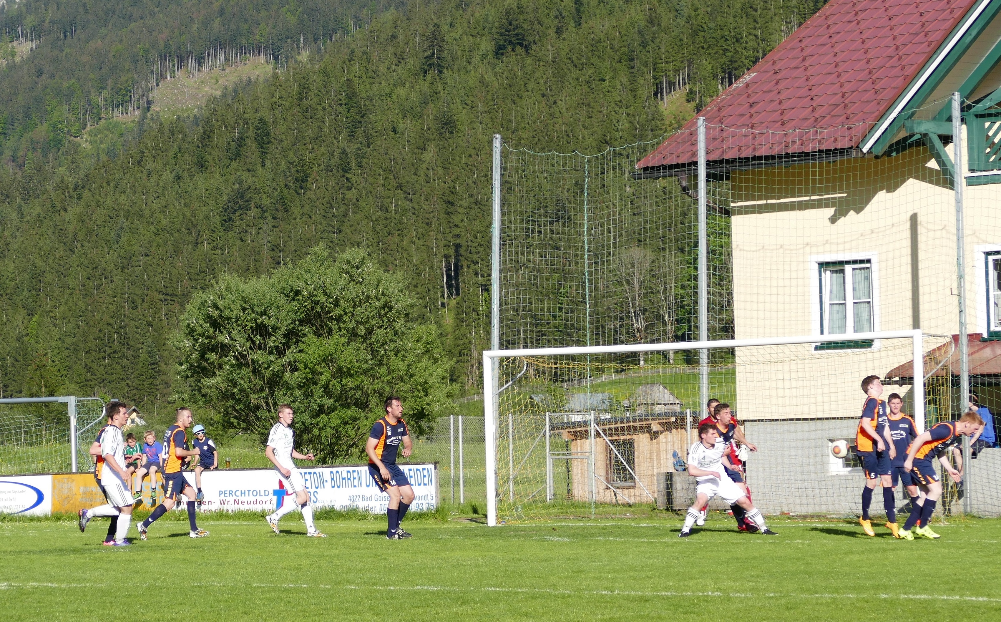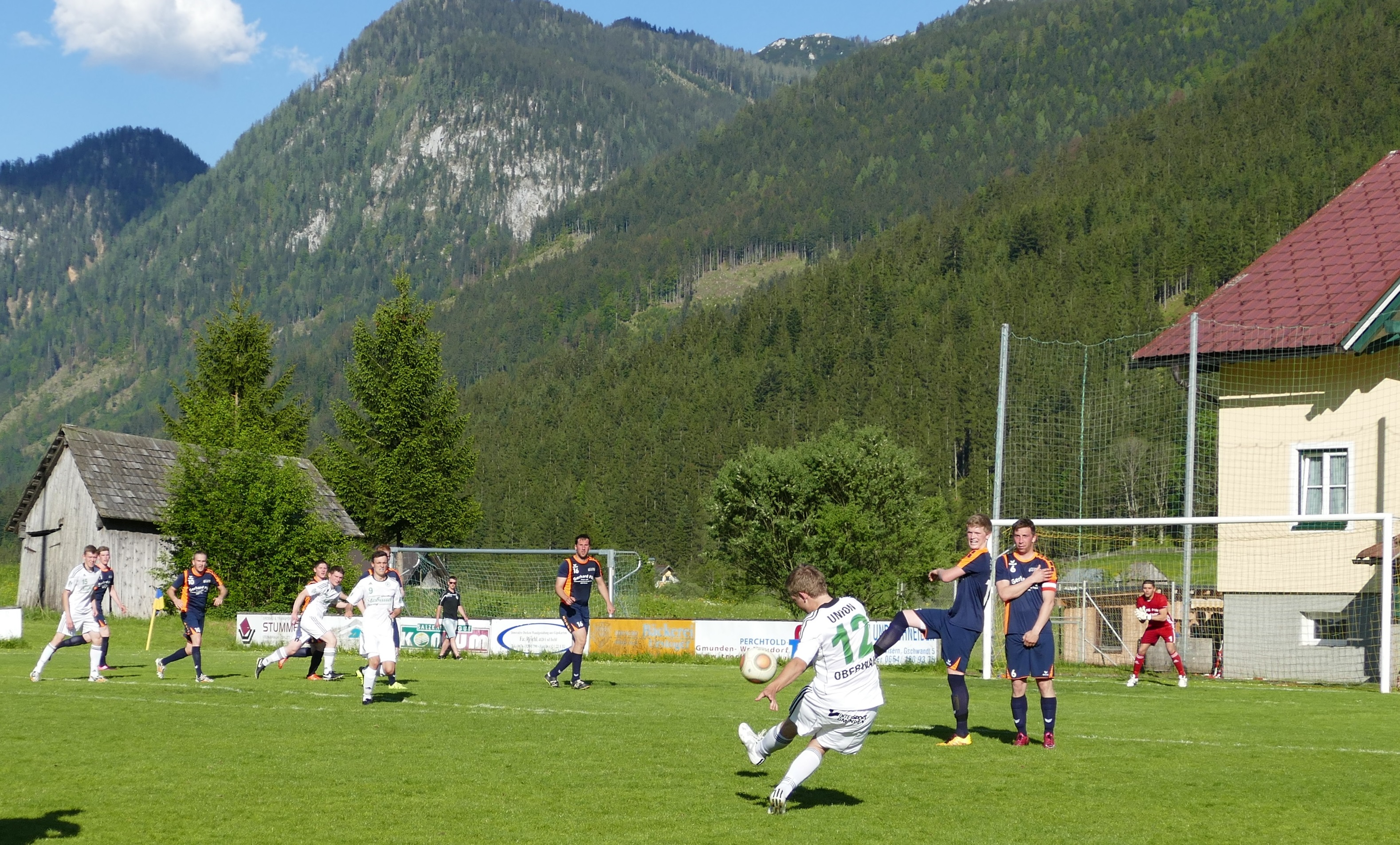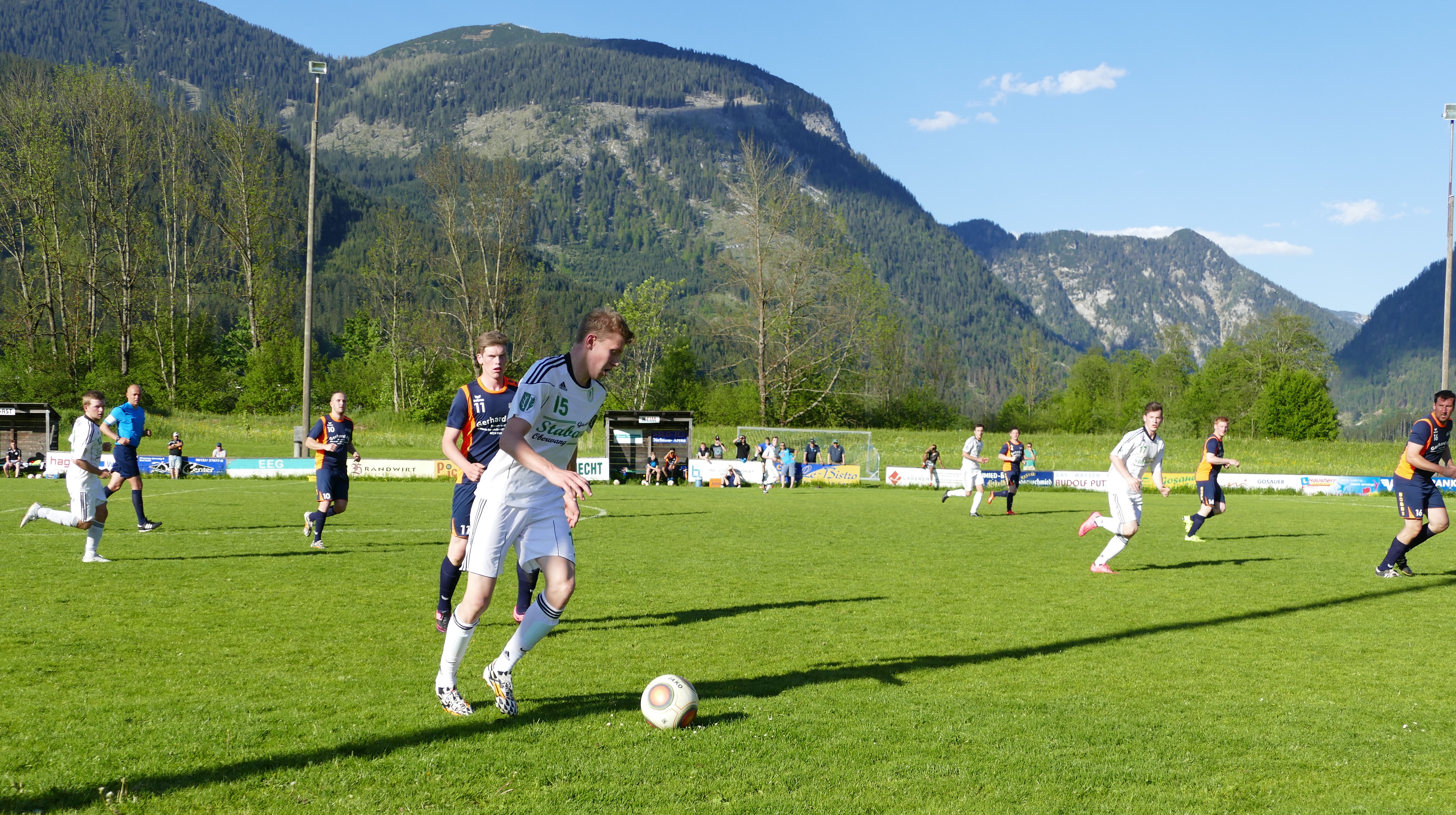 Bei gefühlten 30 ° Celsius in Gosau erleidet die Hoffnung auf Punkte für Oberwang schnell einen Dämpfer, denn die Gosauer präsentieren sich eiskalt vorm Tor. Goalgetter Miroslav Grom taucht in der 16. Minute das erste Mal vorm Oberwanger Tor auf und erzielt prompt das 1:0 für die Heimmannschaft. Nur vier Minuten später bekommt Gosau einen Freistoß in guter Position zugesprochen. Maros Grom lässt sich diese Chance nicht entgehen, er zirkelt den Ball ins rechte Eck und sorgt so schon früh für die 2:0 Führung für Gosau. Schwierige Situation für die Oberwanger, die sich schwer tun, Chancen zu kreieren. In der 37. Minute flankt Rene Putz auf Robert Speer, doch der wird beim Kopfball noch entscheidend gestört. Mehr gibt es in der ersten Hälfte von Oberwang nicht mehr zu sehen, auch Gosau liefert kein Spektakel, doch sie nutzen die Chancen, die sie haben. Miroslav Grom zieht in der 42. Minute von außen in den Strafraum und wird dort gefoult, der Schiedsrichter entscheidet auf Elfmeter. Der Gefoulte verwandelt den Elfmeter selbst und sorgt so für die 3:0 Pausenführung von Gosau.