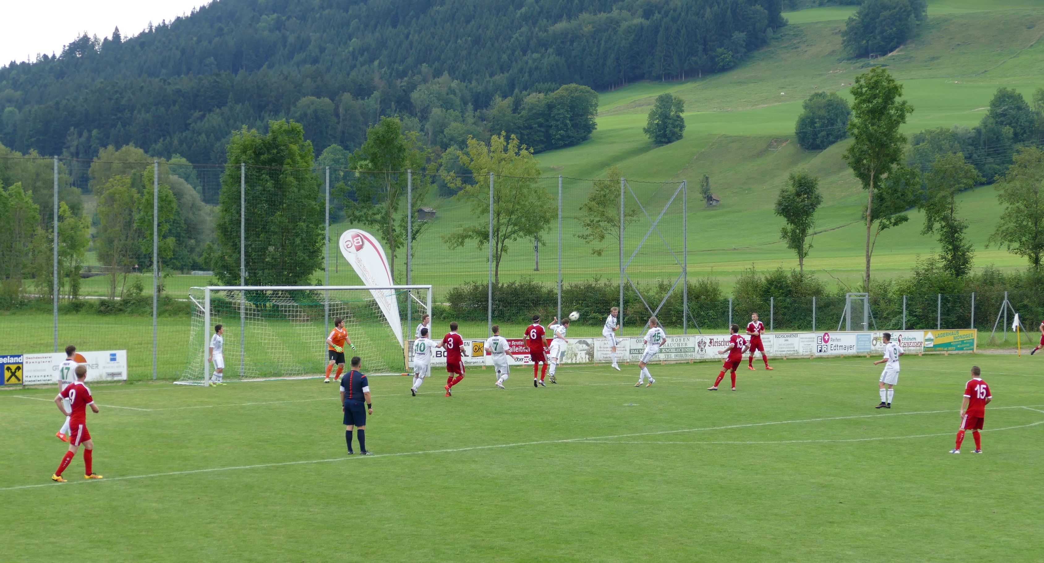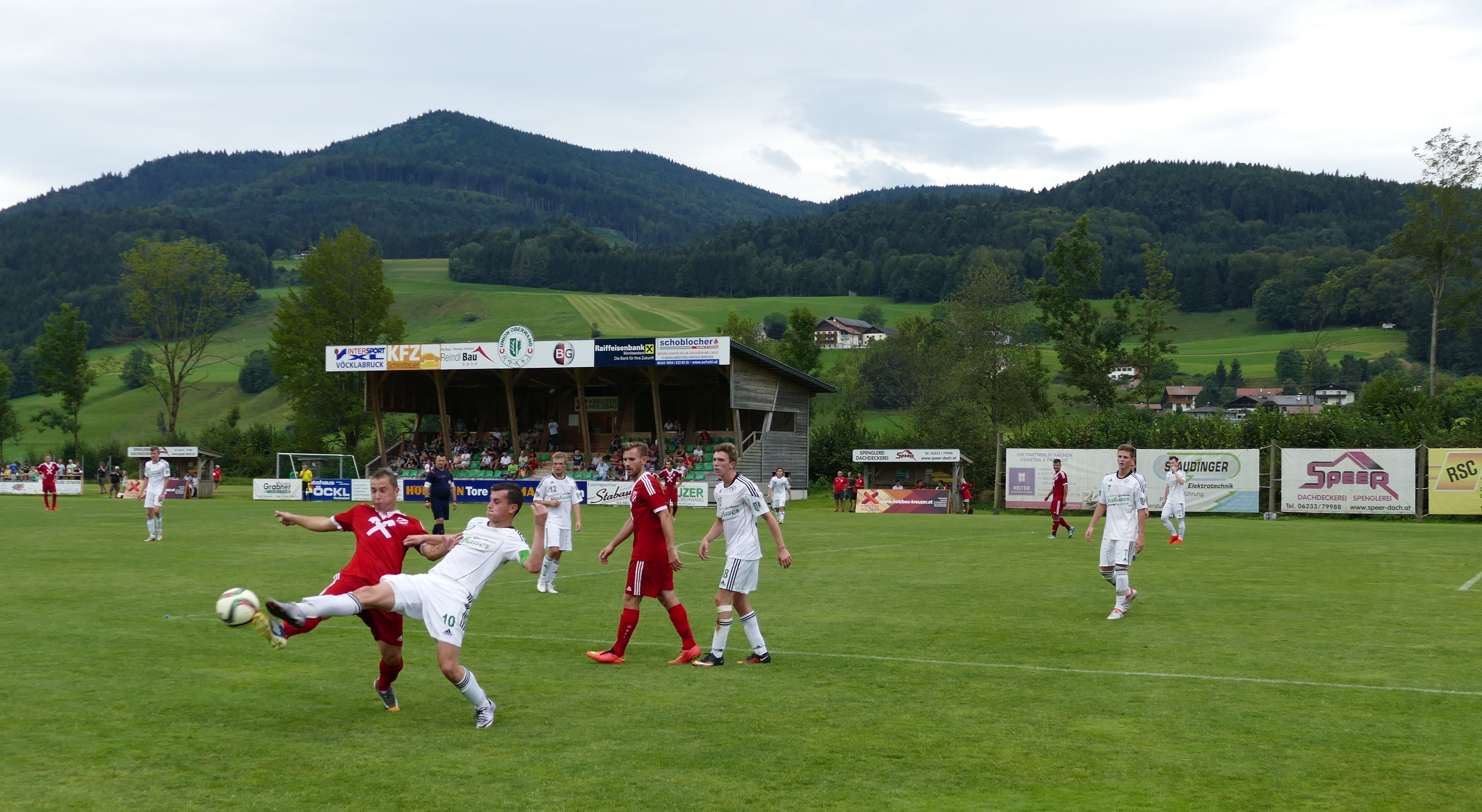 Vor 150 Zuschauern wird dieses Vorhaben aber schnell auf eine harte Probe gestellt. Bereits in der 8. Minute gehen nämlich die Gäste aus Timelkam in Führung. Die Oberwanger zeigen sich in der Defensive nicht konsequent genug. Timelkams Nermin Jahic bekommt den Ball mit dem Rücken zum Tor stehend, doch er kann aus der Drehung schießen und erzielt so die frühe 1:0 Führung für seine Mannschaft. Die Oberwanger verzeichnen bis auf diesen folgenschweren Fehler eine gute Anfangsphase, es ist eine durchaus ansehnliche Partie mit schnellen Kombinationen. Bereits in der zehnten Minute hat Oberwang die erste Ausgleichschance, doch der Schuss von Andreas Hofauer wird von einem Feldspieler auf der Linie abgeblockt. Die Heimmannschaft ist die deutlich aktivere Mannschaft und kommt nach 33 Minuten zum hochverdienten Ausgleich. Robert Speer wird mit einem präzisen Pass durch die Abwehr bedient und lässt Torwart Illy keine Chance – 1:1. Das ist auch der Pausenstand.