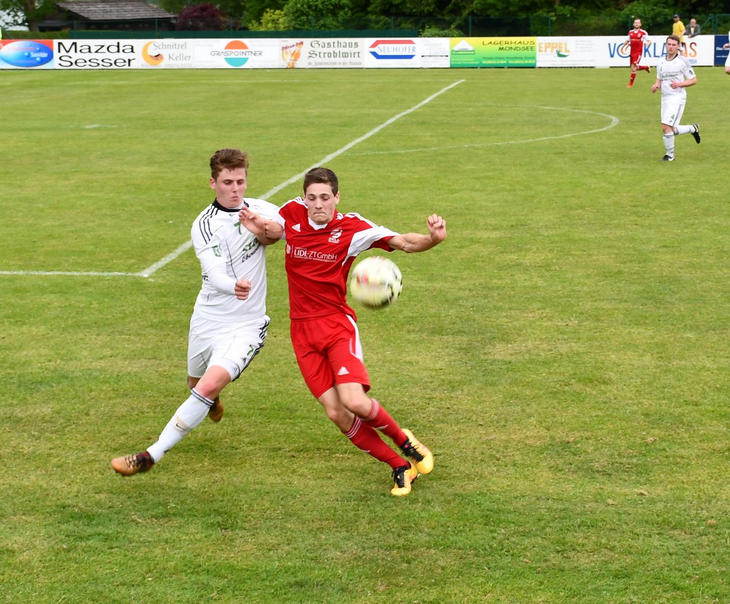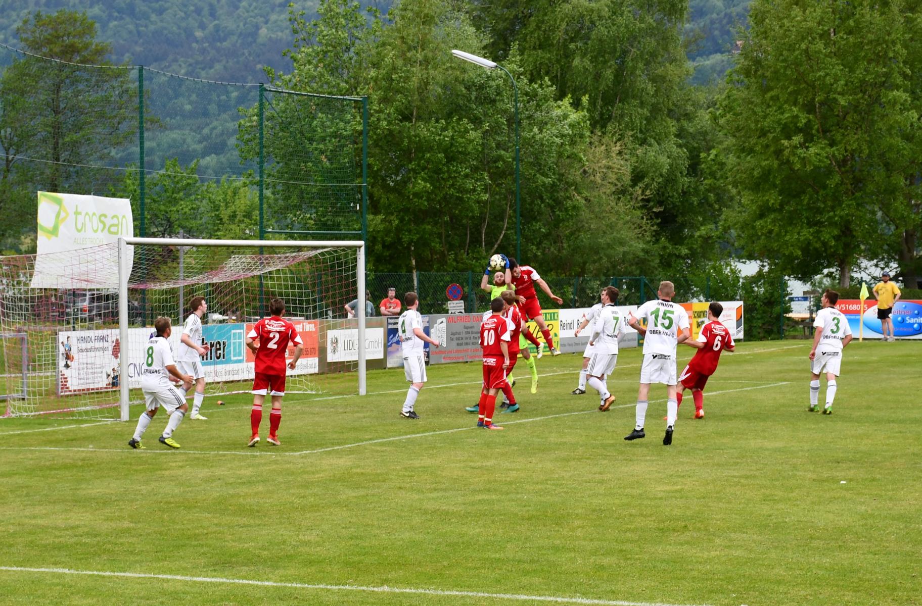 Beide Mannschaften sind sich der Wichtigkeit der Partie bewusst und gehen dementsprechend vorsichtig in die Partie. In der Anfangsphase neutralisieren sich beide Teams im Mittelfeld, das Spiel ist umkämpft, aber die Verteidigungen lassen nichts zu. In der 20. Minute kommen die Oberwanger zum ersten Torschuss, der Kopfball von Johannes Scheiblauer geht aber klar übers Tor. Etwas näher dran am ersten Treffer sind sie in der 25. Minute. Mathias Schmidt erläuft sich den Ball, spielt quer auf Florian Trinker, dessen Torschuss noch abgeblockt wird. Auch der Nachschuss des aufgerückten Julian Soriat wird kurz vor der Linie abgewehrt. Die vielen Oberwanger Zuschauer am Zeller Sportplatz dürfen in der 33. Minute das erste Mal jubeln. Nach einem Freistoß von Zell am Moos spielt Florian Trinker im Konter schnell in die Spitze zu Marco Szalay, der alleine vor Tormann Schindlauer eiskalt bleibt und zum 1:0 einnetzt. Die Oberwanger gehen verdient in Führung, haben dann aber auch mal hinten etwas zu tun. Torwart Marco Plank bleibt nach einem harten Zusammenstoß nach einem Eckball angeschlagen liegen, kann aber nach kurzer Behandlungspause weiterspielen. Seine Tormannfähigkeiten sind kurz darauf wieder gefragt. In der 42. Minute bedient Christoph Grabner Dragan Miskovic per Lochpass, aber Marco Plank ist auf dem Posten und kann seinen Schuss aus spitzem Winkel bravourös entschärfen. Beim Nachschuss entsteht ein Getümmel im Strafraum und der Schiedsrichter entscheidet plötzlich auf Strafstoß für Zell am Moos. Josef Speer soll anscheinend einem Gegenspieler auf den Fuß getreten sein, eine etwas strittige Entscheidung zu einer unübersichtlichen Szene. Mario Jakovljevic ist das egal und verwandelt den Elfmeter zum 1:1 Ausgleich. Marco Plank hat zwar die Ecke erraten, aber der Schuss ist zu platziert. In der Schlussminute der ersten Hälfte gibt es noch einmal Freistoß für Oberwang. Markus Soriat flankt in den Strafraum und findet Josef Speer, der den Kopfball knapp rechts neben das Tor setzt. Damit geht es mit dem 1:1 in die Kabine.