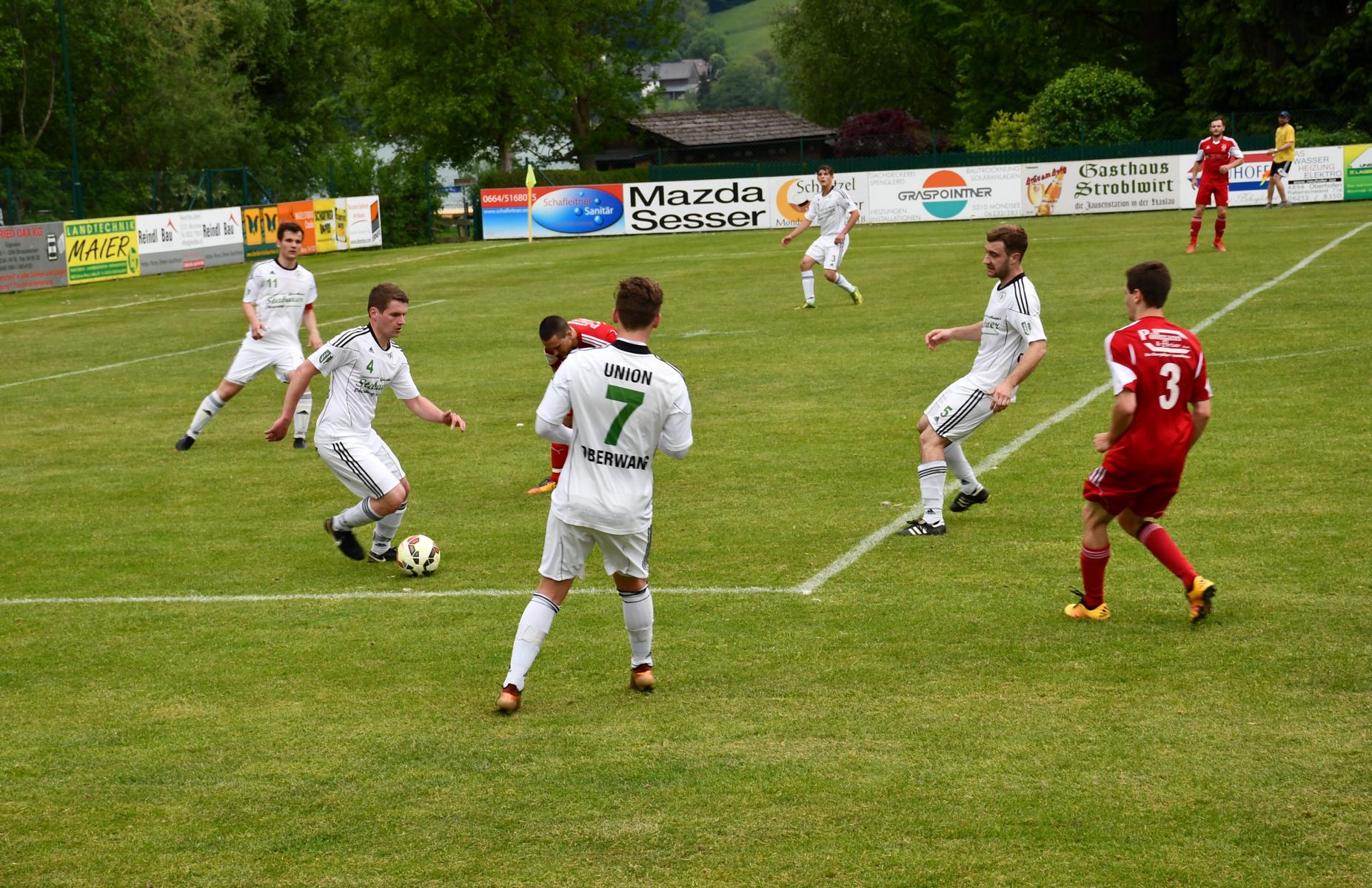 Beide Mannschaften sind sich der Wichtigkeit der Partie bewusst und gehen dementsprechend vorsichtig in die Partie. In der Anfangsphase neutralisieren sich beide Teams im Mittelfeld, das Spiel ist umkämpft, aber die Verteidigungen lassen nichts zu. In der 20. Minute kommen die Oberwanger zum ersten Torschuss, der Kopfball von Johannes Scheiblauer geht aber klar übers Tor. Etwas näher dran am ersten Treffer sind sie in der 25. Minute. Mathias Schmidt erläuft sich den Ball, spielt quer auf Florian Trinker, dessen Torschuss noch abgeblockt wird. Auch der Nachschuss des aufgerückten Julian Soriat wird kurz vor der Linie abgewehrt. Die vielen Oberwanger Zuschauer am Zeller Sportplatz dürfen in der 33. Minute das erste Mal jubeln. Nach einem Freistoß von Zell am Moos spielt Florian Trinker im Konter schnell in die Spitze zu Marco Szalay, der alleine vor Tormann Schindlauer eiskalt bleibt und zum 1:0 einnetzt. Die Oberwanger gehen verdient in Führung, haben dann aber auch mal hinten etwas zu tun. Torwart Marco Plank bleibt nach einem harten Zusammenstoß nach einem Eckball angeschlagen liegen, kann aber nach kurzer Behandlungspause weiterspielen. Seine Tormannfähigkeiten sind kurz darauf wieder gefragt. In der 42. Minute bedient Christoph Grabner Dragan Miskovic per Lochpass, aber Marco Plank ist auf dem Posten und kann seinen Schuss aus spitzem Winkel bravourös entschärfen. Beim Nachschuss entsteht ein Getümmel im Strafraum und der Schiedsrichter entscheidet plötzlich auf Strafstoß für Zell am Moos. Josef Speer soll anscheinend einem Gegenspieler auf den Fuß getreten sein, eine etwas strittige Entscheidung zu einer unübersichtlichen Szene. Mario Jakovljevic ist das egal und verwandelt den Elfmeter zum 1:1 Ausgleich. Marco Plank hat zwar die Ecke erraten, aber der Schuss ist zu platziert. In der Schlussminute der ersten Hälfte gibt es noch einmal Freistoß für Oberwang. Markus Soriat flankt in den Strafraum und findet Josef Speer, der den Kopfball knapp rechts neben das Tor setzt. Damit geht es mit dem 1:1 in die Kabine.