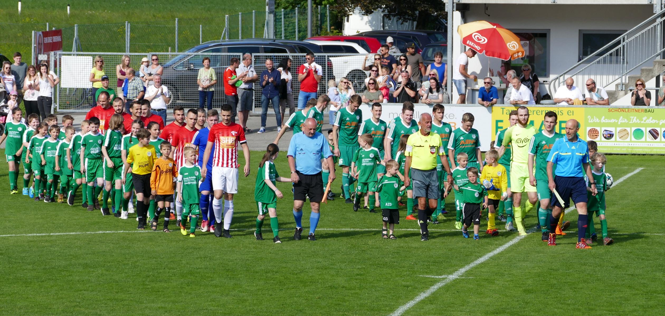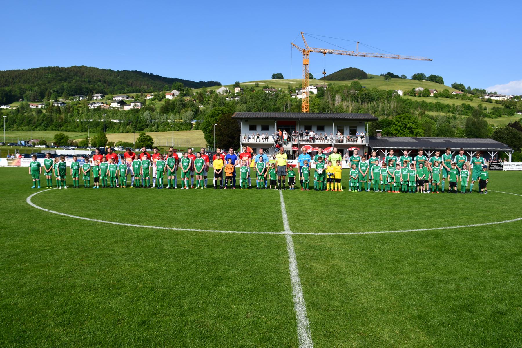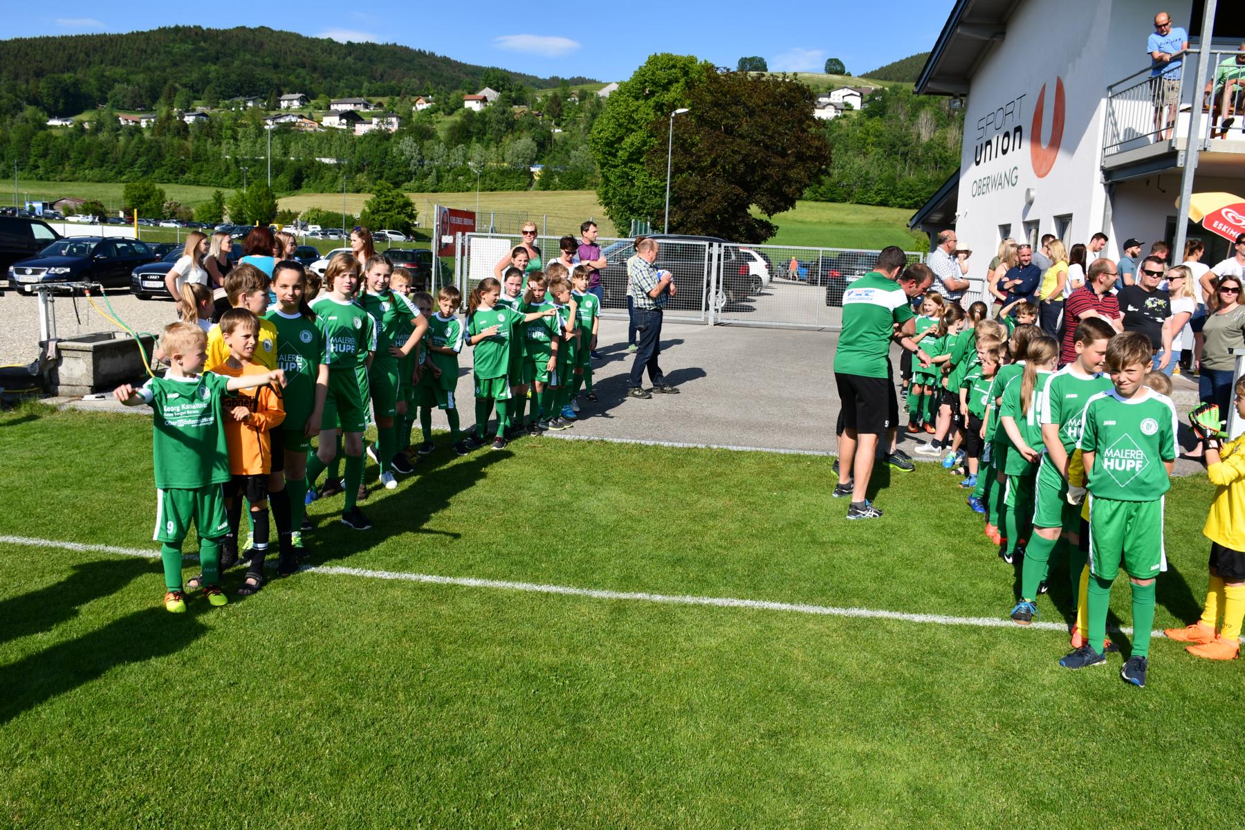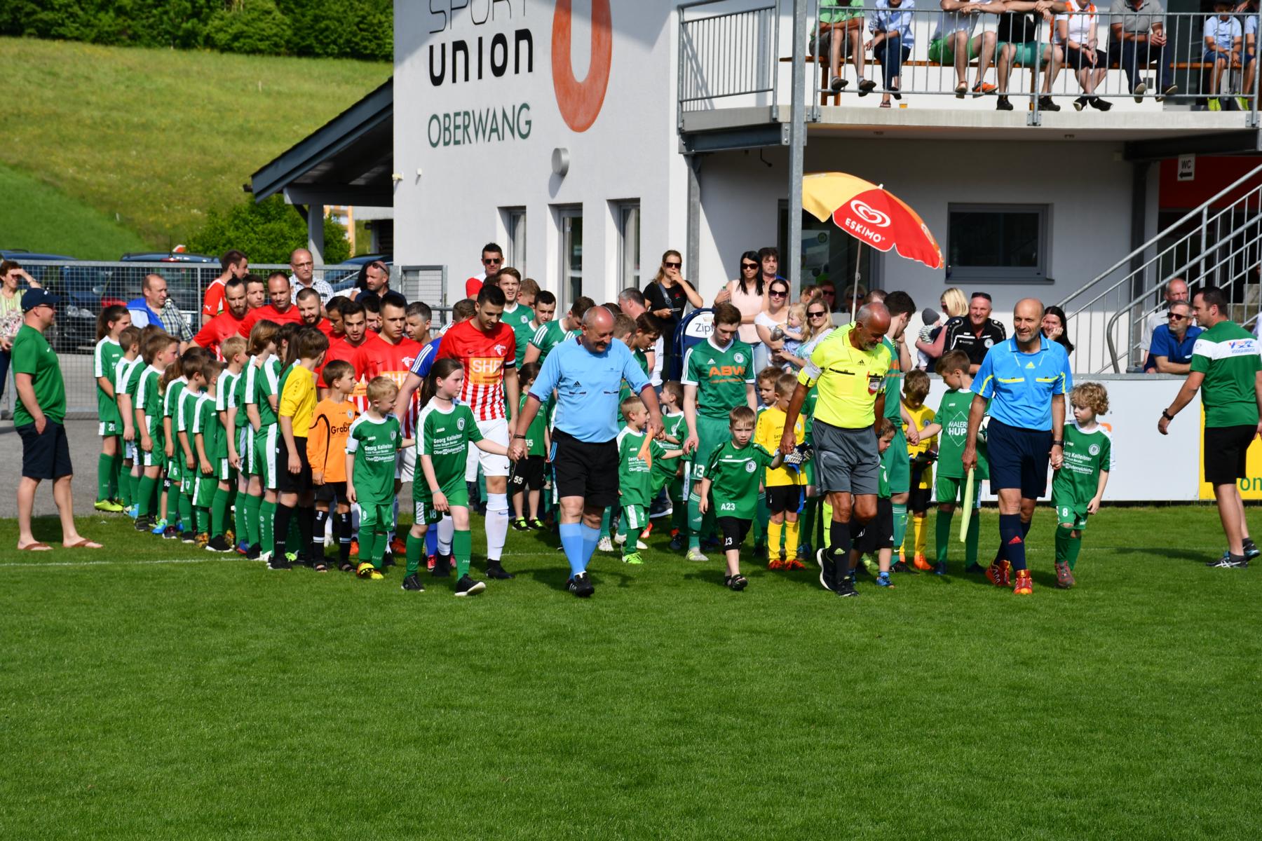 Am Pfingstmontag, beim Spitzenspiel zwischen Union Oberwang gegen Steyrermühl, durften die Mannschaften dann ihre neue Kleidung präsentieren und mit den "Großen" auf das Spielfeld einlaufen.