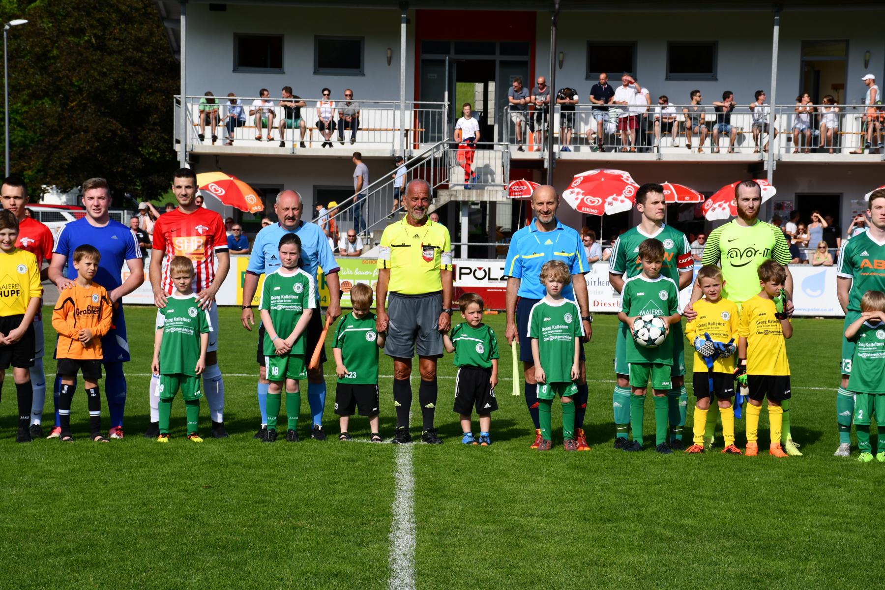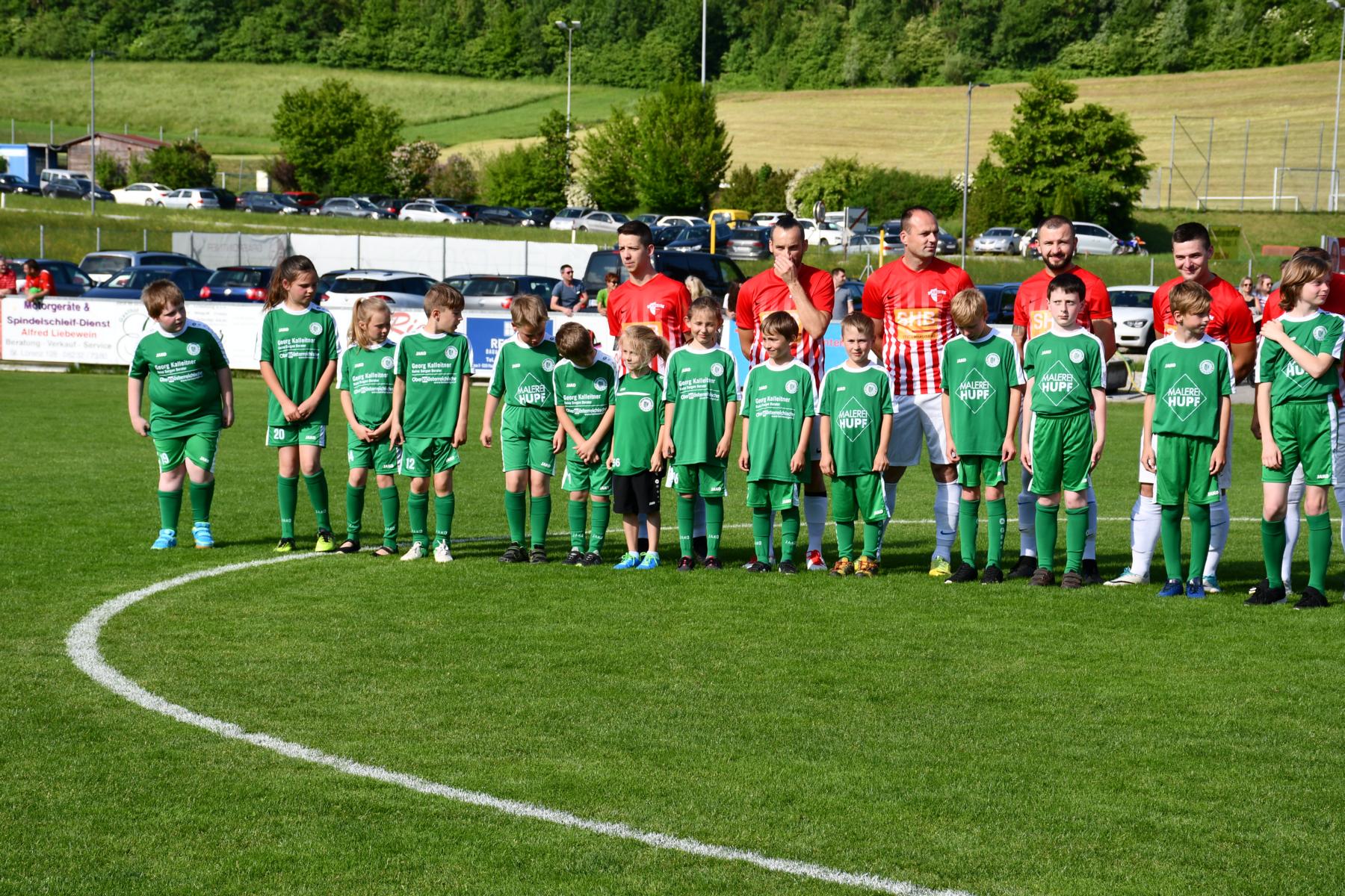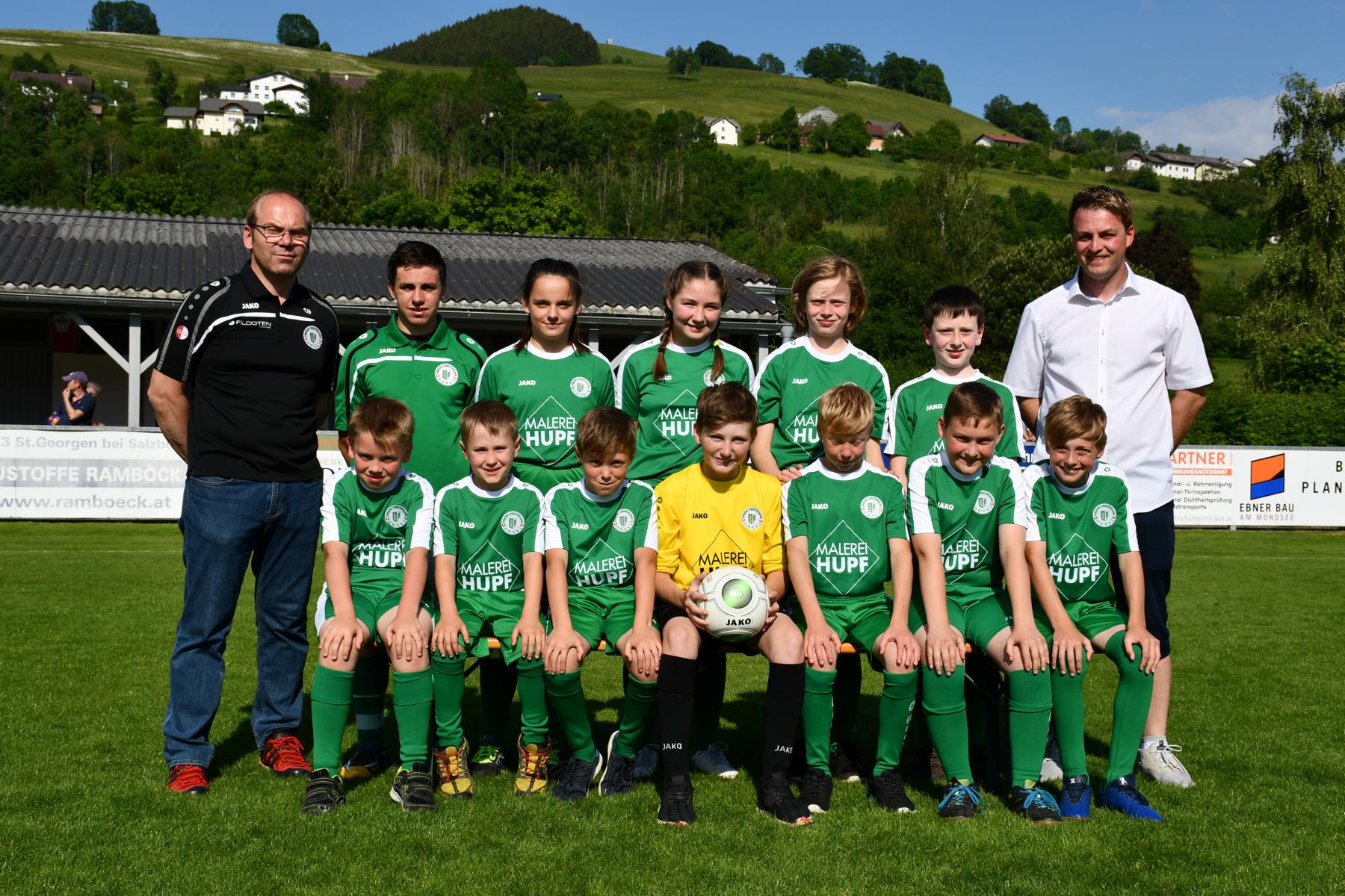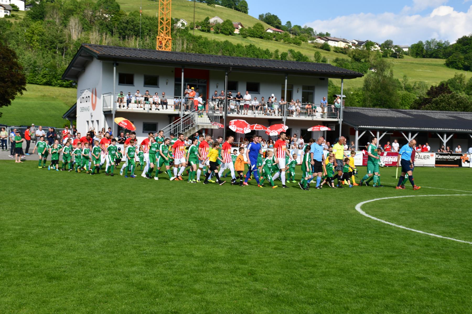 Am Pfingstmontag, beim Spitzenspiel zwischen Union Oberwang gegen Steyrermühl, durften die Mannschaften dann ihre neue Kleidung präsentieren und mit den "Großen" auf das Spielfeld einlaufen.
