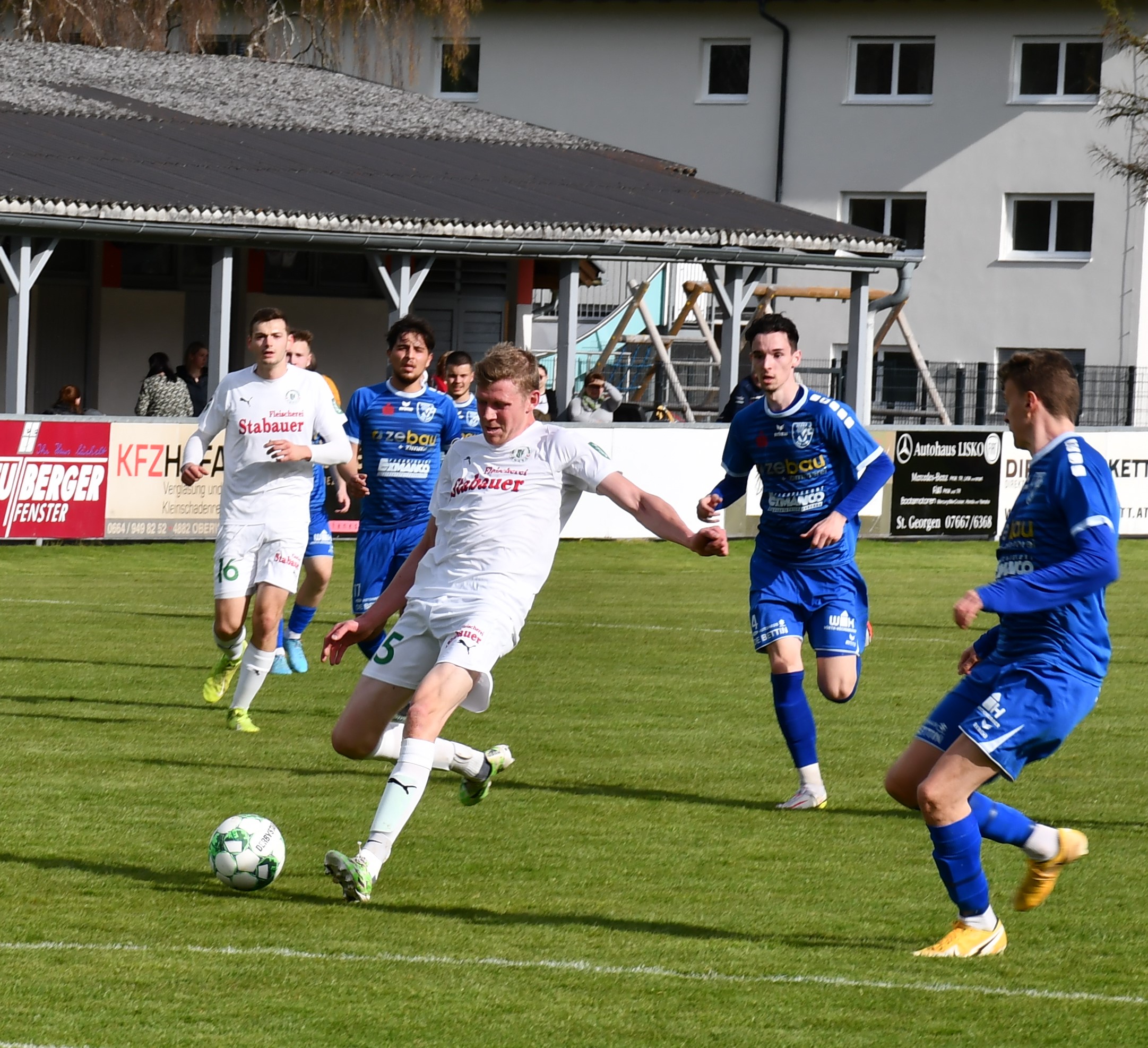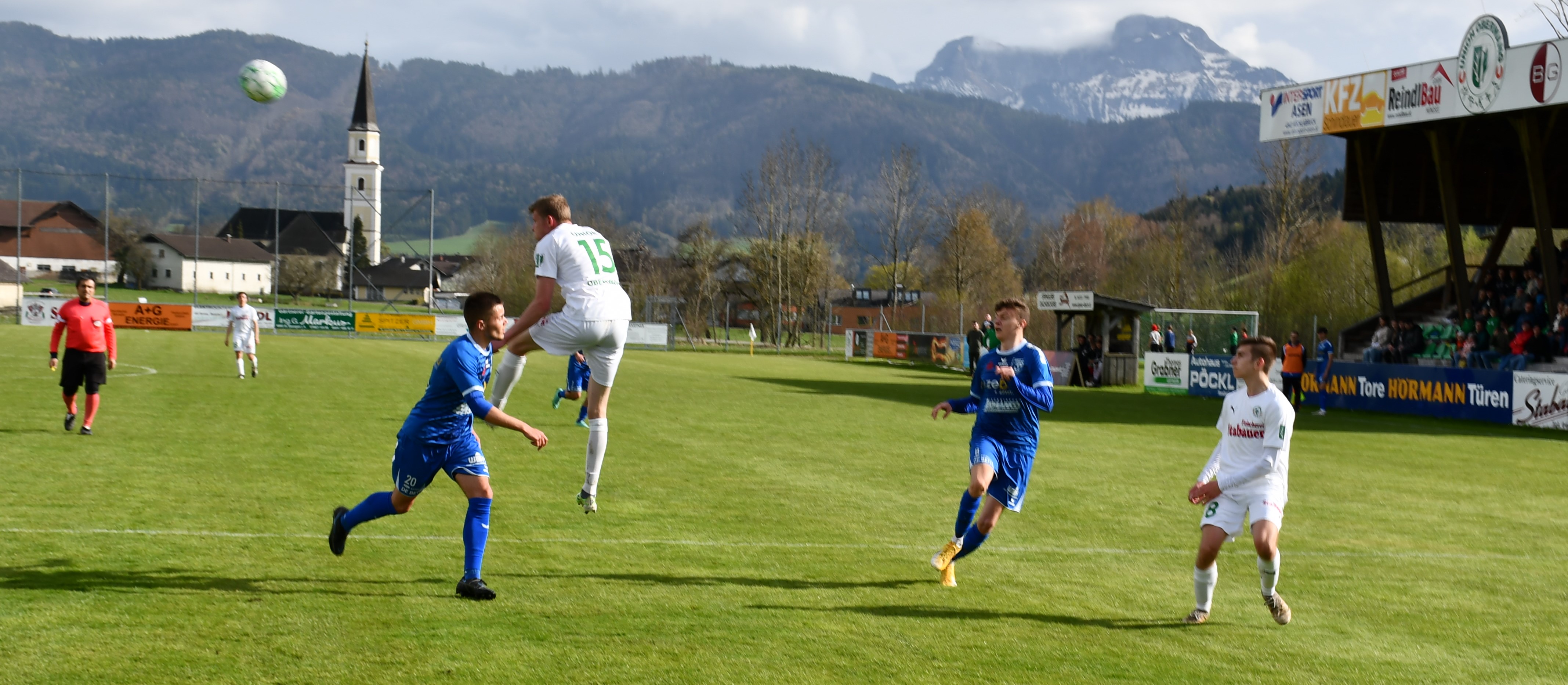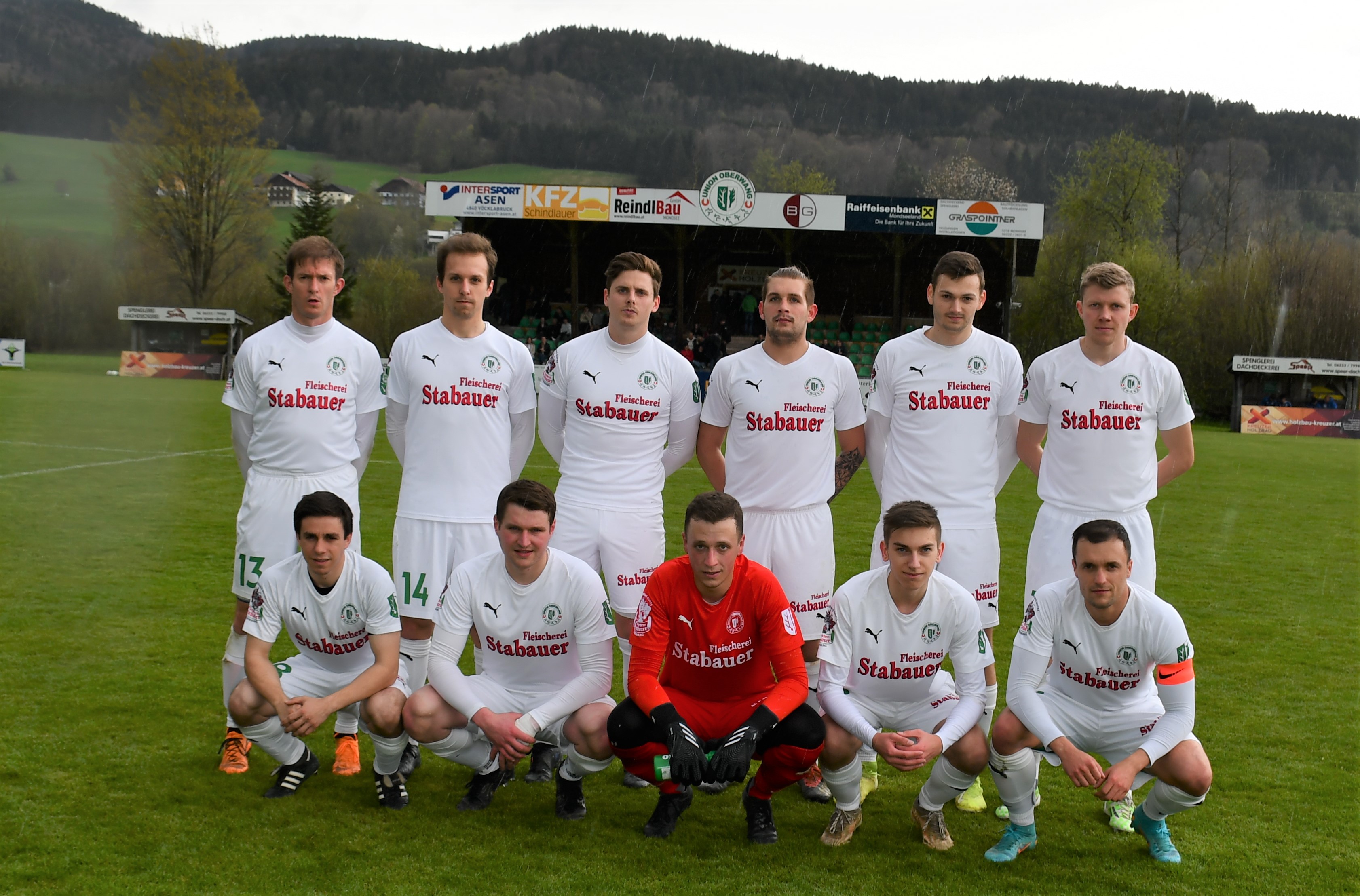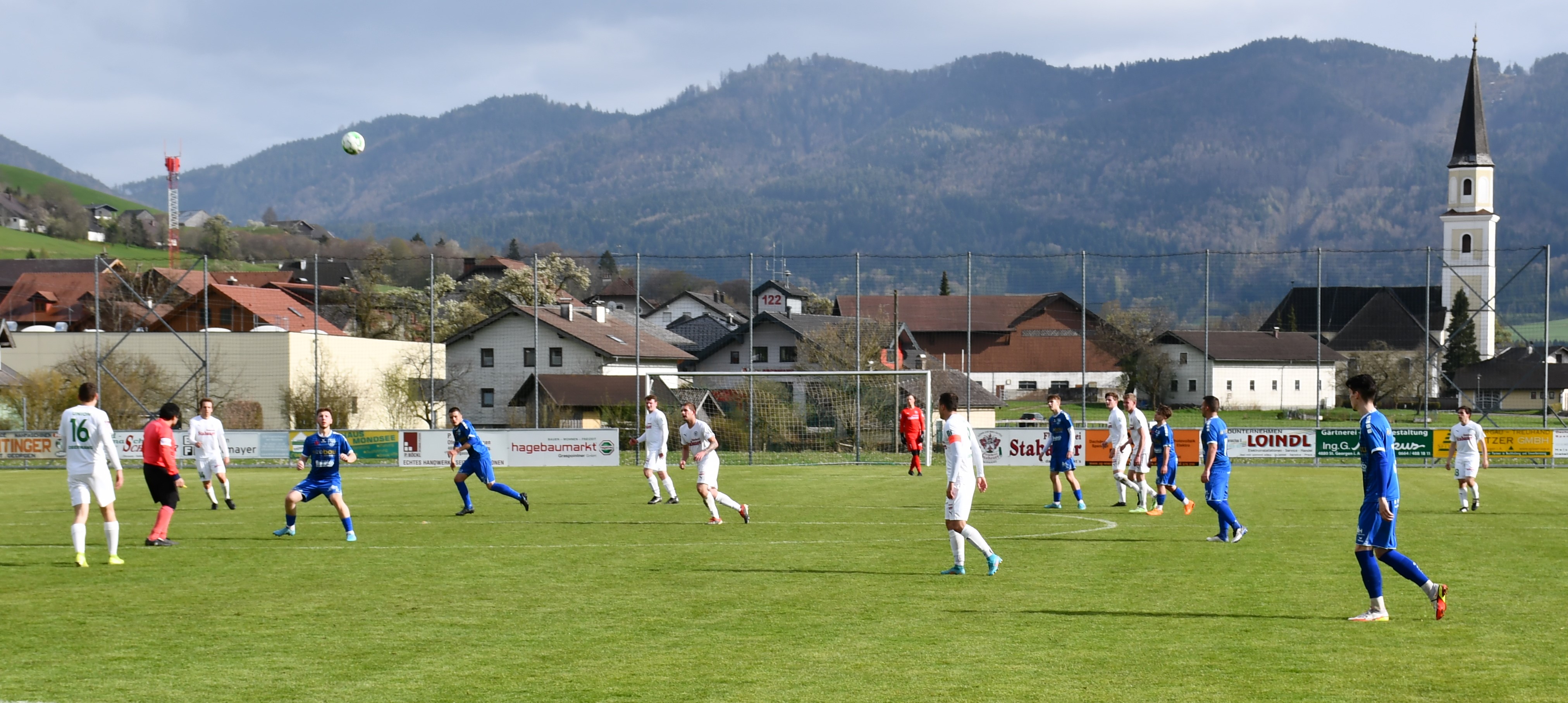 Wie ernst sie dieses Spiel angehen zeigen die Oberwanger ab der ersten Minute. Wenige Sekunden sind auf der Uhr, als Markus Lametschwandtner den ersten Torabschluss sucht, Tormann Kollersberger muss zum ersten Mal parieren. In der 15. Minute feuert Simon Loindl aus spitzem Winkel aufs Ischler Tor, der Torwart kann den Ball nur nach oben abklatschen lassen und ermöglicht so Sandro Sperr den Nachschuss, den er zum 1:0 versenkt. Bad Ischl ist jetzt gefordert und bekommt wenig später einen Freistoß in guter Position. Amer Mekan führt aus, der gut angetragene Schuss geht knapp rechts daneben. (17.) Beim anschließenden Abstoß leiten die Oberwanger den hohen Ball schön weiter auf Robert Speer, der durchläuft und noch auf Simon Loindl querlegt. Dieser muss den Ball nur noch ins leere Tor einschieben und sorgt so für das schnelle 2:0 für die Oberwanger. (18.) Die Heimmannschaft will hier schnell alles klar machen. Der nächste Angriff läuft über Markus Lametschwandtner, der es aus spitzem Winkel selbst probiert, aber zunächst vom Tormann und dann im zweiten Anlauf vom Verteidiger geblockt wird. (21.) Eine Minute später kann Sandro Sperr auf 3:0 stellen, er trifft mit einem traumhaften Schuss vom 16er. Oberwang präsentiert sich in dieser Phase bärenstark und gnadenlos in der Chancenauswertung. Für den nächsten Treffer sorgt dann der Kapitän Robert Speer, der sich im Strafraum den Ball noch einmal auf links legt und dem Gästetormann keine Chance lässt – 4:0. (27.) So mancher Zuschauer hat zu diesem Zeitpunkt das Ergebnis schon auf die volle Spieldauer hochgerechnet, es scheint alles möglich heute. Aber die Oberwanger zeigen sich danach gnädig, Sandro Sperr lässt eine hundertprozentige Chance aufs leere Tor liegen. (30.) In der 39. Minute zieht wieder Markus Lametschwandtner über rechts auf, er setzt den Ball aber knapp am langen Eck vorbei. Nach einer bemerkenswerten ersten Halbzeit führen die Oberwanger klar mit 4:0.