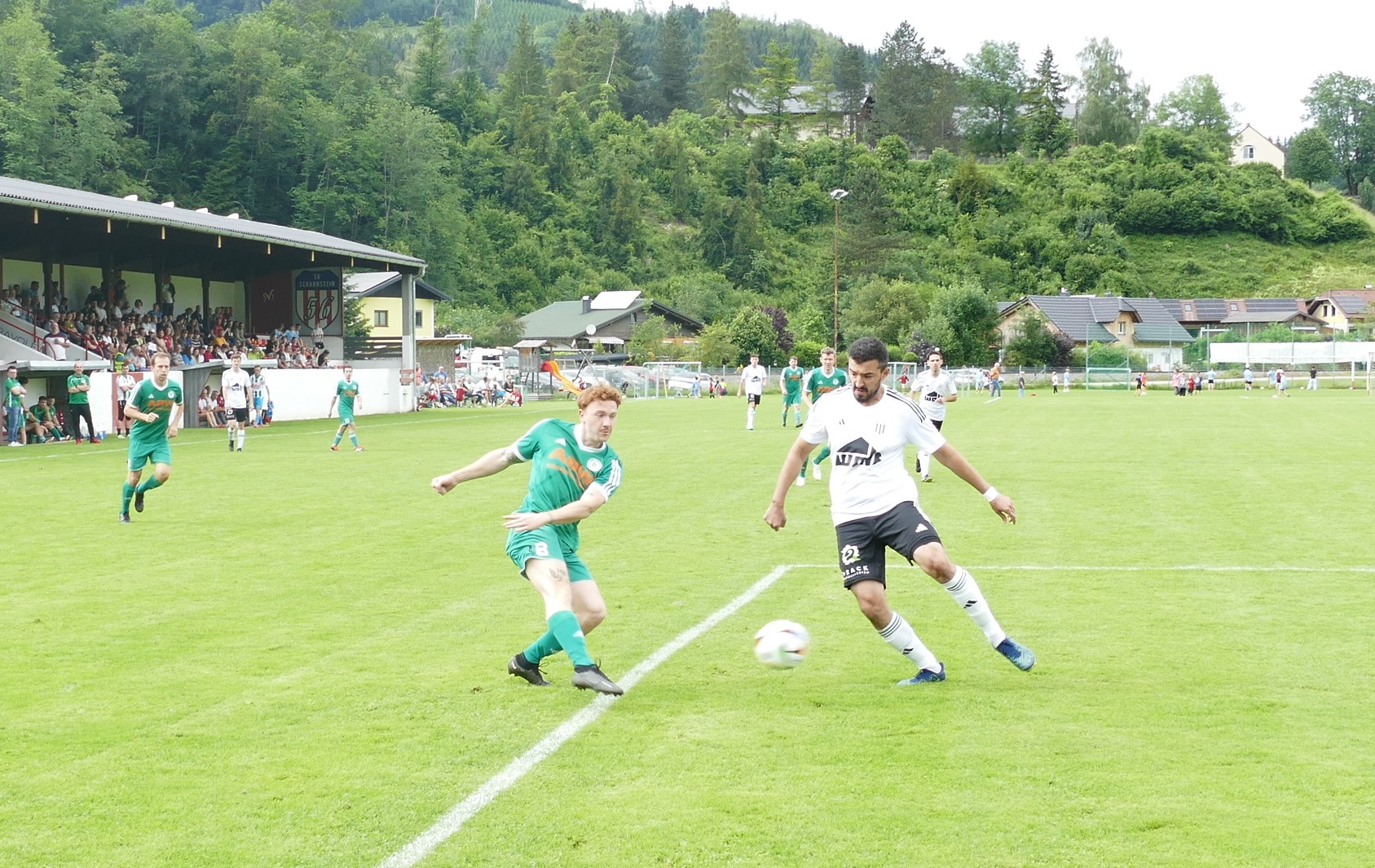 Besser starten jedoch die Hausherren aus Scharnstein in das Spiel. In der fünften Minute kommt Marco Weber aus guter Position zum Abschluss, aber Josef Heisler ist zur Stelle und grätscht gerade noch den Ball weg. Nach 28 Minuten ist es wieder Scharnstein mit einer Torchance, dieses Mal in Person von Max Mahringer, der knapp über das Tor schießt. In der 32. Minute gibt es einen Eckball für die Hausherren, Tristan Nagel kommt am zweiten Pfosten frei zum Abschluss, trifft jedoch den Ball nicht richtig. Auch die letzte Chance vor dem Seitenwechsel gehört Scharnstein, aber Christoph Moser scheitert mit seinem Schuss an einer starken Parade von Christoph Soriat im Oberwanger Tor. Von Seiten der Oberwanger ist in der ersten Halbzeit nichts zu sehen, somit geht es mit einem 0:0 in die Kabine.