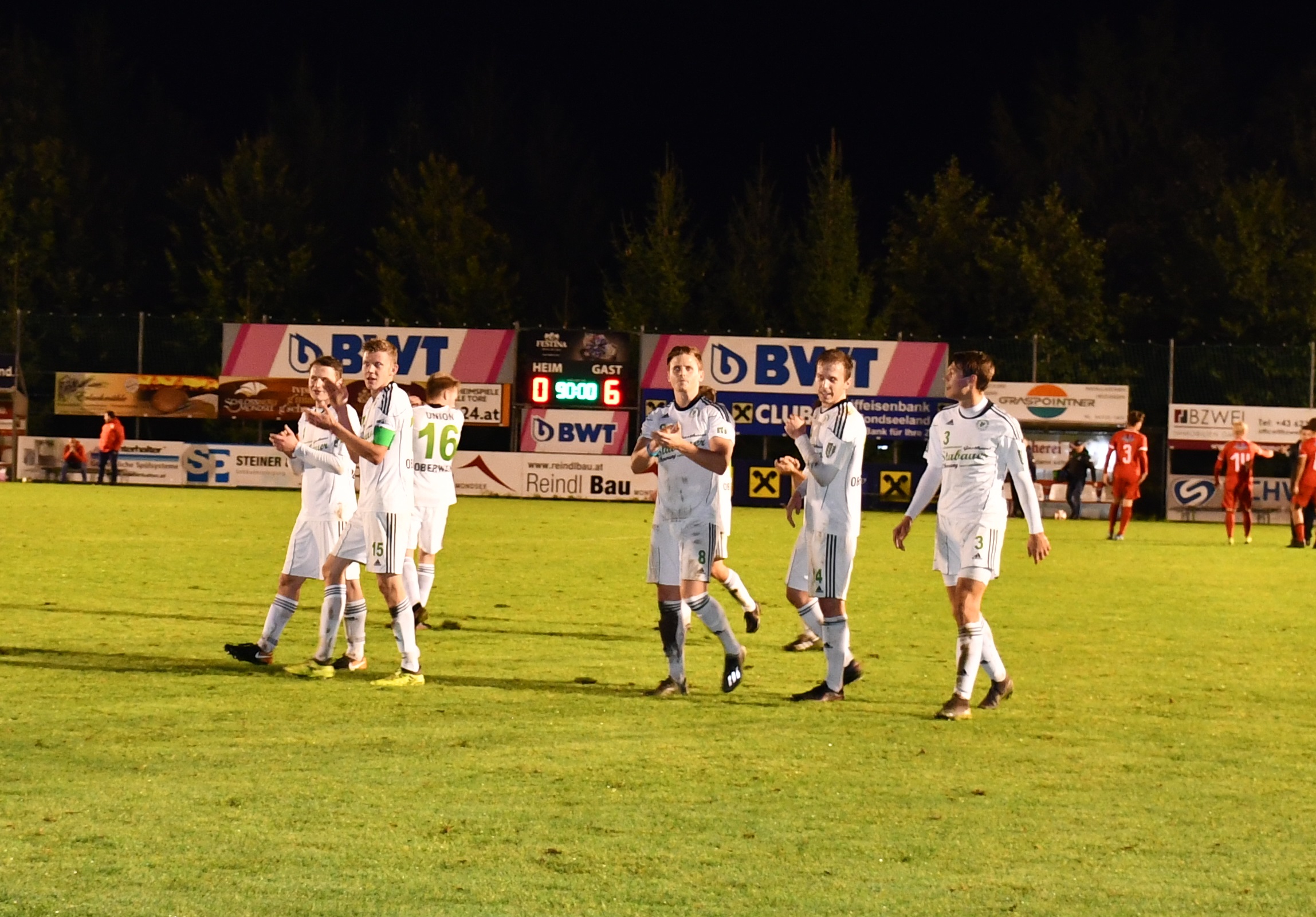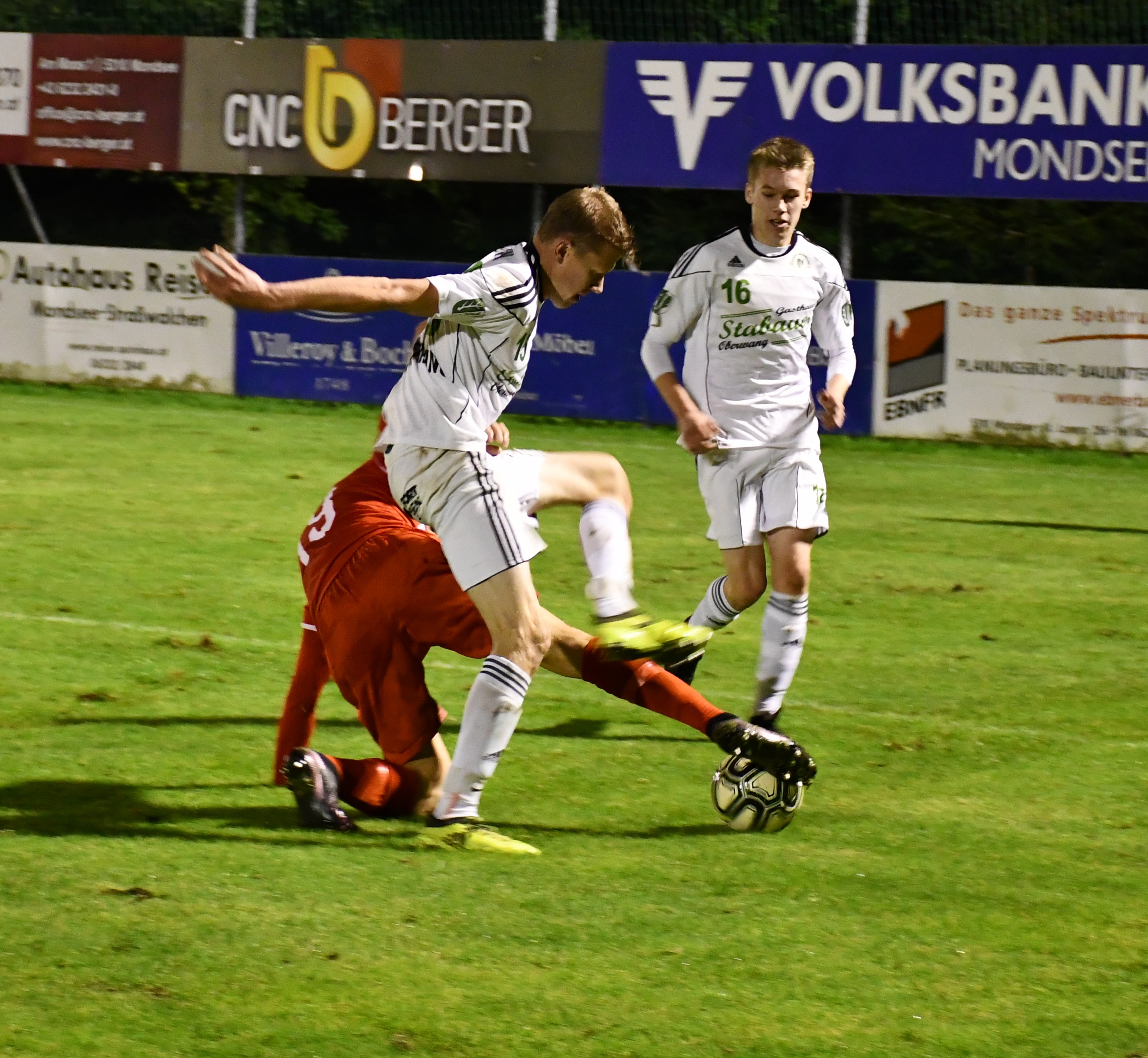 Sechs Minuten sind in Mondsee gespielt, ehe die Oberwanger zum ersten Mal gefährlich im Strafraum auftauchen. Daniel Lettner wird von Simon Loindl bedient, scheitert aber an Tormann Kajba. In der 14. Minute hat Simon Loindl selbst den Treffer auf dem Fuß, aber wieder kann Maurice Kajba seinen Kasten sauber halten. Das Spiel geht nur in eine Richtung, die Oberwanger spielen weiter munter nach vorne und werden in der 23. Minute belohnt. Nach einem hohen Ball über die Abwehr behält Daniel Lettner die Ruhe und trifft ins linke Eck – 1:0. Drei Minuten später kann Fabian Meindl nach einer Maßflanke von Simon Loindl per Kopf nachlegen und erhöht auf 2:0 für Oberwang. Die Gäste liefern eine souveräne Vorstellung ab, bleiben defensiv ganz sicher und können sich offensiv immer wieder schön durchkombinieren. So auch in der 29. Minute. Wieder geht es über Simon Loindl über die linke Seite, sein Zuspiel findet zwar Robert Speer im Zentrum, aber der will noch einmal ablegen statt zu schießen und findet keinen Mitspieler. Dann versucht es Josef Heisler mal aus der Distanz, der Mondseer Tormann klärt den Ball mit einer Flugeinlage zur Ecke. Die Oberwanger versuchen den Gegner früh am Spielaufbau zu hindern, was immer wieder mit einem Ballgewinn in der gegnerischen Hälfte belohnt wird. So ein Ballgewinn führt auch zum 3:0 in der 35. Minute durch Robert Speer, der den Ball in guter Position erobert und mit einem satten Schuss trifft. Nur eine Minute später hätte sich die gleiche Szene nach einem Abspielfehler der Mondseer beinahe wiederholt, aber dieses Mal lässt Robert Speer die Chance aus. In der 38. Minute wäre Daniel Lettner mit einem Gustostückerl beinahe der nächste Treffer geglückt, sein Lupfer über den herauseilenden Torwart landet aber auf dem Tornetz. Man kann als Oberwanger Zuschauer nicht viel am Spiel der Gäste aussetzen, lediglich die Chancenauswertung stellt sich noch als verbesserungswürdig heraus. Robert Speer schrammt in der 41. Minute richtig knapp an seinem zweiten Treffer vorbei, die Innenstange verhindert den Torerfolg. Nach 42 Minuten servieren die Mondseer mit einem haarsträubenden Abspielfehler fast den nächsten Treffer auf dem Silbertablett, aber Tormann Kajba kann mit einer Parade gegen Simon Loindl den Patzer noch ausbügeln. Ein Tor fällt aber dann doch noch vor der Pause. Während die vermeintlich einfacheren Chancen ungenützt geblieben sind schafft es Daniel Lettner aus spitzem Winkel den Ball ins lange Eck zu schlenzen – ein Traumtreffer zum 4:0 Pausenstand. (44.)