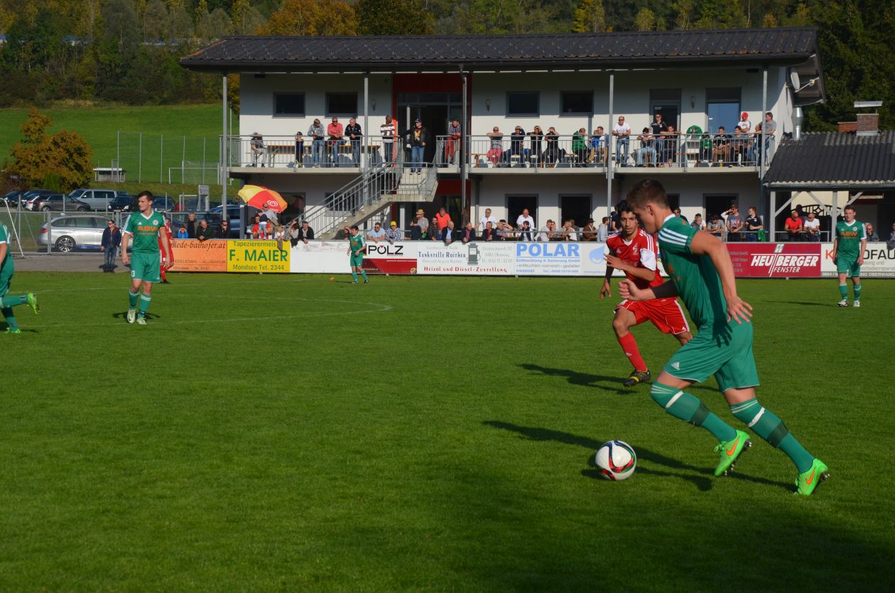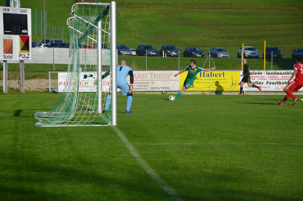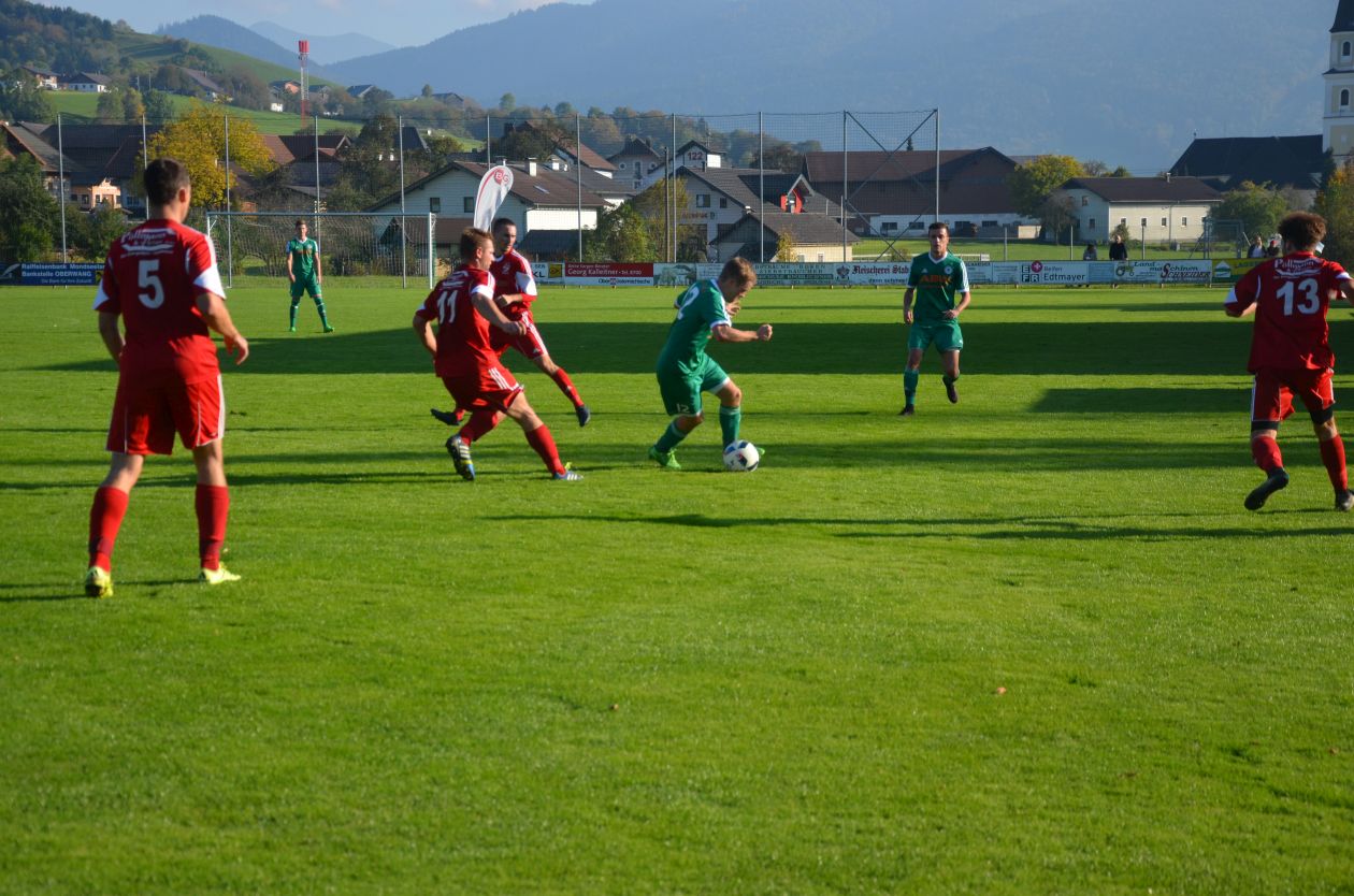 Ein sonniger Herbsttag bietet ideale Rahmenbedingungen für das Derby und die Zuschauer. Beide Mannschaften gehen mit vollem Einsatz ins Spiel, deshalb ist die Anfangsphase noch ein schnelles Auf und Ab. Zell am Moos kommt bereits nach acht Minuten zur ersten Chance. Dragan Miskovic zieht aufs kurze Eck ab, doch Oberwangs Tormann Christoph Soriat demonstriert mit einer guten Parade seine aktuelle Hochform. Die Oberwanger lassen sich nicht lange bitten und werden selbst druckvoller. Eine Flanke von Markus Lametschwandtner, der heute in der Oberwanger Startelf steht, wird gefährlich Richtung Tor abgefälscht, der Ball geht knapp daneben. Beim anschließenden Eckball haben die Zeller Glück, dass Stefan Edtmeier bei einem Kopfball auf der Linie retten kann. Für ein Derby verläuft das Spiel in Folge relativ ruhig, Fouls und Aufreger sind selten. Das Spiel ist recht ausgeglichen, bis die Oberwanger in der 30. Minute zuschlagen. Rene Putz kommt über links, flankt in den Rückraum. Dort ist Markus Lametschwandtner zur Stelle, nimmt den Ball perfekt volley und zimmert ihn ins Eck. Ein Traumtor zur Oberwanger 1:0 Führung und das noch dazu im Derby. Zell am Moos liegt hinten und muss nun versuchen auszugleichen. Dragan Miskovic probiert es nach einer Kombination mit einem Schuss, doch auch der landet in den Armen von Christoph Soriat. Zur Pause können die Oberwanger Zuschauer zufrieden sein, dank einer konzentrierten und effizienten Vorstellung liegt die Heimmannschaft vorne.