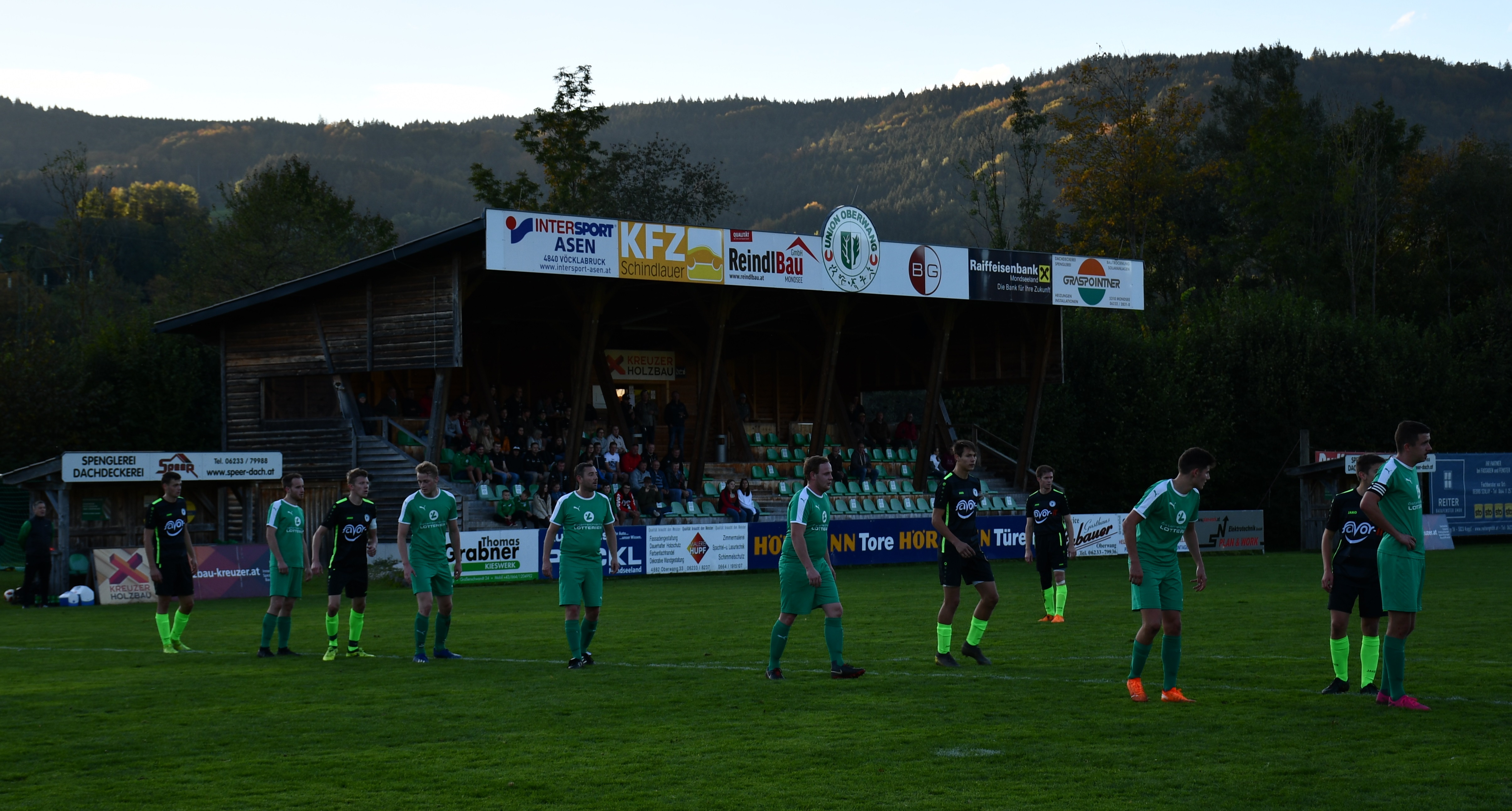 Ohne den Dreh- und Angelpunkt Daniel Lettner tun sich die Oberwanger zu Beginn etwas schwerer, um in Partie zu kommen. Die erste Chance bietet sich aus einem Freistoß, wobei man hier mit Mario Lettner einen Spezialisten hat. Der nimmt sich gleich des ruhenden Balles an, setzt den Ball aber an die Latte. (10.) Drei Minuten später ist es wieder Mario Lettner, der den Ball nach einer Hereingabe übers Tor schießt. Die Grünauer spielen in einer anfangs mäßigen Partie auch ganz gut mit, können aber nicht wirklich viel Gefahr erzeugen. Auf Seiten der Oberwanger ist es wieder Mario Lettner, der in der 36. Minute einen Weitschuss übers Tor setzt. Nach 39 Minuten fällt schließlich der Führungstreffer für Oberwang. Die Heimmannschaft führt einen Freistoß schnell aus, der Ball geht über die Mauer und Simon Loindl findet mit seinem Querpass Andreas Hofauer, der den Ball nur noch einschieben muss – das 1:0. Mit der knappen Führung geht es auch in die Pause.