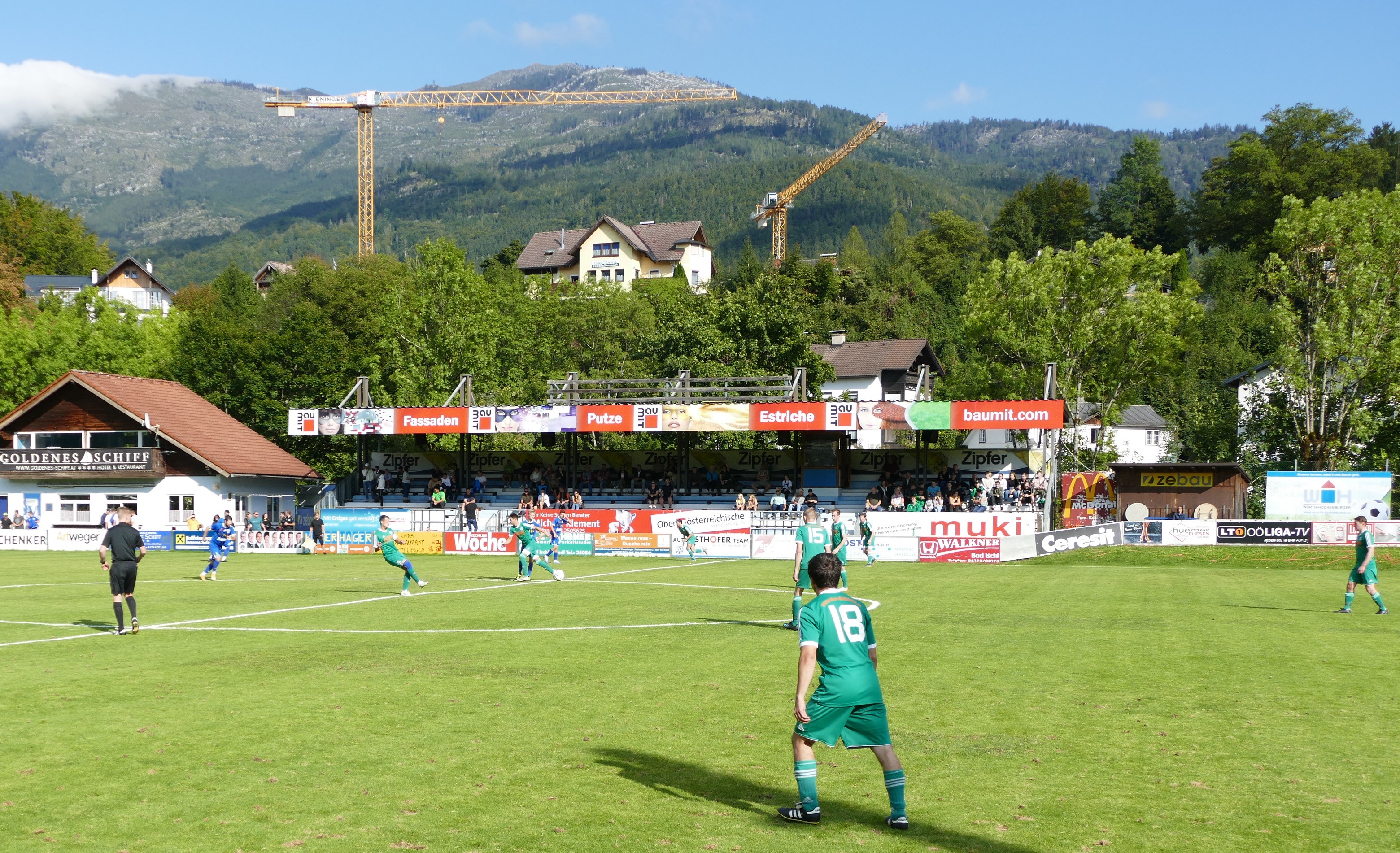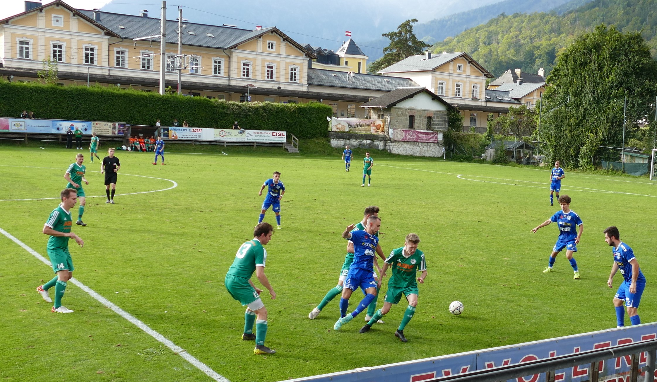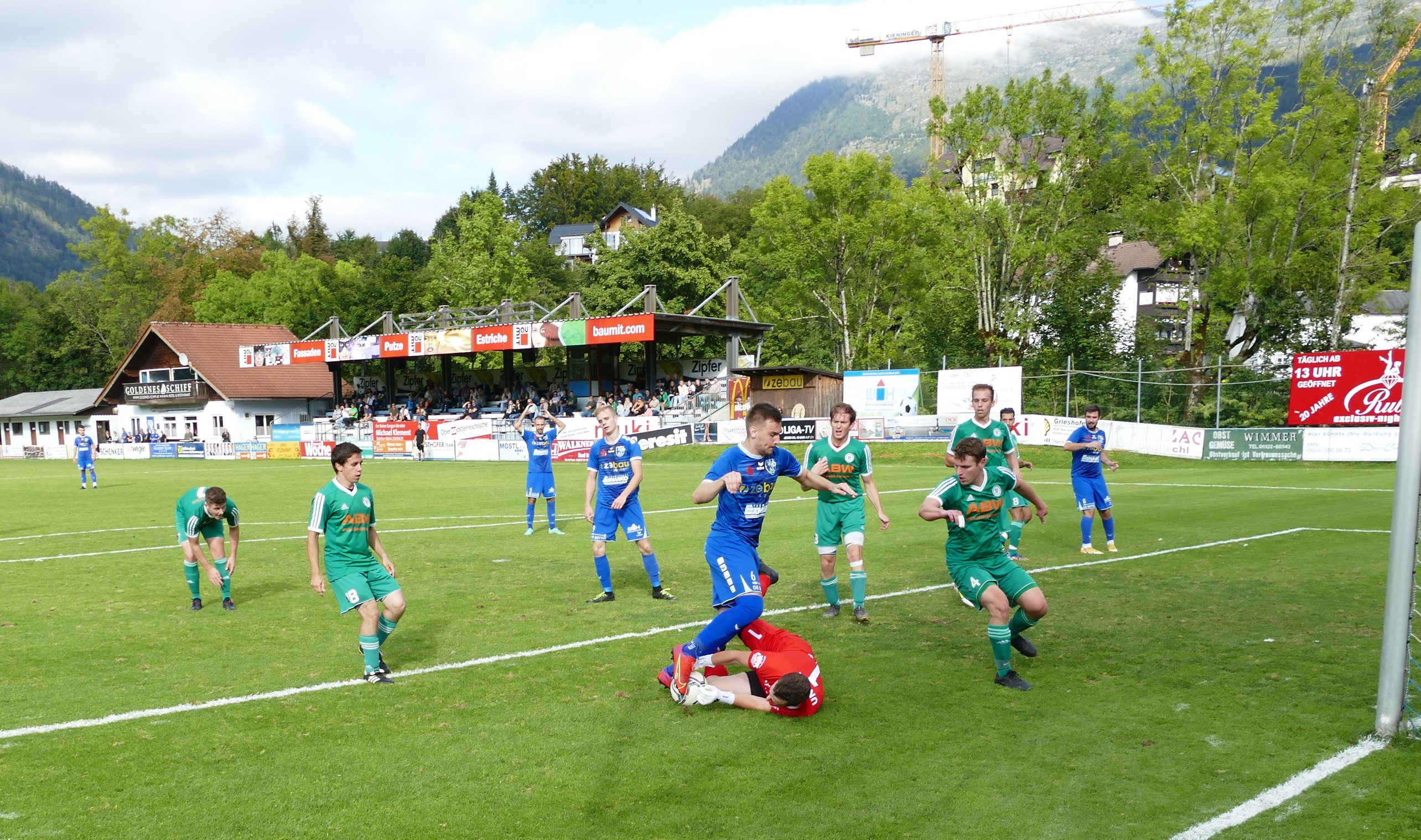 Bei spätsommerlichen Temperaturen in Bad Ischl passiert zunächst auf beiden Seiten wenig, ein Heber von Christoph König über das Tor ist die einzige Torannäherung (3.) Es dauert bis zur 21. Minute, als der Ischler Tormann Stefan Nöhmer einen Ball außerhalb des Strafraums nicht bändigen kann, Christoph König dazwischen geht und vom Torhüter gelegt wird. Den dafür verhängten Elfmeter verwandelt Robert Speer sicher zum 1:0 für Oberwang. Die Heimmannschaft ist nun gefordert, mehr wie ein Schuss von Besart Ahemti über das Tor schaut aber zunächst nicht heraus. (29.) Kurz vor der Pause hat Robert Speer noch eine gute Schusschance, setzt den Abschluss aber links neben das Tor. (43.) Überschattet wird die erste Hälfte von den verletzungsbedingten Auswechslungen von Adel Khalili bei den Oberwangern und Karlo Samardzic bei Bad Ischl.