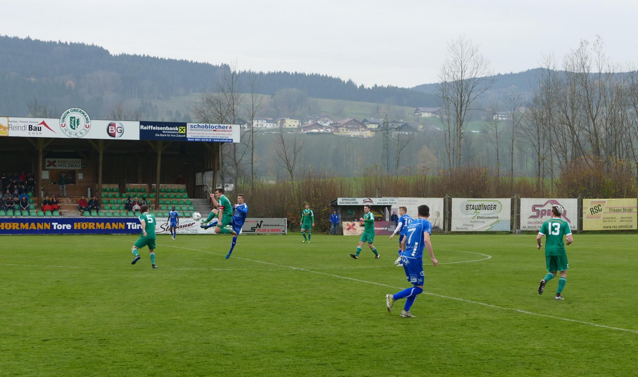 Die Oberwanger haben die letzte Niederlage scheinbar sehr gut verdaut, sie sind von Anfang an gut in der Partie. Bereits in der vierten Minute flankt Florian Trinker auf Robert Speer, der aus der Drehung abzieht und das lange Eck nur knapp verfehlt. Zwei Minuten später sind wieder die beiden Spieler Protagonisten eines Oberwanger Angriffs. Diesmal bedient Robert Speer Florian Trinker in der Mitte, der behauptet den Ball und schließt unhaltbar für Tormann Cubrelji zum 1:0 ab. Das frühe Tor gibt zusätzliche Sicherheit im Spiel, Oberwang hat alles im Griff. Die Gäste aus Gmunden geben in der 9. Minute den ersten Schuss ab, Marco Schiffer schießt aus guter Position klar drüber. In der 11. Minute verpasst Florian Trinker seinen zweiten Treffer nur knapp. Bernhard Asen spielt einen hohen Ball genau in den Lauf, aber Tormann Cubrelji klärt mit einer guten Parade den Schuss. Oberwang schaltet nach einer starken Anfangsphase einen Gang zurück. Zwar ist man offensiv in der ersten Hälfte nicht mehr so präsent, aber aufgrund der gewohnt sicheren Defensive hat man kein Problem, den Vorsprung bis zur Pause zu verwalten.