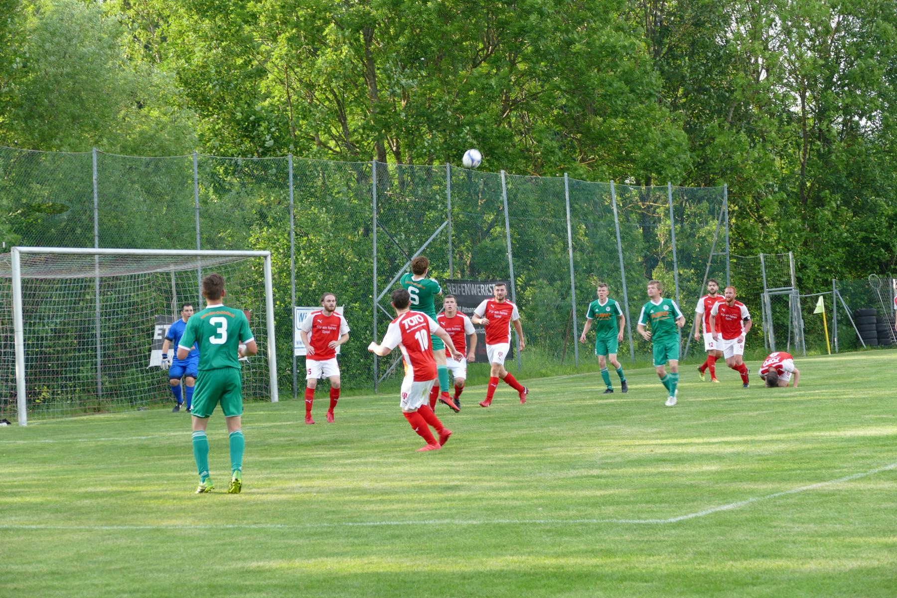 Die Auracher haben zu Beginn mehr vom Spiel und können auch ein paar Torschüsse auf das Oberwanger Tor abgeben, sonderlich gefährlich werden sie aber noch nicht. Die Oberwanger brauchen etwas, um in die Partie zu kommen. In der 10. Minute gibt es den ersten gefährlichen Angriff der Oberwanger. Andreas Hofauer nimmt sich ein Herz und zieht ab, der Ball senkt sich optimal und geht ans Lattenkreuz, da haben nur wenige Zentimeter gefehlt. Es sollte allerdings die einzige gute Torchance der Oberwanger in Hälfte Eins bleiben, die in der Offensive ungewohnt wenig Druck erzeugen können. Hinten lassen sie aber auch nicht viele Chancen von Aurach zu. In der 31. Minute kommt Markus Schobesberger nach einem verunglückten Befreiungsschlag der Oberwanger zum Schuss, aber Tormann Marco Plank ist schnell am Boden und hält. Zwei Minuten später gibt es Freistoß für Aurach. Simon Kofler verlängert die Freistoßflanke per Kopf unhaltbar ins Eck – das 1:0 für Aurach. Bis zur Pause passiert auf beiden Seiten nicht mehr viel.