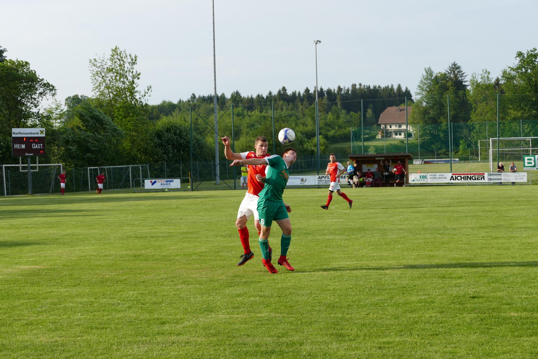 Die Auracher haben zu Beginn mehr vom Spiel und können auch ein paar Torschüsse auf das Oberwanger Tor abgeben, sonderlich gefährlich werden sie aber noch nicht. Die Oberwanger brauchen etwas, um in die Partie zu kommen. In der 10. Minute gibt es den ersten gefährlichen Angriff der Oberwanger. Andreas Hofauer nimmt sich ein Herz und zieht ab, der Ball senkt sich optimal und geht ans Lattenkreuz, da haben nur wenige Zentimeter gefehlt. Es sollte allerdings die einzige gute Torchance der Oberwanger in Hälfte Eins bleiben, die in der Offensive ungewohnt wenig Druck erzeugen können. Hinten lassen sie aber auch nicht viele Chancen von Aurach zu. In der 31. Minute kommt Markus Schobesberger nach einem verunglückten Befreiungsschlag der Oberwanger zum Schuss, aber Tormann Marco Plank ist schnell am Boden und hält. Zwei Minuten später gibt es Freistoß für Aurach. Simon Kofler verlängert die Freistoßflanke per Kopf unhaltbar ins Eck – das 1:0 für Aurach. Bis zur Pause passiert auf beiden Seiten nicht mehr viel.