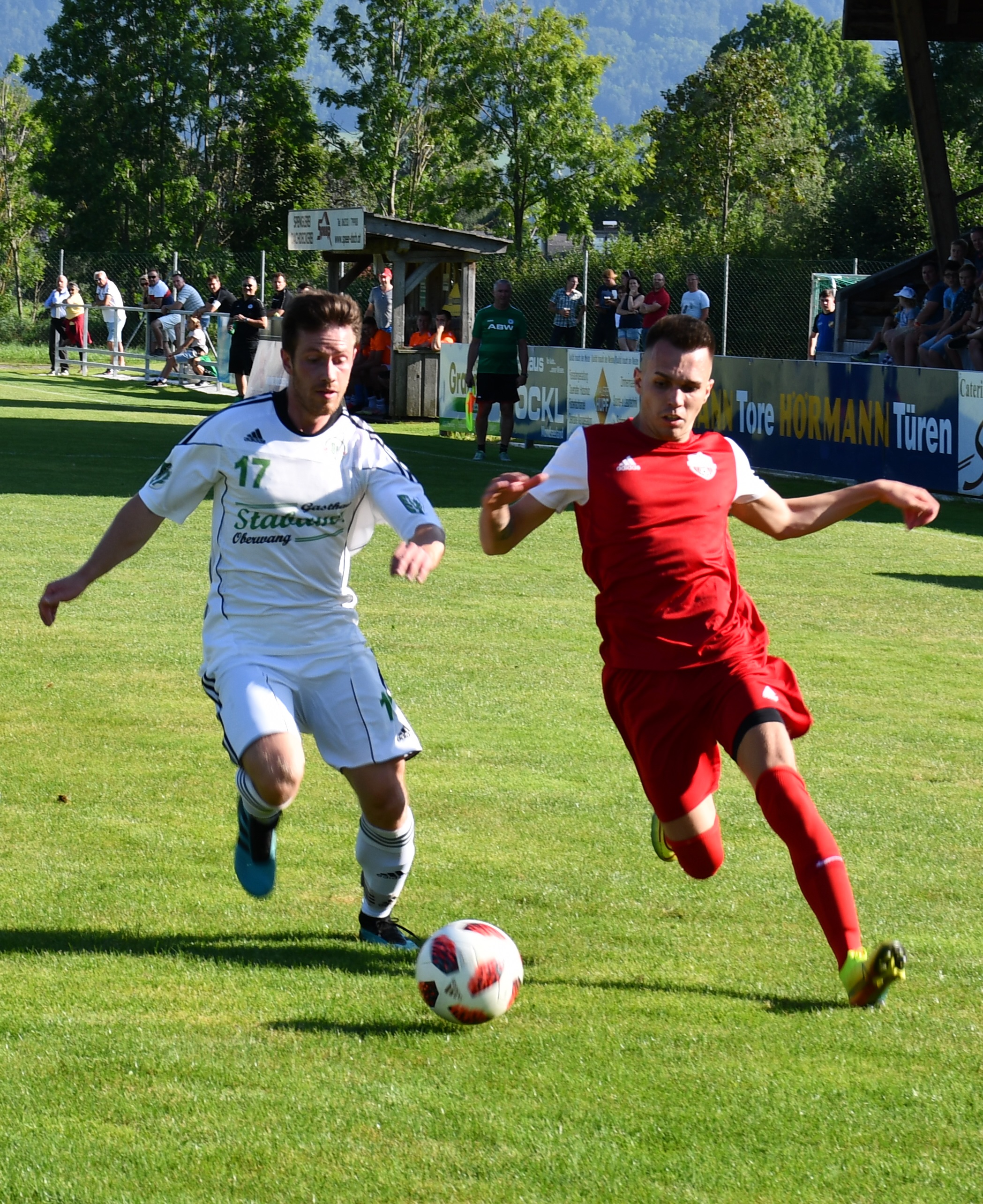 Im ersten Spiel der Oberwanger unter Trainer Stefan Riedl brauchen beide Mannschaften etwas, um ins Spiel zu kommen. Pinsdorf nutzt in Minute 11 einen Freistoß aus guter Position, um in Person von Kapitän Viktor Hoffmann auf 1:0 zu stellen. Der Ball geht über die Mauer genau ins Eck, nichts zu halten für David Röthleitner im Oberwanger Tor. Danach ist das Spiel eher ausgeglichen mit Halbchancen auf beiden Seiten. In der 31. Minute folgt eine Szene, die dem Spiel eine entscheidende Richtung geben sollte. Der Pinsdorfer Adnan Agic sieht nach einem Foulspiel an Markus Lametschwandtner Gelb/Rot, damit müssen die Gäste 60 Minuten in Unterzahl spielen. Nach 33 Minuten versucht sich Emirhan Acar mit einem Weitschuss, der Ball geht aber über das Tor. Auf der Gegenseite kommt Mathias Schmidt nach einer Ecke zum Kopfball, setzt diesen aber knapp daneben. (37.) In der 40. Minute fällt der verdiente Ausgleich für die Oberwanger. Daniel Lettner steckt ideal durch auf Robert Speer und der bezwingt Pinsdorfs Keeper Feichtinger zum 1:1. Mit diesem Ergebnis geht es auch in die Kabine.