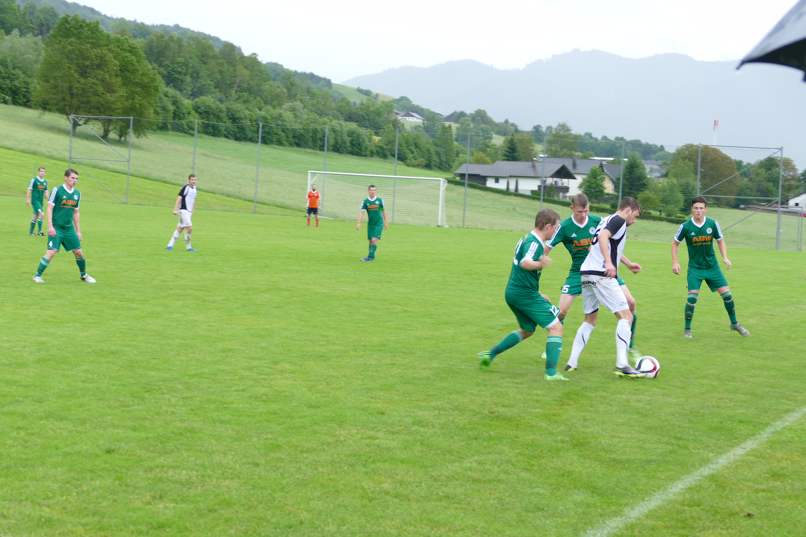 Von beiden Mannschaften war kein Feuerwerk zu erwarten, Oberwang ist seit 10 Spielen sieglos, auch Altmünster hat die letzten drei Spiele verloren. Doch es sollte eine unterhaltsame Partie werden. Altmünster macht in der zweiten Minute den Anfang, ein Kopfball von Dominik Mühlbacher streift am langen Eck vorbei. Oberwang ist aber ebenfalls gut im Spiel und zeigt sich im Gegensatz zum Spiel in Kammer stark verbessert. Nach einer Flanke in den Strafraum kommt Mathias Schmidt angestürmt und hämmert den Ball unter die Latte. Das 1:0 für Oberwang in der 17. Minute. Oberwang legt sofort nach. Nur drei Minuten später kommt Andreas Hofauer über die rechte Flanke, bedient mustergültig Rene Putz und der schiebt aus kurzer Distanz ein. Bereits nach 20 Minuten führt Oberwang mit 2:0 und sie spielen konzentriert weiter. Sie lassen sich auch nicht vom einsetzenden Starkregen beirren und haben die Altmünsterer gut im Griff. Lediglich in der 40. Minute werden die Gäste noch einmal gefährlich in der ersten Hälfte. Nach einer Kombination über links kommt Florian Schiffbänker aus guter Position zum Abschluss, doch sein Schuss geht drüber. Eine gute Halbzeit der Oberwanger wird mit einer 2:0 Pausenführung belohnt.