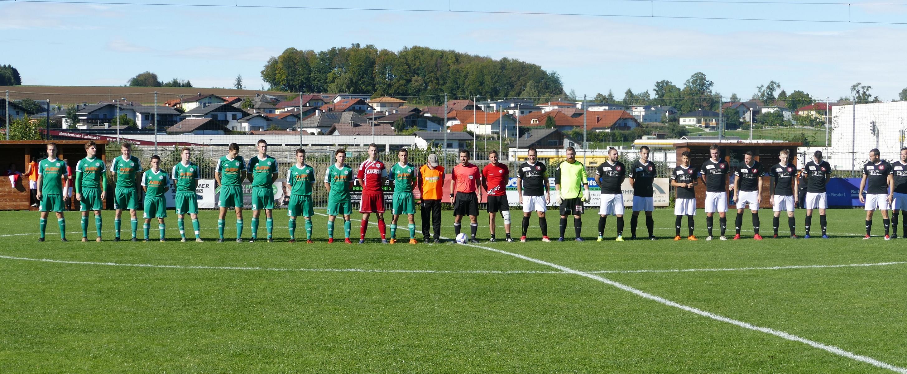 Die bisher noch punktelosen Pinsdorfer zeigen von Beginn an, dass sie nicht nur Punktelieferant sind. Gerade einmal zwei Minuten sind gespielt, als nach einem Eckball ein Volleyschuss von Pinsdorf knapp über das Tor geht. In der 6. Minute gibt es Freistoß für Oberwang. Die Flanke kommt gut in den Strafraum und Mathias Schmidt köpfelt zum 1:0 ein. Drei Minuten später müssen die Pinsdorfer bei einem Kopfball auf der Linie klären, beim anschließenden Eckball setzt Mathias Schmidt seinen Schuss knapp neben das Tor. Die Heimmannschaft kann aber durchaus mithalten. Najibollah Jamal kommt nach einer Flanke zum Kopfball, setzt diesen aber an die Stange. (18.) In der 25. Minute pariert Pinsdorfs Tormann Philip Holzleithner einen gut angetragenen Freistoß von Jonas Wonnebauer, der Nachschuss von Andreas Hofauer wird abgeblockt. Auch Oberwangs Tormann David Röthleitner kann sich auszeichnen, er kommt gegen Vitomir Makivic gut aus dem Tor und hält seinen Schuss. (26.) Mit Fortdauer der Partie hat Oberwang zunehmend mehr Spielanteile, von Pinsdorf ist nach der ausgeglichenen Anfangsphase immer weniger zu sehen. Andreas Hofauer bedient Robert Speer mit einem hohen Ball in die Spitze, aber dessen Schuss wird eine Beute für den Pinsdorfer Tormann. (34.) Der zweite Oberwanger Treffer entsteht schließlich aus einer Einzelaktion. Marco Szalay, der schon öfters mit tollen Solos geglänzt hatte, zieht von halbrechts bis in den Strafraum und verwandelt sehenswert ins lange Eck – 2:0. (43.) Das ist auch der Pausenstand.