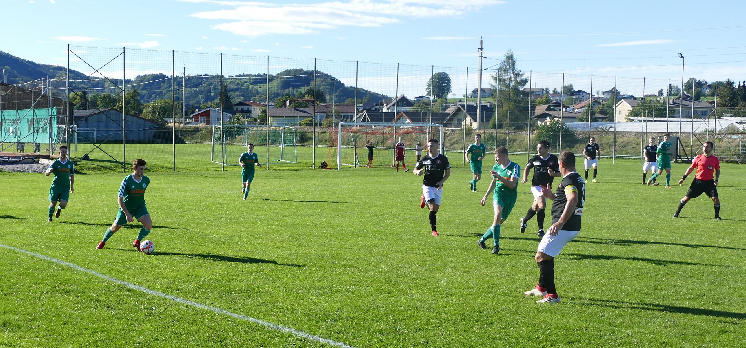 Die bisher noch punktelosen Pinsdorfer zeigen von Beginn an, dass sie nicht nur Punktelieferant sind. Gerade einmal zwei Minuten sind gespielt, als nach einem Eckball ein Volleyschuss von Pinsdorf knapp über das Tor geht. In der 6. Minute gibt es Freistoß für Oberwang. Die Flanke kommt gut in den Strafraum und Mathias Schmidt köpfelt zum 1:0 ein. Drei Minuten später müssen die Pinsdorfer bei einem Kopfball auf der Linie klären, beim anschließenden Eckball setzt Mathias Schmidt seinen Schuss knapp neben das Tor. Die Heimmannschaft kann aber durchaus mithalten. Najibollah Jamal kommt nach einer Flanke zum Kopfball, setzt diesen aber an die Stange. (18.) In der 25. Minute pariert Pinsdorfs Tormann Philip Holzleithner einen gut angetragenen Freistoß von Jonas Wonnebauer, der Nachschuss von Andreas Hofauer wird abgeblockt. Auch Oberwangs Tormann David Röthleitner kann sich auszeichnen, er kommt gegen Vitomir Makivic gut aus dem Tor und hält seinen Schuss. (26.) Mit Fortdauer der Partie hat Oberwang zunehmend mehr Spielanteile, von Pinsdorf ist nach der ausgeglichenen Anfangsphase immer weniger zu sehen. Andreas Hofauer bedient Robert Speer mit einem hohen Ball in die Spitze, aber dessen Schuss wird eine Beute für den Pinsdorfer Tormann. (34.) Der zweite Oberwanger Treffer entsteht schließlich aus einer Einzelaktion. Marco Szalay, der schon öfters mit tollen Solos geglänzt hatte, zieht von halbrechts bis in den Strafraum und verwandelt sehenswert ins lange Eck – 2:0. (43.) Das ist auch der Pausenstand.