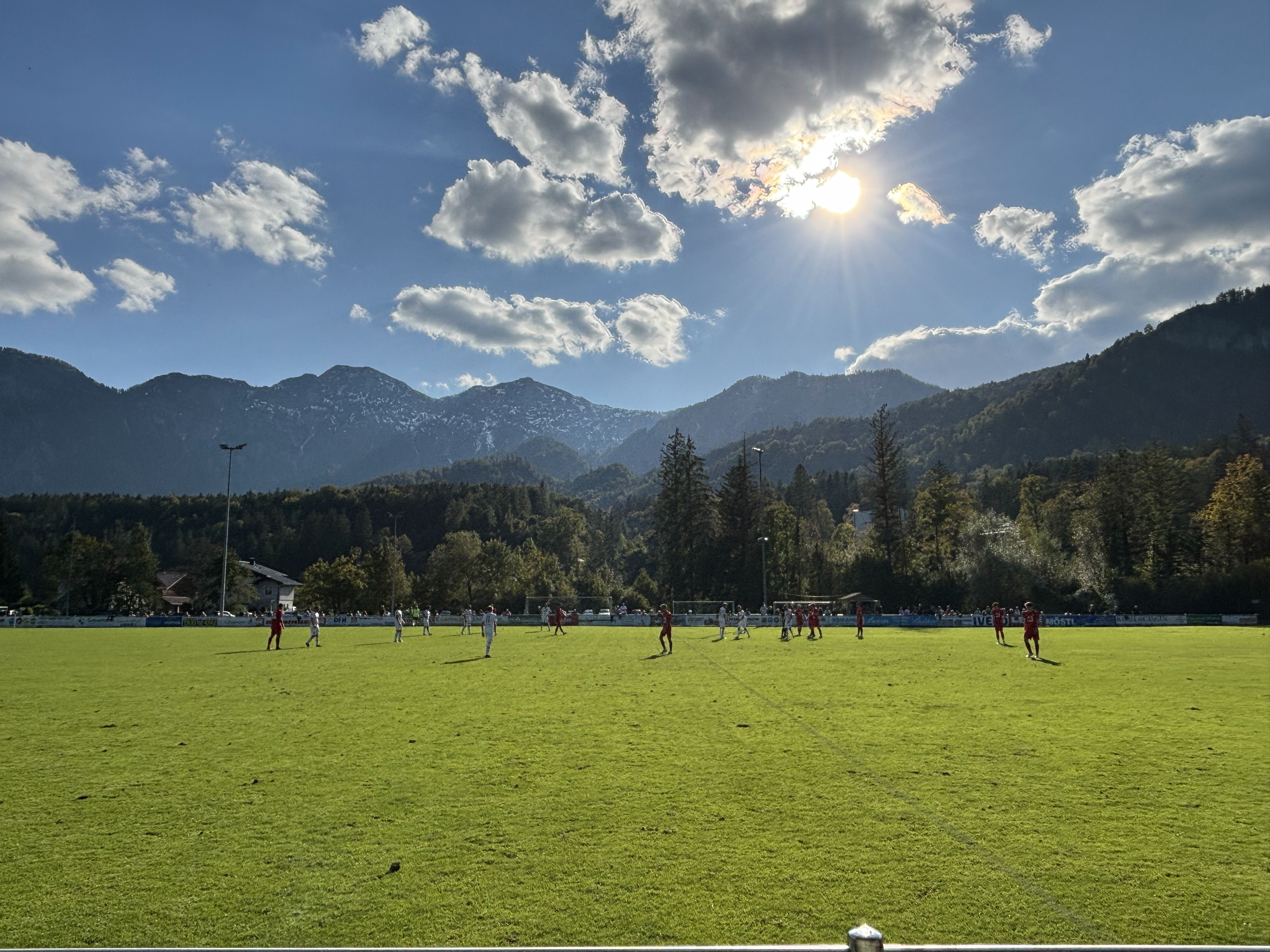 Wie schwierig die Aufgabe wird bekommen die Gäste gleich einmal am Anfang zu spüren. Bereits in der 3. Minute muss Oberwang-Tormann Christoph Soriat einen Schuss von Marijan Blazevic parieren. Die Heimmannschaft dominiert die Anfangsphase und drückt die Oberwanger in die eigene Hälfte. Nach neun Minuten versucht es wieder Marijan Blazevic mit einem Schuss, dieser geht von der Stange an die Latte und zurück ins Feld. Wieder kommt Blazevic an den Ball und legt auf für Justin Engleitner, der den Ball nur noch in das leere Tor schieben muss – 1:0 für Bad Goisern. Nur eine Minute nach dem Führungstreffer hämmert Oliver Pinter den Ball an die Latte. Die Oberwanger sind mit dem knappen Rückstand noch gut bedient, aber im Fußball kann es mitunter schnell gehen, dass sich das Blatt wendet. Sandro Sperr fasst sich in der 16. Minute ein Herz und probiert es mit einem Weitschuss, der prompt im Tor von Bad Goisern einschlägt. Ein Treffer, den Torwart Christoph Unterberger auf seine Kappe nehmen muss. Die Oberwanger nehmen das Geschenk zum 1:1 gerne an und sind ab diesem Zeitpunkt besser im Spiel. In der 24. Minute schlägt Simon Loindl eine Flanke in den Strafraum, aber Niklas Sperr bringt den Schuss von der zweiten Stange nicht mehr aufs Tor. Im direkten Gegenzug schießt wieder der übliche Verdächtige von Bad Goisern, Marijan Blazevic, trifft aber erneut nur die Stange. (25.) In der 28. Minute kommt er aber dann zu seinem Treffer, er bezwingt Christoph Soriat per Freistoß und stellt auf 2:1 für Bad Goisern. Damjan Pilipovic hat in der 37. Minute die Gelegenheit, den Vorsprung auszubauen. Nach einem Eckball scheitert er jedoch mit seinem Kopfball an Christoph Soriat. Das sollte sich rächen, denn wenig später schlagen wieder die Oberwanger zu. In der 40. Minute scheitert zunächst Niklas Sperr am Tormann, aber Robert Speer ist beim Abstauber zur Stelle und stellt auf 2:2. Damit ist aber immer noch nicht Schluss in der ersten Hälfte. Christoph Soriat muss sich noch einmal gegen Justin Engleitner auszeichnen (42.), ehe es unentschieden in die Kabine geht.