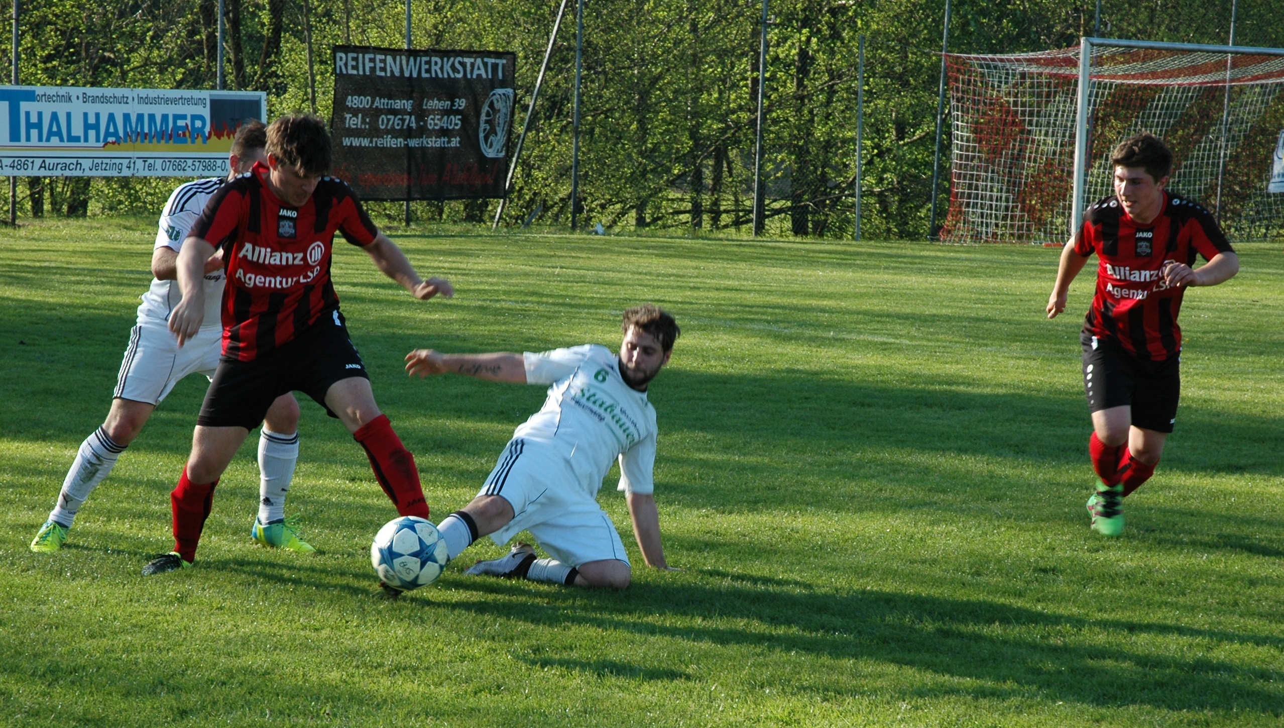 Die Oberwanger konnten in der letzten Runde mit dem Remis im Derby gegen Attergau ein Erfolgserlebnis feiern und wollen nun in Aurach nachlegen. Beide Mannschaften starten etwas verhalten, die erste Chance können die Gäste aus Oberwang verzeichnen. Bei einer Flanke steigt Innenverteidiger Josef Speer zum Kopfball hoch, doch ein Verteidiger von Aurach kann noch auf der Linie klären. Aurach braucht etwas, um erstmals gefährlich zu werden. In der 19. Minute bekommen die Hausherren einen Freistoß in zentraler Position zugesprochen und probieren eine Variante aus. Philipp Peter Huemer spielt tief auf Christian Berndorfer und der legt ideal quer zu Alex Riedl, der den Ball ins lange Eck schlenzt – 1:0 für Aurach. Auch nach der Führung plätschert das Spiel so dahin, beide Mannschaften haben mit dem starken Wind so ihre Probleme. David Übleis setzt in der 35. Minute einen Kopfball neben das Oberwanger Tor. Knapp vor der Pause hat Aurach die beste Chance für das 2:0: Frantisek Bambule erläuft einen hohen Ball, dribbelt bis vors Tor, aber schiebt den Ball knapp am langen Eck vorbei. Aurach führt zur Pause mit 1:0.