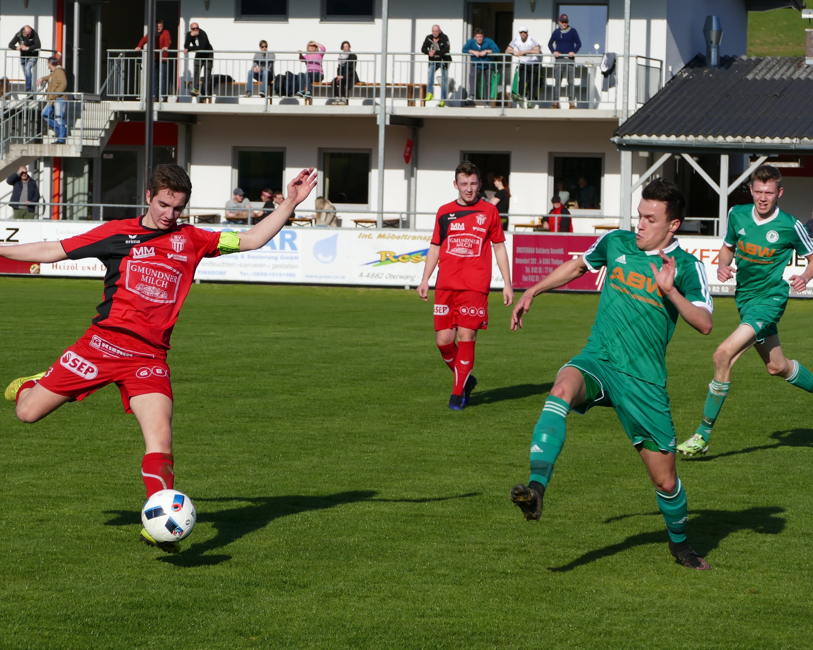 Die drei Punkte müssen aber auch gegen den zweiten Anzug von Gmunden erst einmal eingefahren werden. Die Oberwanger starten engagiert in die Partie. Bereits in der zweiten Minute zieht Stefan Wienerroither aus der Distanz ab, der Ball senkt sich tückisch und fällt noch auf die Latte. Eine Minute später gibt es Freistoß von der rechten Seite für Oberwang. Andreas Hofauer probiert es mit einer flachen Freistoßvariante und findet damit auch Mario Lettner, doch dessen Schuss aufs kurze Eck kann von Torwart Lukas Kitzmüller pariert werden. Nach der starken Anfangsphase ist Oberwang weiterhin die aktivere Mannschaft, von Gmunden 1b ist nichts zu sehen. Die Oberwanger fahren Angriff um Angriff, aber so mancher letzte Pass findet sein Ziel noch nicht. Eine ganz gute Möglichkeit verzeichnet Robert Speer, er verzieht per Kopf nach Flanke von Markus Lametschwandtner knapp. Die Heimmannschaft versucht einiges, aber noch kann Gmunden den Rückstand verhindern. So auch in der 33. Minute, als der umtriebige Markus Lametschwandtner von der Seite kommt und einfach mal selbst aufs kurze Eck schießt, aber wieder der Torhüter das Eck zumacht. Kurz vor der Pause fällt dann aber der vermeintliche Führungstreffer. Gmundens Torwart Kitzmüller lässt einen Schuss nach vorne abprallen, Andreas Hofauer ist zur Stelle und staubt ab, doch der Schiedsrichter entscheidet auf Abseits. Viele Zuschauer fühlten sich nach dieser Szene an das gestrige Länderspiel Österreichs gegen Moldawien erinnert, das exakt denselben Spielverlauf genommen hatte. Viele Chancen vergeben, trotz drückender Überlegenheit keine Führung und kurz vor der Pause ein Tor, das wegen Abseits nicht gegeben wurde.