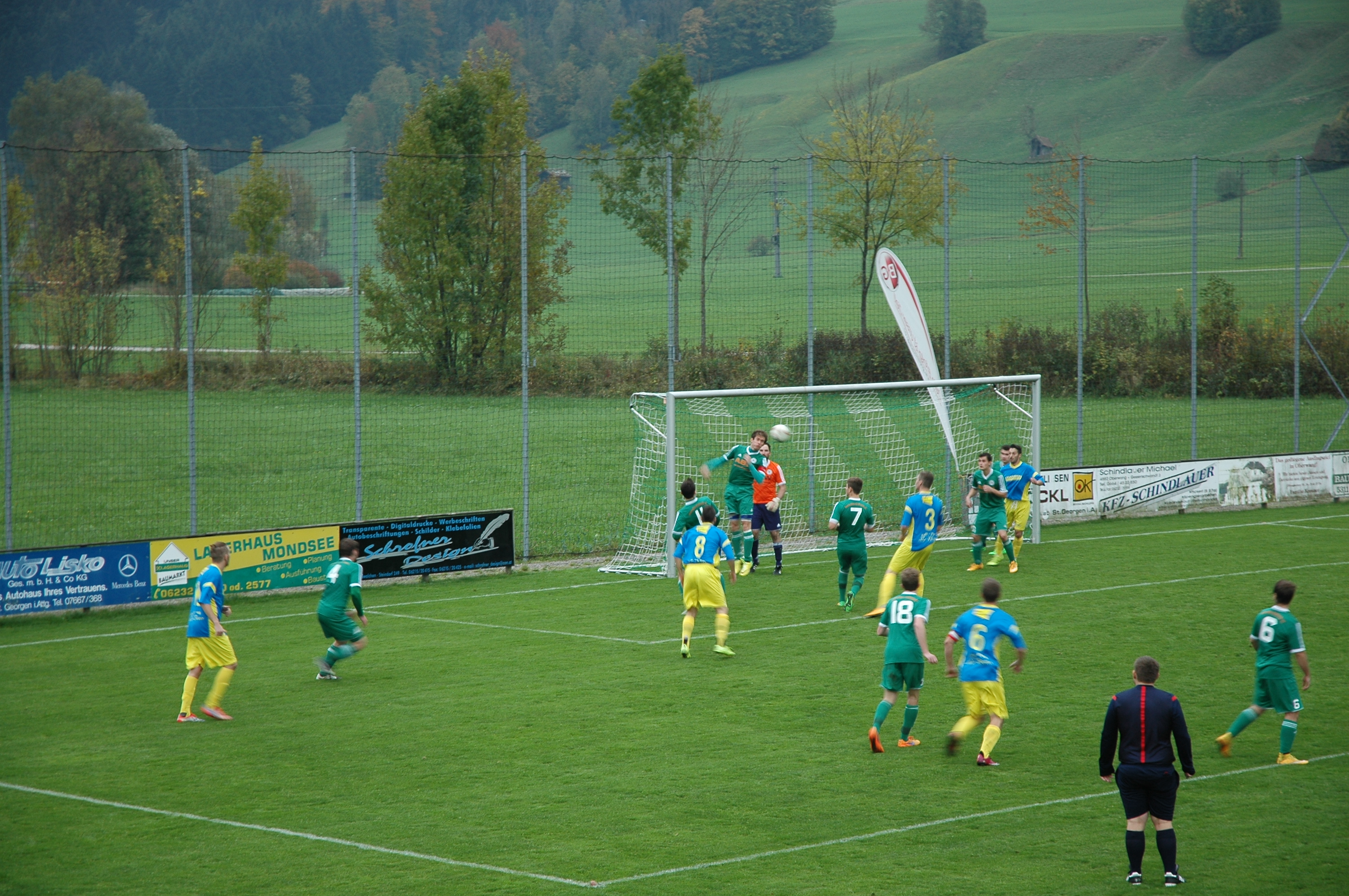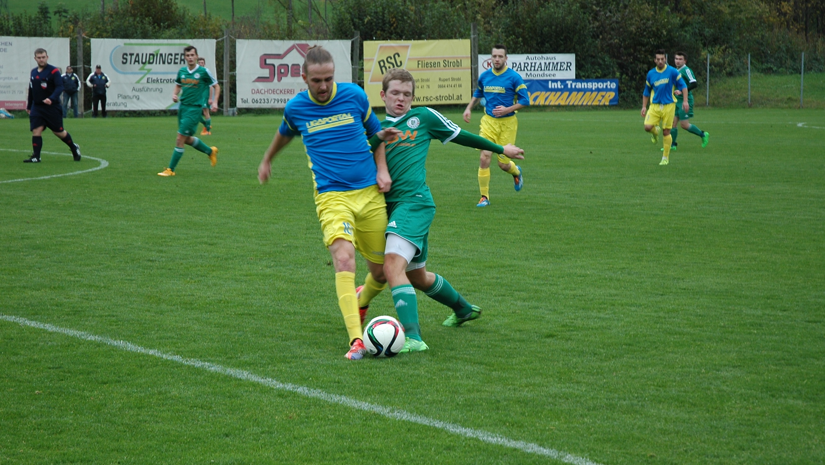 Das Spiel beginnt auch diesmal sehr unterhaltsam, beide Mannschaften spielen offensiv nach vorne. Bereits nach sechs Minuten muss Tormann Alexander Breitenthaler einen Freistoß von Maros Grom aus dem Eck fischen. Wenig später kommt Oberwang erstmals gefährlich vors Tor. Ein Schuss von Rene Putz wird zunächst noch geblockt, der Nachschuss von Markus Soriat geht knapp rechts daneben. Danach übernimmt Gosau das Spiel und bringt mit schnellen Dribblings die Oberwanger Verteidigung unter Druck. Alexander Breitenthaler muss zwei Mal gegen Miroslav Grom retten (15.), Fabian Novac scheitert ebenso alleine vor Breitenthaler (16.) und drei Minuten später schießt er freistehend aus wenigen Metern drüber. Oberwang also bis dahin im Glück, doch in der 22. Minute fällt der Gegentreffer, der sich schon abgezeichnet hat. Nach einem weiten Einwurf wird der Ball per Kopf verlängert und Fabian Novac staubt zur 1:0 Führung ab. Oberwang versucht sogleich, den Ausgleich zu erzielen. Emanuel Lacher kommt im Konter bis vors Gosauer Tor, mit ihm wäre Jonas Wonnebauer mitgelaufen, doch er ist zu unentschlossen und so kann Tormann Samir Itul noch rettend eingreifen. Das Spiel ist in dieser Phase ausgeglichen und sehr unterhaltsam für die Zuschauer. Leider können die Oberwanger aus ihren Chancen kein Kapital schlagen. In der 37. Minute erreicht eine weite Flanke von Markus Lametschwandtner Rene Putz, der sich den Ball einmal vorlegt, aber aus kurzer Distanz den Tormann anschießt. Kurz vor der Pause stellt sich Josef Heisler im eigenen Strafraum etwas ungeschickt an und rennt Fabian Novac um. Der Schiedsrichter entscheidet auf Elfmeter. Miroslav Grom tritt an und verwandelt sicher links unten. Oberwang liegt zur Pause 0:2 hinten.