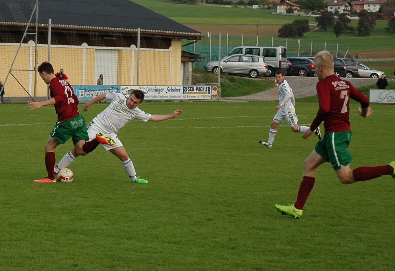 Man merkt gleich von Beginn an, dass es für beide Mannschaften ein wichtiges Duell ist. Attergau wird bereits mit dem ersten Angriff gefährlich. Oberwangs Tormann Alexander Breitenthaler kann den Kopfball von Josef Haslinger zur Ecke abwehren. Oberwang erholt sich aber schnell und ist ebenso von Anfang an auf Betriebstemperatur. Nach einem schönen Angriff über Rene Putz wird Robert Speer gut bedient, doch der Attergauer Tormann Florian Huber kommt heraus und kann den Schuss parieren. Dann ist wieder St. Georgen an der Reihe. Josef Haslinger scheitert zunächst mit seinem Schuss an Breitenthaler, der Ball wird wieder in den Strafraum geflankt und Johannes Hemetsberger köpfelt am Tor vorbei. In der 17. Minute kommt Robert Speer über den Flügel und spielt auf für Alexander Wesenauer, doch der schießt genau auf Torwart Huber. Das Derby bietet von Anfang an viel Unterhaltung, das Spiel ist umkämpft und es geht hin und her. Tobias Huschka hat die nächste Attergauer Chance auf dem Fuß, er trifft mit seinem Flachschuss die Außenstange. (22.) Zum Ende der ersten Halbzeit gelingt es Attergau immer besser, Oberwang in der eigenen Hälfte einzuschnüren. Die Gäste bringen den Ball mehrmals nicht gut weg und so gelingt Attergau die Führung. Johannes Hemetsberger kann nach einem Querpass aus kurzer Distanz zum 1:0 abstauben. (37.) Oberwang kommt kurz vor der Pause noch zur Ausgleichschance. Robert Speer bedient Emanuel Lacher mit einem tollen hohen Ball, der nimmt sich den Ball gut mir der Brust an, trifft aber nur das Außennetz. Attergau führt zur Halbzeitpause knapp mit 1:0.