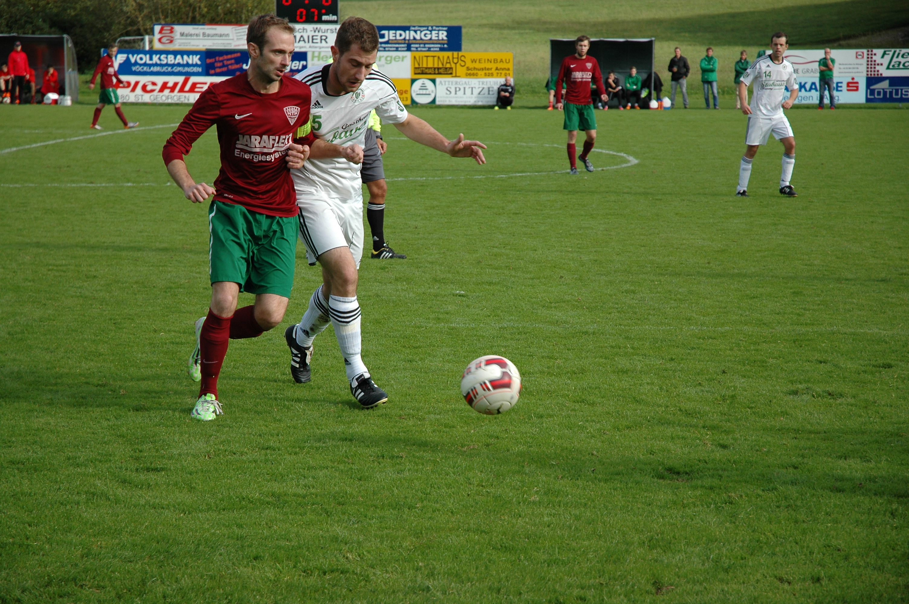 Man merkt gleich von Beginn an, dass es für beide Mannschaften ein wichtiges Duell ist. Attergau wird bereits mit dem ersten Angriff gefährlich. Oberwangs Tormann Alexander Breitenthaler kann den Kopfball von Josef Haslinger zur Ecke abwehren. Oberwang erholt sich aber schnell und ist ebenso von Anfang an auf Betriebstemperatur. Nach einem schönen Angriff über Rene Putz wird Robert Speer gut bedient, doch der Attergauer Tormann Florian Huber kommt heraus und kann den Schuss parieren. Dann ist wieder St. Georgen an der Reihe. Josef Haslinger scheitert zunächst mit seinem Schuss an Breitenthaler, der Ball wird wieder in den Strafraum geflankt und Johannes Hemetsberger köpfelt am Tor vorbei. In der 17. Minute kommt Robert Speer über den Flügel und spielt auf für Alexander Wesenauer, doch der schießt genau auf Torwart Huber. Das Derby bietet von Anfang an viel Unterhaltung, das Spiel ist umkämpft und es geht hin und her. Tobias Huschka hat die nächste Attergauer Chance auf dem Fuß, er trifft mit seinem Flachschuss die Außenstange. (22.) Zum Ende der ersten Halbzeit gelingt es Attergau immer besser, Oberwang in der eigenen Hälfte einzuschnüren. Die Gäste bringen den Ball mehrmals nicht gut weg und so gelingt Attergau die Führung. Johannes Hemetsberger kann nach einem Querpass aus kurzer Distanz zum 1:0 abstauben. (37.) Oberwang kommt kurz vor der Pause noch zur Ausgleichschance. Robert Speer bedient Emanuel Lacher mit einem tollen hohen Ball, der nimmt sich den Ball gut mir der Brust an, trifft aber nur das Außennetz. Attergau führt zur Halbzeitpause knapp mit 1:0.