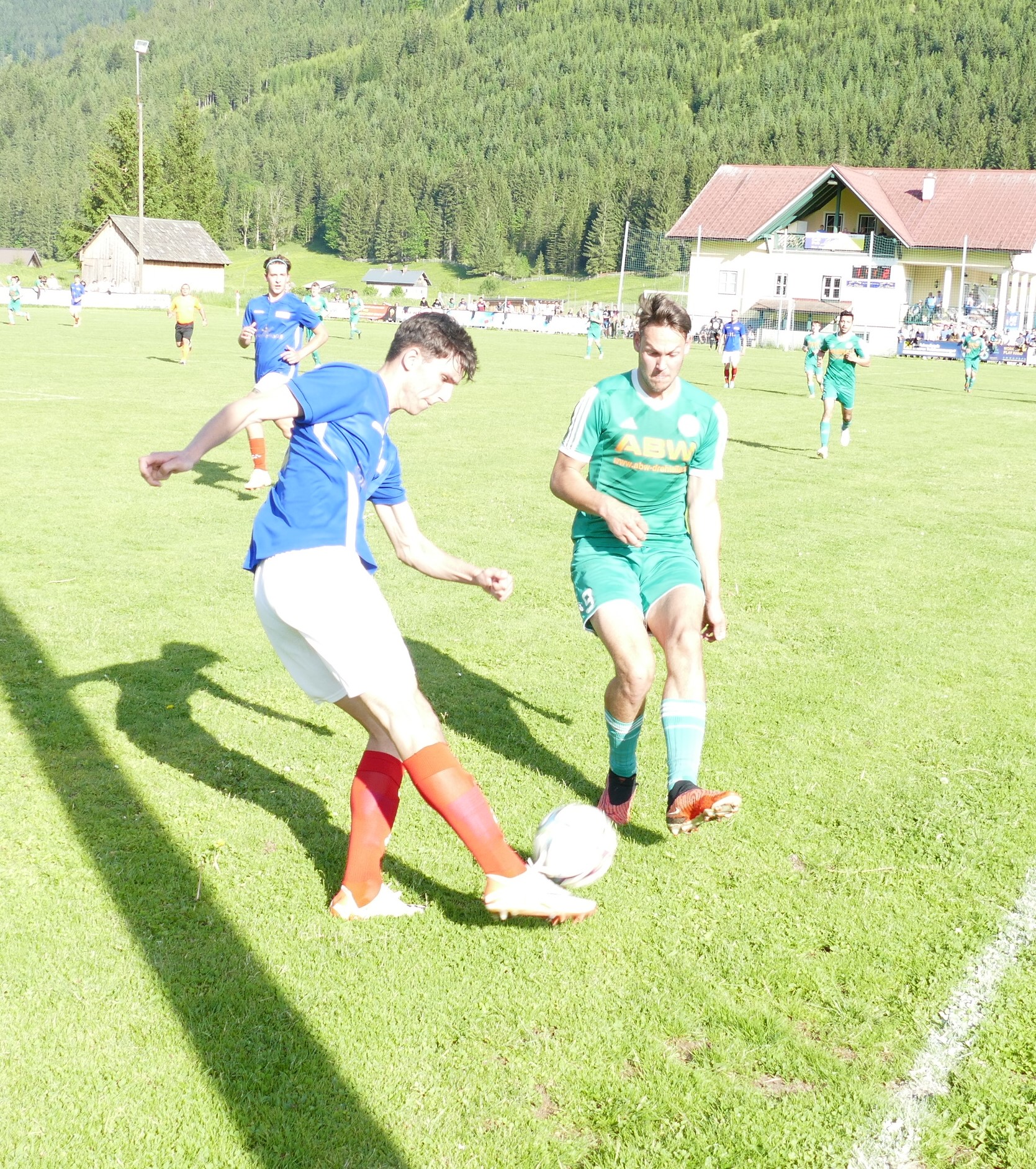 Auf dem kleinen Platz in Gosau passiert die ersten 20 Minuten erst einmal so gut wie gar nichts. Was danach noch folgen sollte hätte zu diesem Zeitpunkt wohl kein Zuschauer geglaubt. In der 20. Minute eröffnet Julian Soriat den Torreigen mit einem absoluten Traumtor aus der Distanz. Die Oberwanger legen mit 1:0 vor und geben den Startschuss für eine wilde Partie. Auch die Gosauer wachen jetzt auf und finden Chancen vor. In der 27. Minute fälscht Tormann Christoph Soriat mit einer Monsterparade den Schuss von Roland Bärnthaler an die Latte ab und verhindert somit den 1:1 Ausgleich. Dieser fällt jedoch eine Minute später dann trotzdem. Nach einer Balleroberung ist Lukas Islitzer frei durch und lässt Christoph Soriat dieses Mal keine Chance. Der Gosauer Torschütze hätte dann in der 31. Minute beinahe den Doppelpack geschnürt, nach einem Sololauf trifft er jedoch nur die Stange. Dann sind wieder die Oberwanger an der Reihe. Markus Soriat zirkelt einen Freistoß über die Gosauer Mauer und bringt die Gäste wieder mit 2:1 in Front. (34.) Es gibt aber keine Zeit zum Durchschnaufen, wieder nur eine Minute später schießt Christoph Kreßl über das Oberwanger Tor. In der Nachspielzeit der ersten Hälfte hat noch einmal Lukas Islitzer die Chance, aber auch er schießt über den Kasten. Somit bleibt es zur Halbzeit bei der Oberwanger Führung.