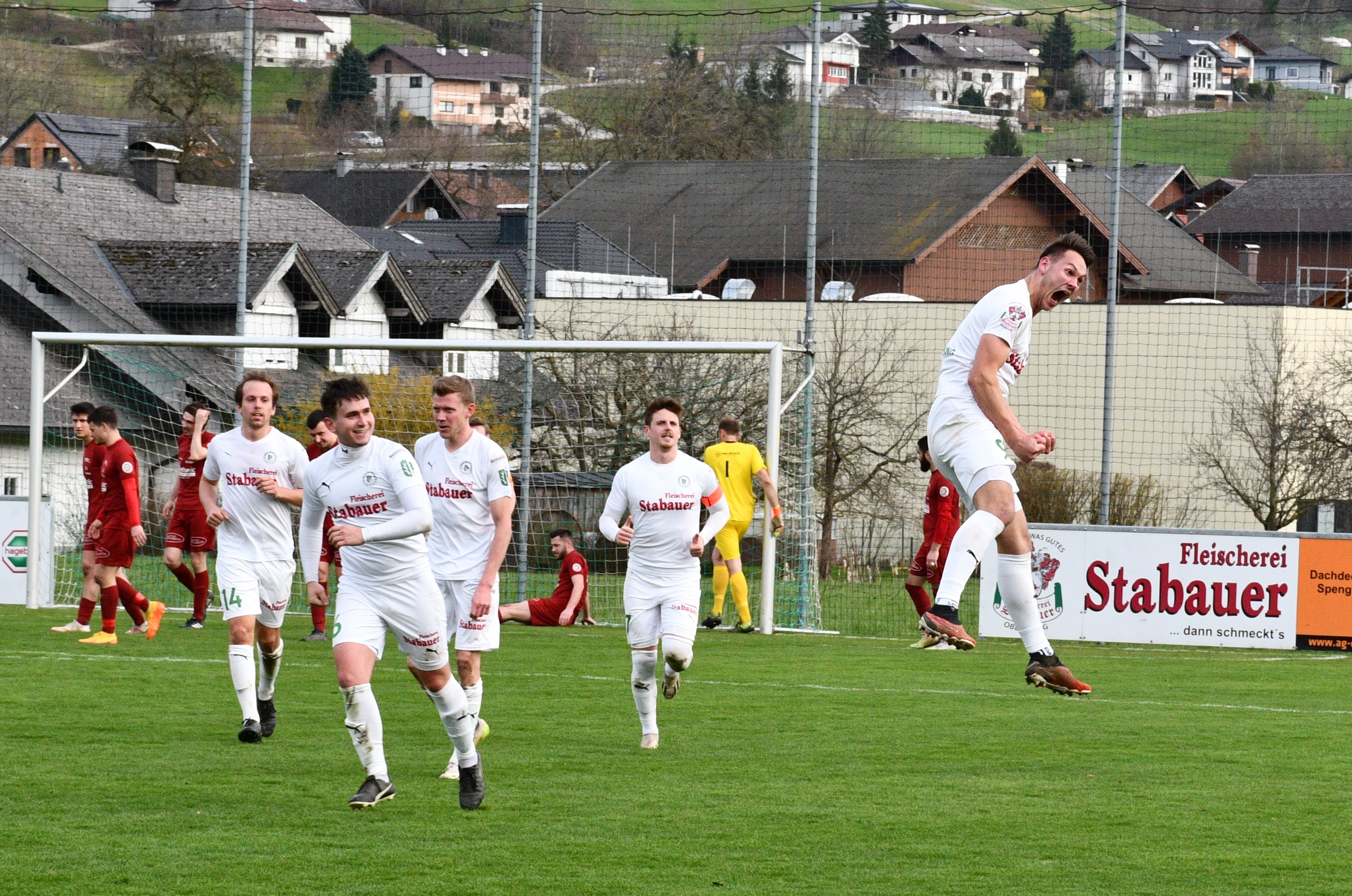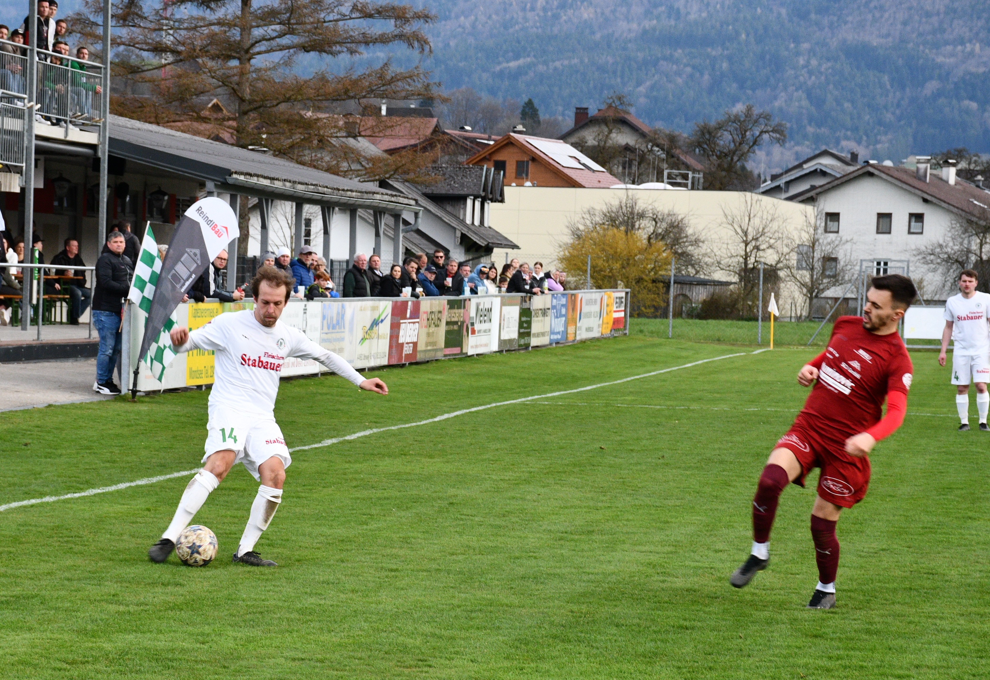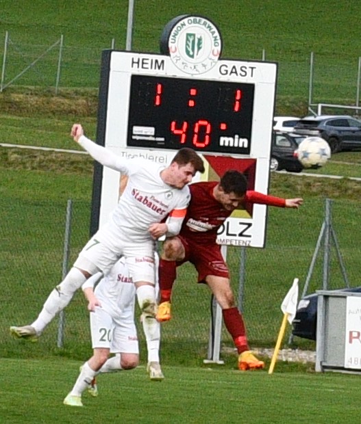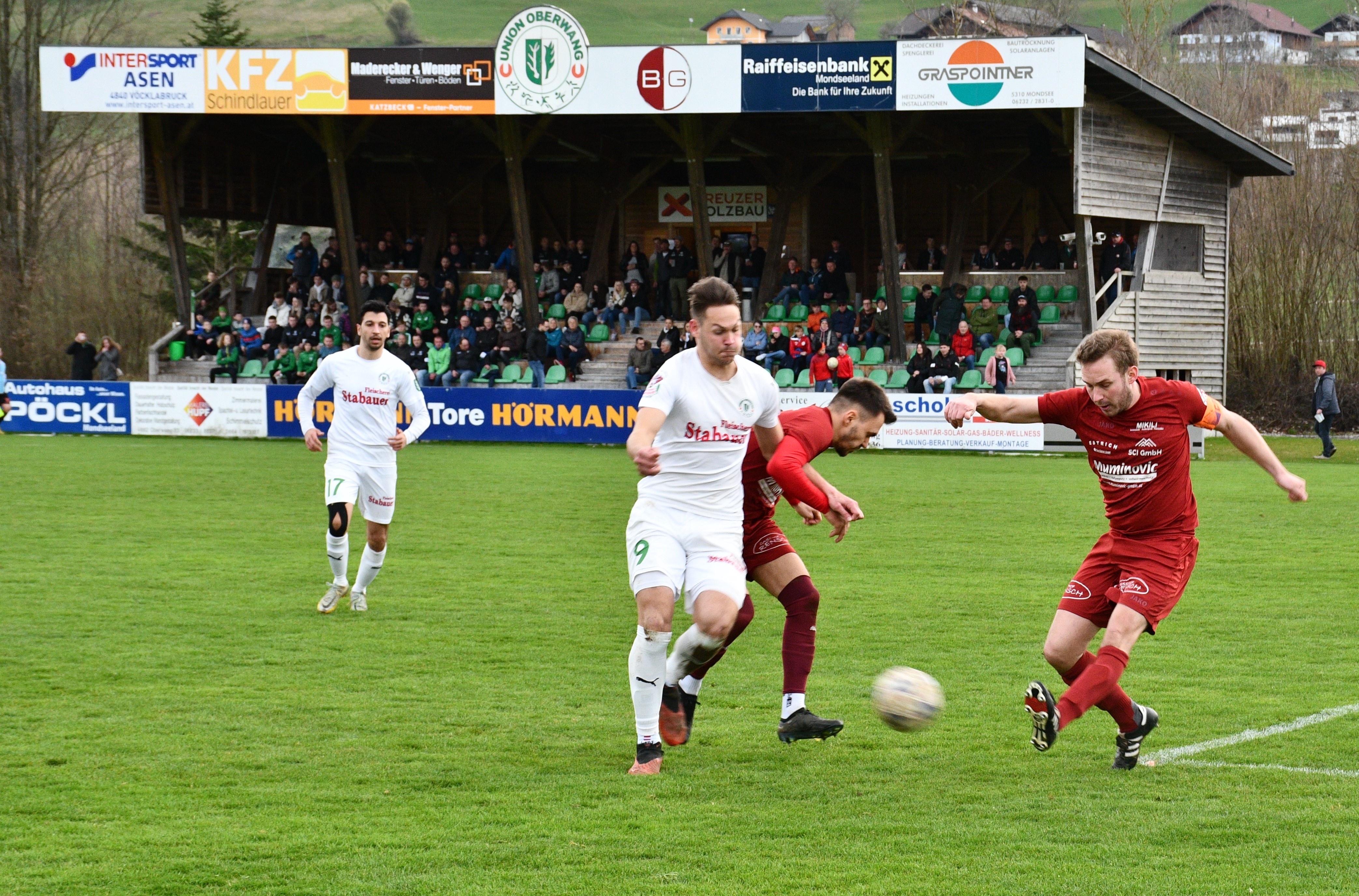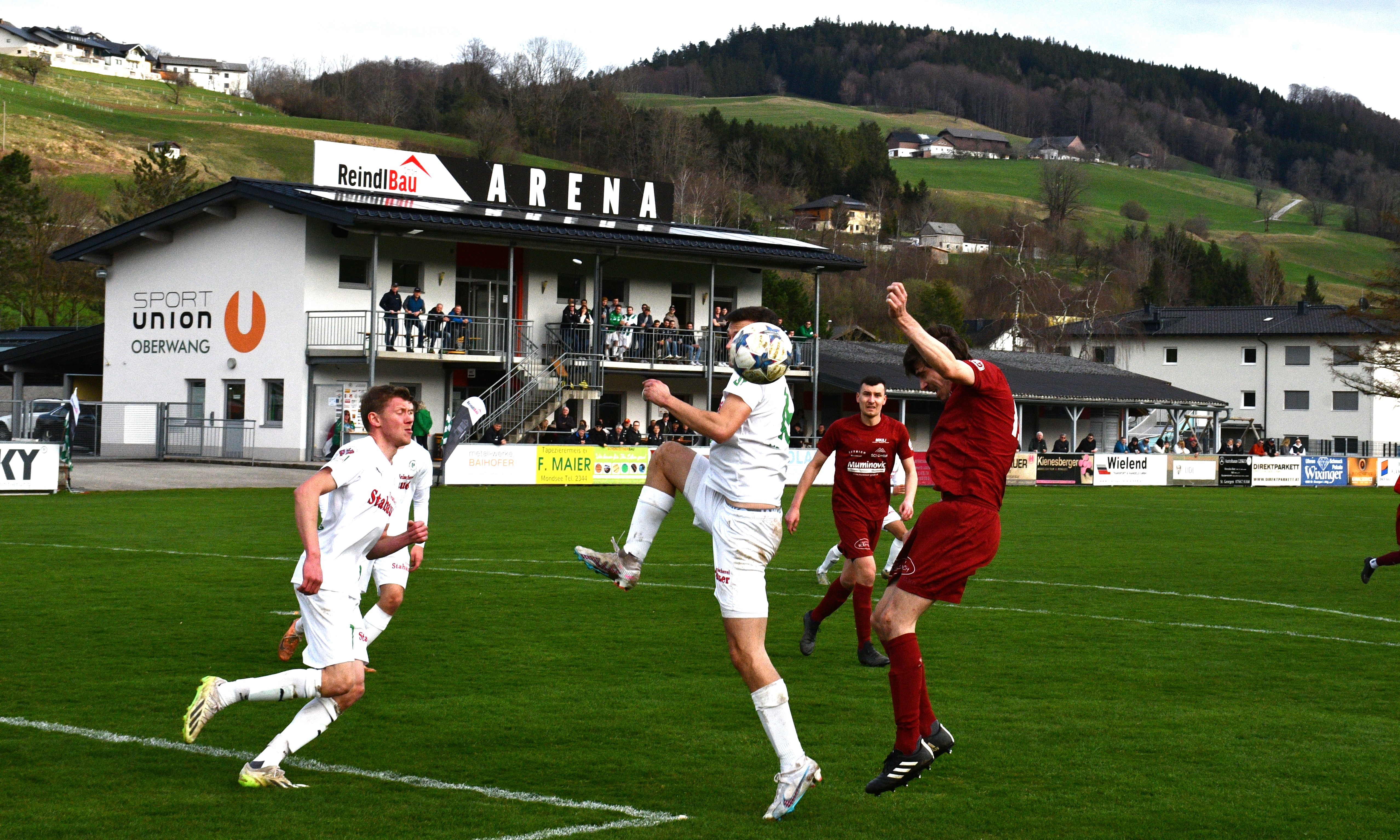 Die Oberwanger verzeichnen einen besseren Start in die Partie und kommen schon in den ersten Minuten gut vor das Rüstorfer Tor. Simon Loindl scheitert mit einem Schuss aus kurzer Distanz am Gästekeeper Manuel Kronberger. (2.) Nach den stürmischen Anfangsminuten flaut die Partie etwas ab. Die Rüstorfer kommen in der 18. Minute das erste Mal gefährlich vors Oberwanger Tor. Bernhard Hofmann hat zu viel Platz und bezwingt mit etwas Glück Oberwangs Tormann David Röthleitner zum 1:0. Ein Rückschlag für die Oberwanger, die aber danach versuchen über Standardsituationen wieder in das Spiel zu kommen. Bei einer Ecke in der 26. Minute köpfelt Mathias Schmidt zu Adel Khalili im Zentrum, aber dieser setzt aus kurzer Distanz den Ball über das Tor. Besser läuft es dann beim Eckball in der 32. Minute. Wieder legt Mathias Schmidt per Kopf ab auf Christoph König und der schießt den Ball zum 1:1 Ausgleich ins Tor. In der 35. Minute gibt es dann die nächste Torchance für die Oberwanger, wieder aus einem Eckball. Dieses Mal kommt der Ball über zwei Stationen zu Markus Soriat, der mit seinem Schuss aber am Rüstorfer Tormann scheitert. Nur eine Minute später kommt Christoph König in eine gute Schussposition, setzt den Ball aber knapp am Tor vorbei. Kurz vor der Pause schlägt dann noch einmal Rüstorf zu. Bei einer Freistoßflanke kommt David Röthleitner aus seinem Tor, aber Sebastian Spiesberger ist eher mit dem Kopf am Ball und erzielt das 2:1 für Rüstorf. (45.) Somit geht es mit einem 1:2 Rückstand für Oberwang in die Kabine.