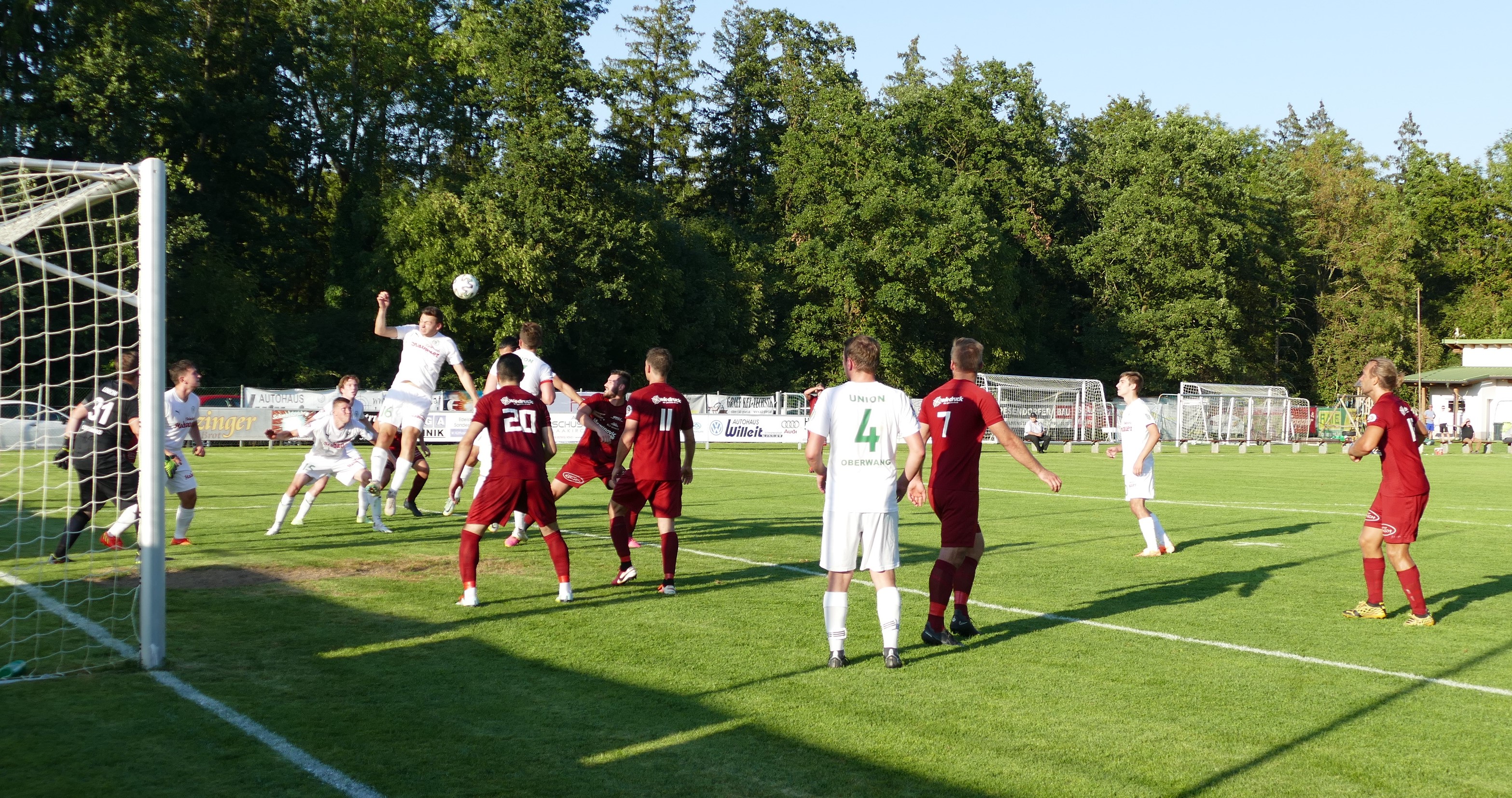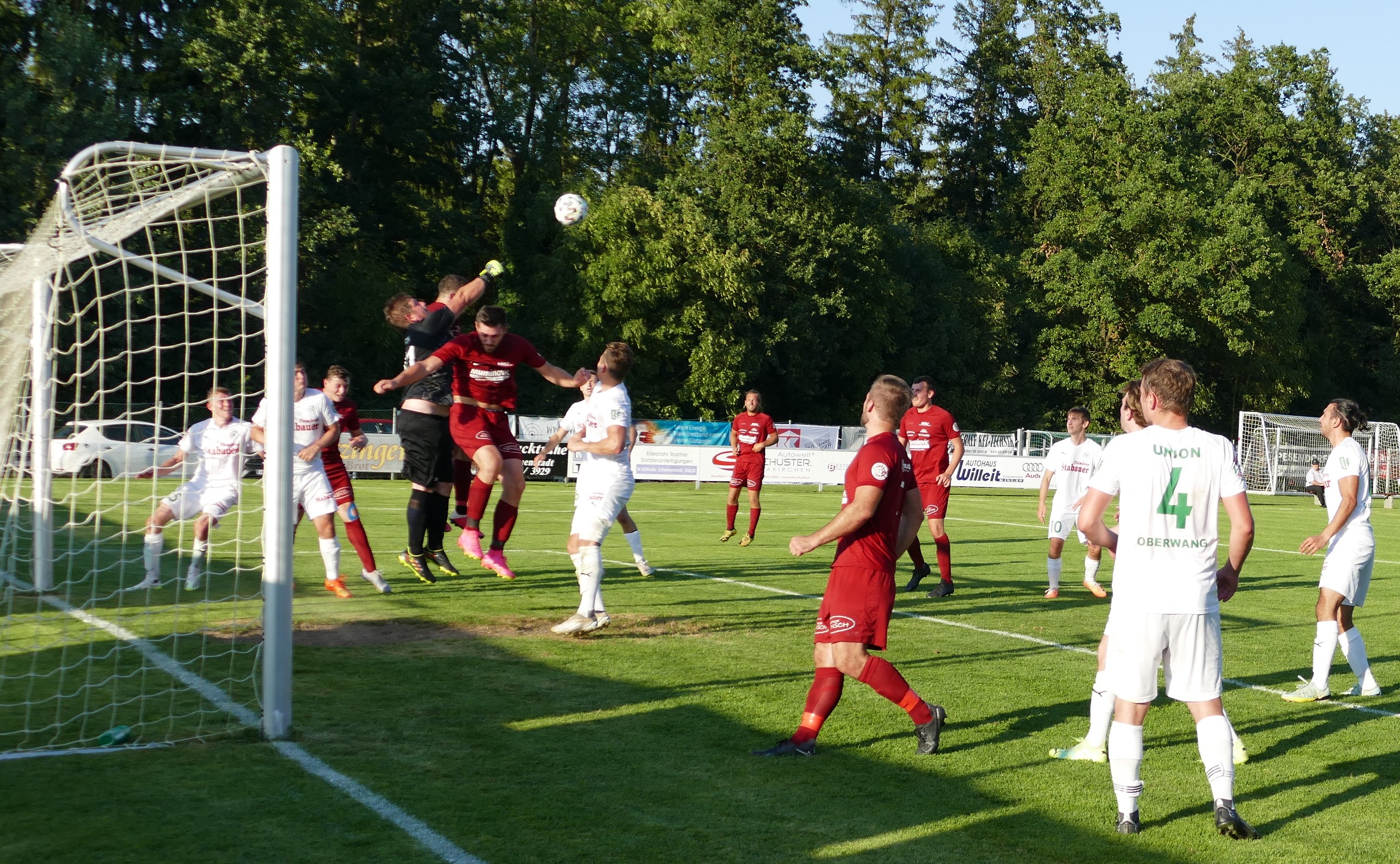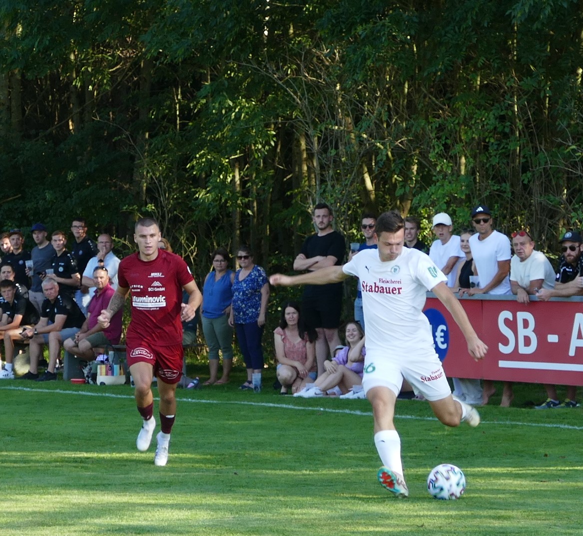 Nach Seitenwechsel zeigt sich zunächst ein ähnliches Bild, das Spiel ist umkämpft im Mittelfeld, aber die Strafraumszenen sind noch selten. Der erste nennenswerte Abschluss kommt dann von Oberwangs Sandro Sperr, wieder ist Spiessberger bei seinem Schuss auf dem Posten (61.) Generell hat er deutlich mehr zu tun als sein Oberwanger Pendant auf der Gegenseite. Auch in der 70. Minute muss der Rüstorfer Torhüter eingreifen, er pariert einen Freistoß aufs kurze Eck. Die Oberwanger sind in Unterzahl dem Führungstreffer näher, haben dann aber auch einmal Glück. In der 78. Minute wäre Christoph Soriat bei einem Eckball schon geschlagen gewesen, aber Stephan Windischer kratzt den Schuss von Mladen Malbasic noch von der Linie. Beide Mannschaften drängen jetzt auf die Entscheidung. Jonas Wonnebauer hätte sein Oberwang-Comeback beinahe mit einem Tor gekrönt, aber auch sein Kopfball kann von Spiessberger gehalten werden. (80.) Hinten lässt man wenig anbrennen bei den Oberwangern, David Hamader vergibt in der 83. Minute eine der wenigen Rüstorfer Torchancen, als er über das Tor schießt. In der Nachspielzeit wäre Marco Szalay beinahe noch der Lucky Punch gelungen, sein Kopfball nach einem Eckball geht aber klar über das Tor. So bleibt es zwar beim torlosen Unentschieden, aber nach so einer langen Unterzahl fühlt es sich für die Oberwanger wie ein Sieg an. Die Gäste haben bis zum Schluss dagegen gehalten und ihre große Moral unter Beweis gestellt.