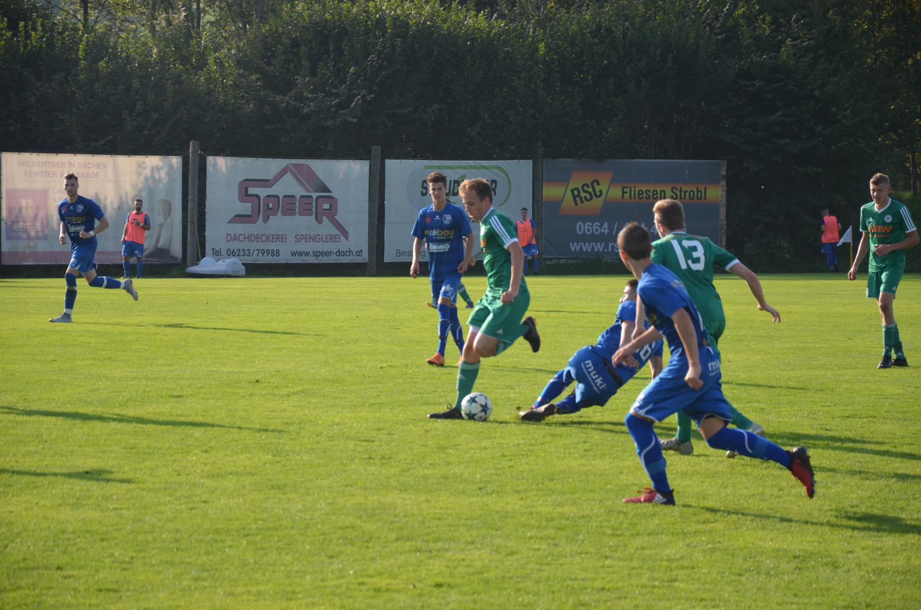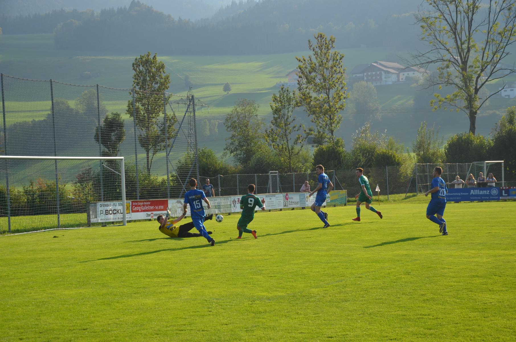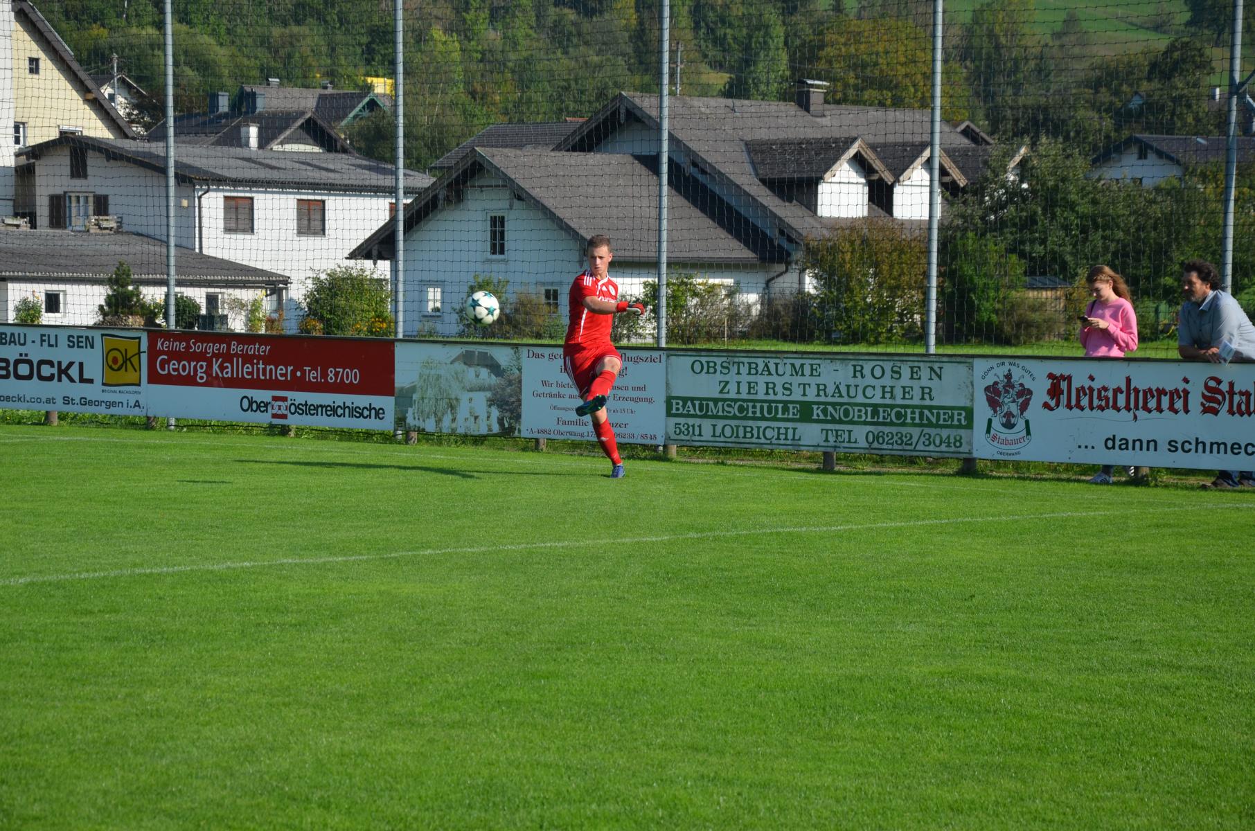 Bei sommerlichen Temperaturen im Herbst deutet zunächst nicht viel auf ein spektakuläres Spiel hin, 18 Minuten lang passiert erst einmal gar nichts. Dann schickt Jonas Wonnebauer Robert Speer über den linken Flügel, der bedient Marco Szalay in der Mitte und der nützt gleich die erste Chance zum 1:0. Die Gäste machen sich erst in der 22. Minute zum ersten Mal bemerkbar. Ein Weitschuss aus dem Halbfeld von Utku Kaplan senkt sich gefährlich aufs hintere Kreuzeck und streift noch die Latte. Ansonsten haben die Oberwanger das Spiel im Griff. In der 22. Minute spielt Andreas Hofauer zu Mathias Schmidt, dessen Torschuss kann Tormann Kollersberger noch abwehren, aber beim Nachschuss von Robert Speer ist er machtlos. Oberwang zeigt sich unglaublich effizient und nützt die zweite Chance zum 2:0. Danach gibt es wieder etwas Leerlauf, ehe es die Oberwanger wieder mit dem bereits gut funktionierenden System versuchen. Jonas Wonnebauer wird wieder über den linken Flügel geschickt, bringt den Stanglpass zur Mitte, aber Marco Szalay schießt genau den Torwart an. Trotzdem liest sich das 2:0 auf der Anzeigetafel zur Pause schon sehr gut.