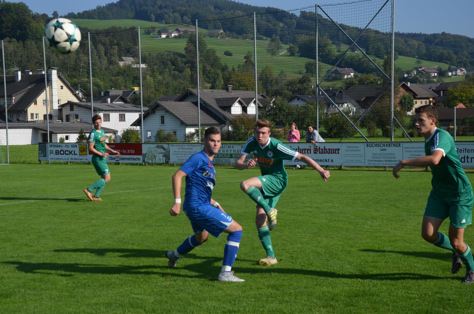 Bei sommerlichen Temperaturen im Herbst deutet zunächst nicht viel auf ein spektakuläres Spiel hin, 18 Minuten lang passiert erst einmal gar nichts. Dann schickt Jonas Wonnebauer Robert Speer über den linken Flügel, der bedient Marco Szalay in der Mitte und der nützt gleich die erste Chance zum 1:0. Die Gäste machen sich erst in der 22. Minute zum ersten Mal bemerkbar. Ein Weitschuss aus dem Halbfeld von Utku Kaplan senkt sich gefährlich aufs hintere Kreuzeck und streift noch die Latte. Ansonsten haben die Oberwanger das Spiel im Griff. In der 22. Minute spielt Andreas Hofauer zu Mathias Schmidt, dessen Torschuss kann Tormann Kollersberger noch abwehren, aber beim Nachschuss von Robert Speer ist er machtlos. Oberwang zeigt sich unglaublich effizient und nützt die zweite Chance zum 2:0. Danach gibt es wieder etwas Leerlauf, ehe es die Oberwanger wieder mit dem bereits gut funktionierenden System versuchen. Jonas Wonnebauer wird wieder über den linken Flügel geschickt, bringt den Stanglpass zur Mitte, aber Marco Szalay schießt genau den Torwart an. Trotzdem liest sich das 2:0 auf der Anzeigetafel zur Pause schon sehr gut.