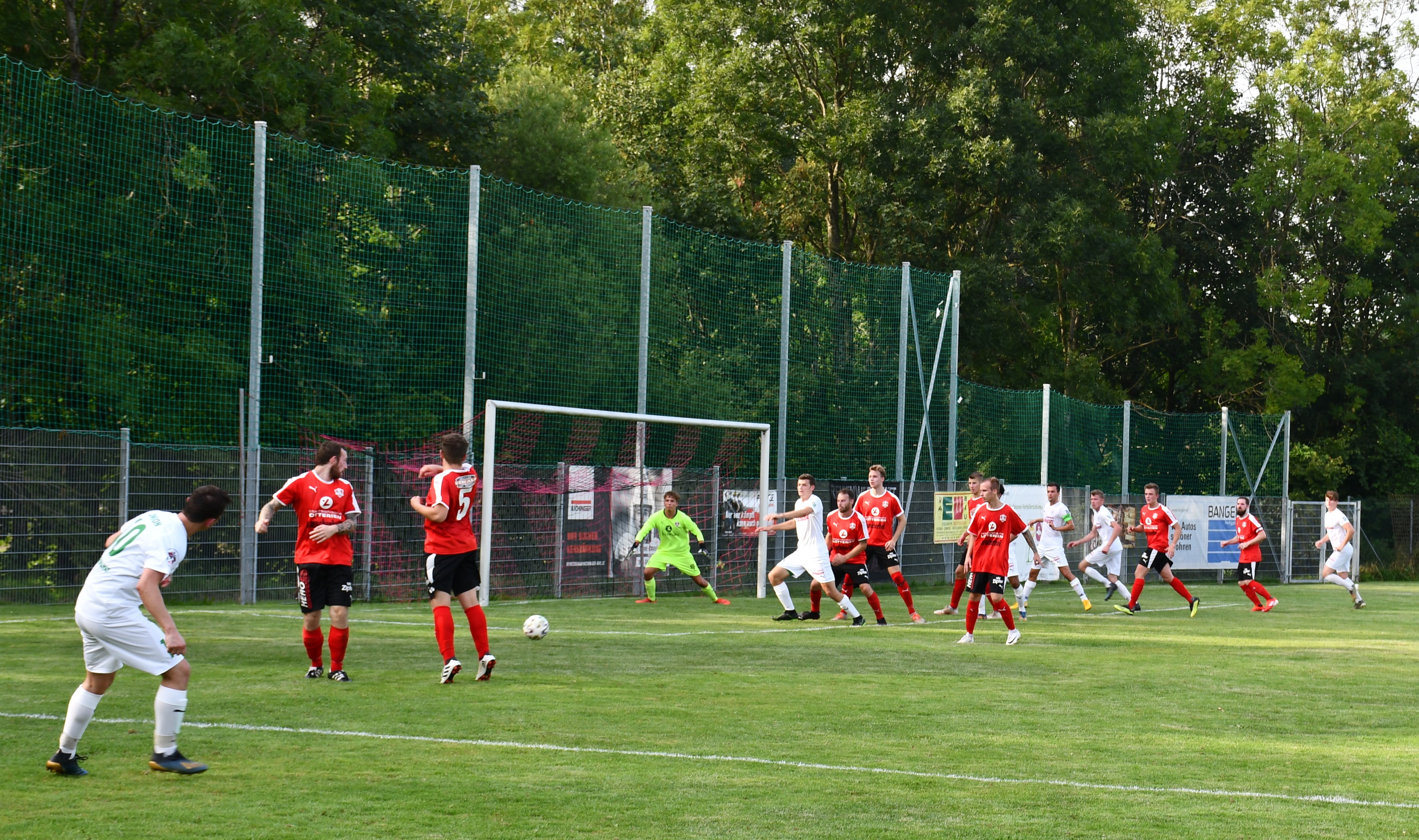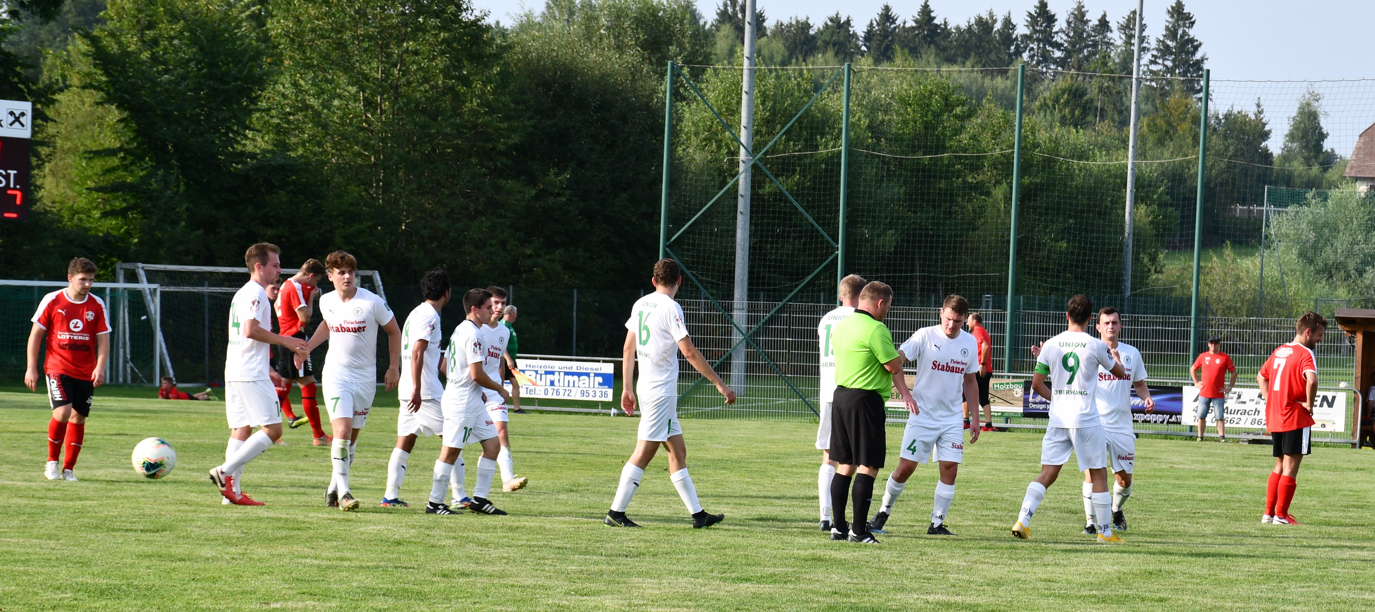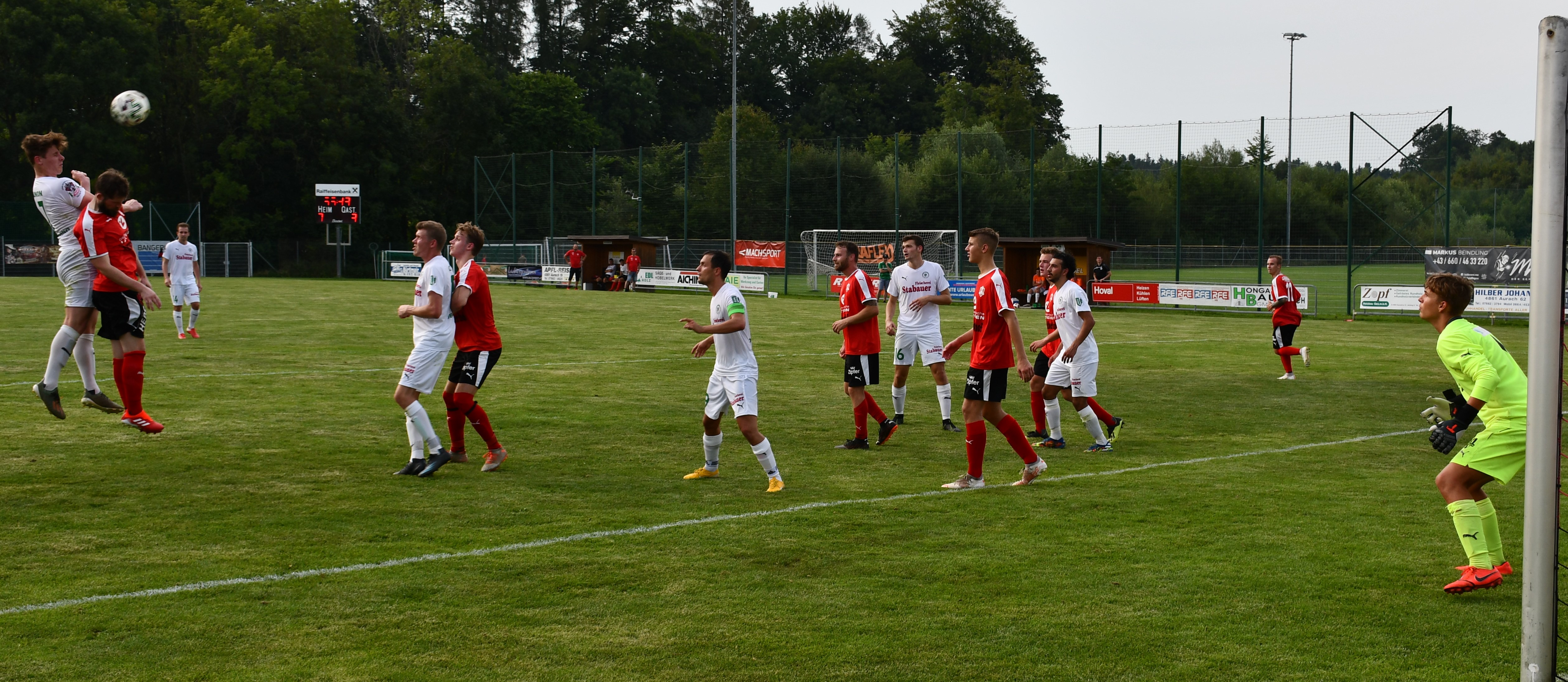 Bei brütender Sommerhitze sind es von Beginn an die Gäste aus Oberwang, die den Ton angeben. Die erste Chance hat Sandro Sperr mit einem Volleyschuss, der aber noch abgefälscht wird und neben das Tor geht. (5.) In der 10. Minute zieht Simon Loindl nach innen und trifft mit einem tollen Schuss knapp neben die Stange zum 1:0. Hinten sind die Oberwanger bis zur 17. Minute ungefährdet. Dann ist plötzlich Patrick Roth im Konter frei durch, aber Tormann Marco Plank lässt sich beim Schuss aufs kurze Eck nicht überraschen. Es sollte aber die einzige Auracher Chance in der ersten Hälfte bleiben. In der 28. Minute haben die Auracher Glück. Tormann Ringer wäre beim Schuss von Mathias Schmidt chancenlos gewesen, aber der Ball klatscht an die Stange. Nach 38. Minuten fällt aber der verdiente Treffer zum 2:0 für Oberwang. Mathias Schmidt spielt einen guten Pass durch die Auracher Verteidigung und Robert Speer hat wenig Mühe, den Ball am Tormann vorbeizubringen. Kurz vor der Pause ist es noch einmal Robert Speer, der zwar im ersten Versuch scheitert, aber den Nachschuss ansatzlos unter die Latte hämmert. (44.) 3:0, Oberwang sorgt bereits vor der Halbzeitpause für klare Verhältnisse.