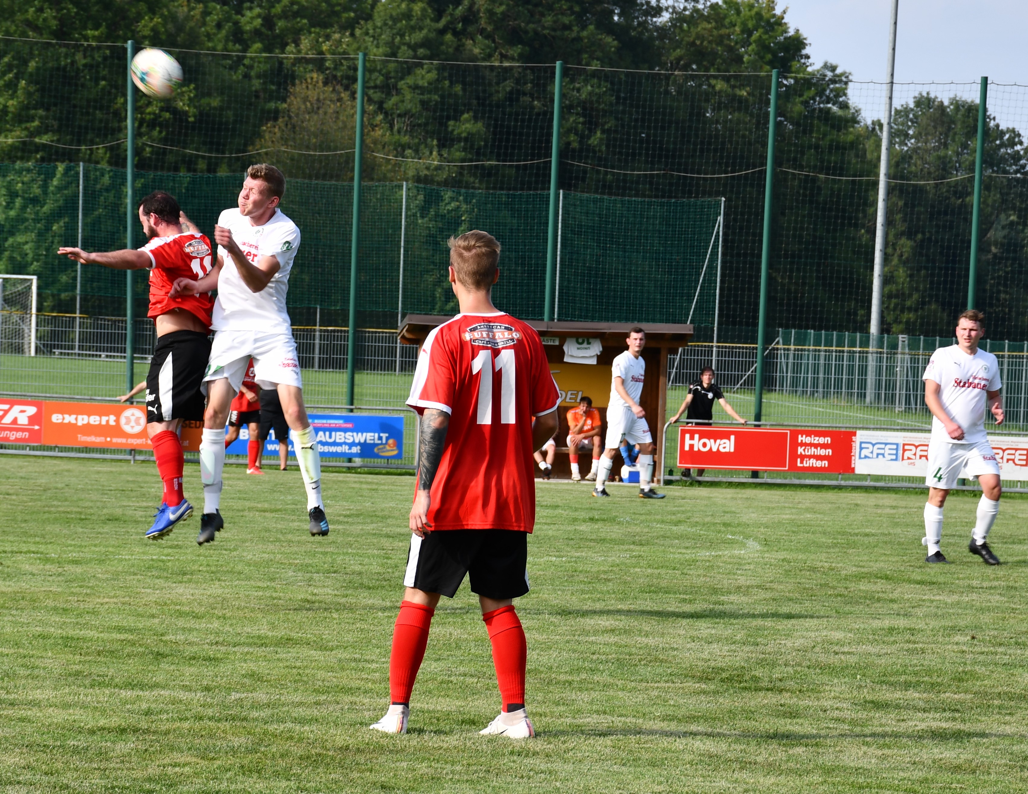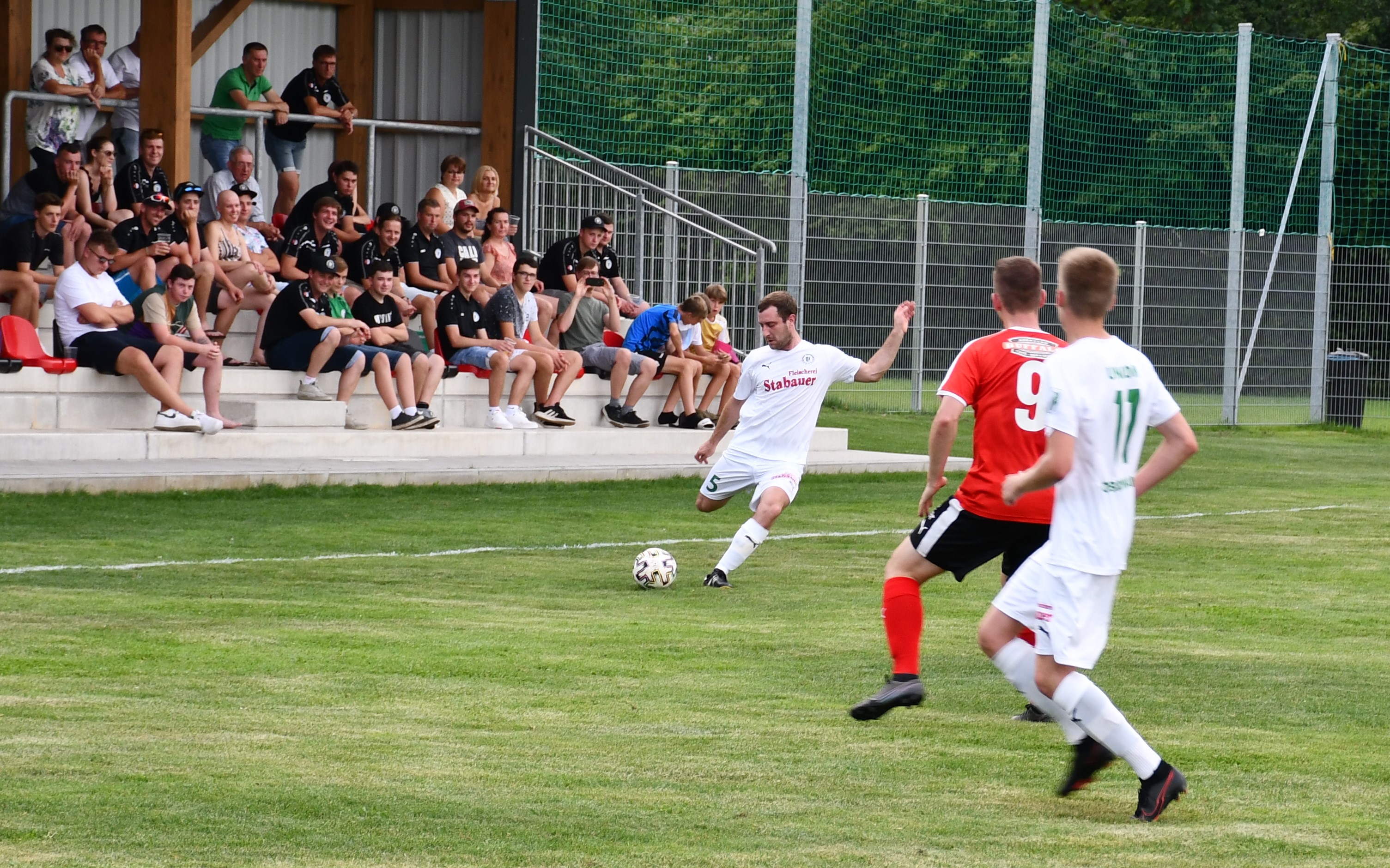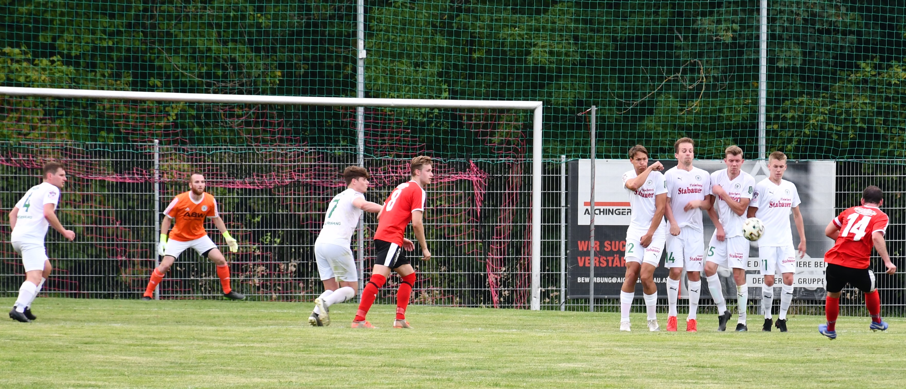 Bei brütender Sommerhitze sind es von Beginn an die Gäste aus Oberwang, die den Ton angeben. Die erste Chance hat Sandro Sperr mit einem Volleyschuss, der aber noch abgefälscht wird und neben das Tor geht. (5.) In der 10. Minute zieht Simon Loindl nach innen und trifft mit einem tollen Schuss knapp neben die Stange zum 1:0. Hinten sind die Oberwanger bis zur 17. Minute ungefährdet. Dann ist plötzlich Patrick Roth im Konter frei durch, aber Tormann Marco Plank lässt sich beim Schuss aufs kurze Eck nicht überraschen. Es sollte aber die einzige Auracher Chance in der ersten Hälfte bleiben. In der 28. Minute haben die Auracher Glück. Tormann Ringer wäre beim Schuss von Mathias Schmidt chancenlos gewesen, aber der Ball klatscht an die Stange. Nach 38. Minuten fällt aber der verdiente Treffer zum 2:0 für Oberwang. Mathias Schmidt spielt einen guten Pass durch die Auracher Verteidigung und Robert Speer hat wenig Mühe, den Ball am Tormann vorbeizubringen. Kurz vor der Pause ist es noch einmal Robert Speer, der zwar im ersten Versuch scheitert, aber den Nachschuss ansatzlos unter die Latte hämmert. (44.) 3:0, Oberwang sorgt bereits vor der Halbzeitpause für klare Verhältnisse.