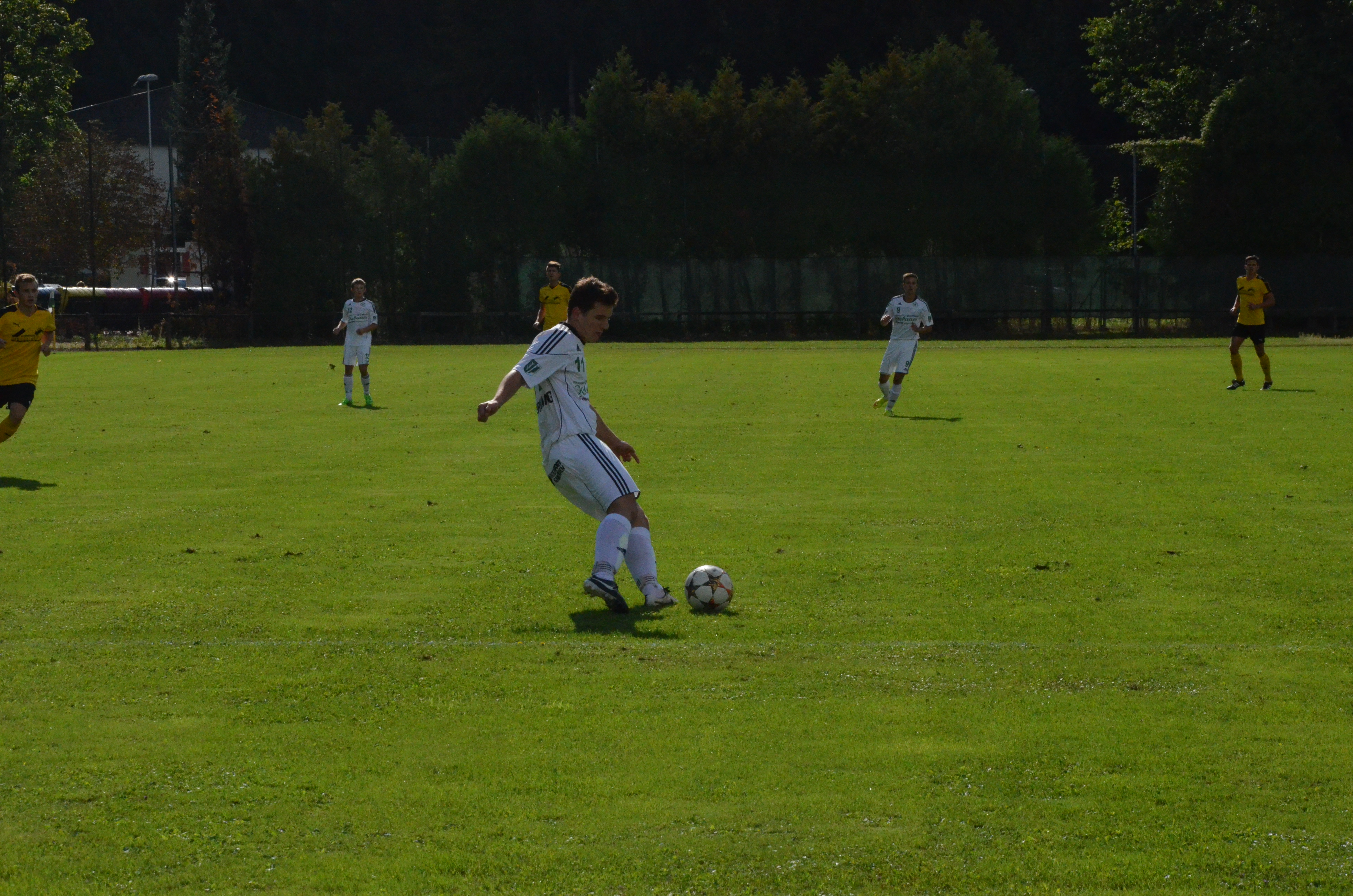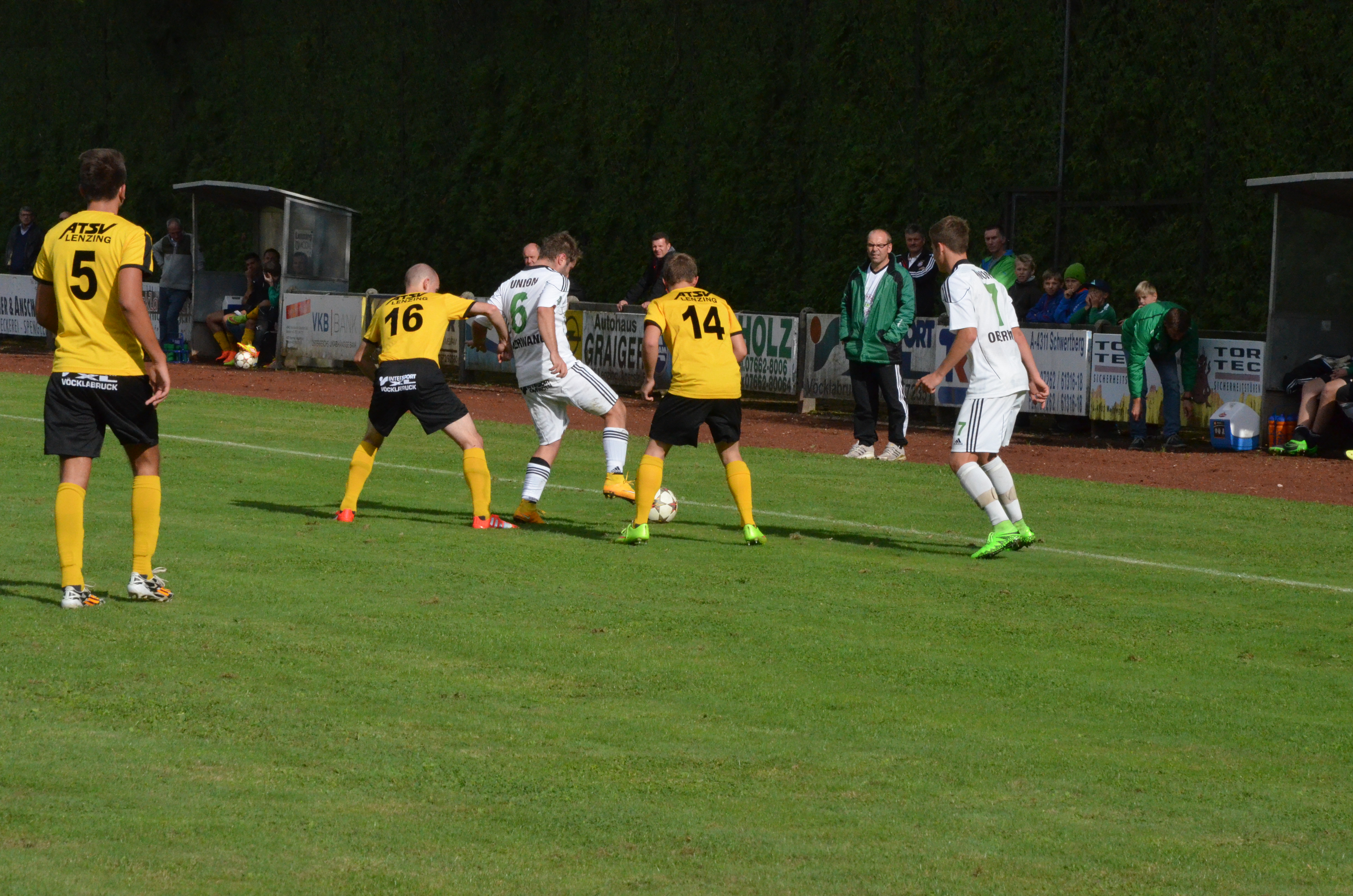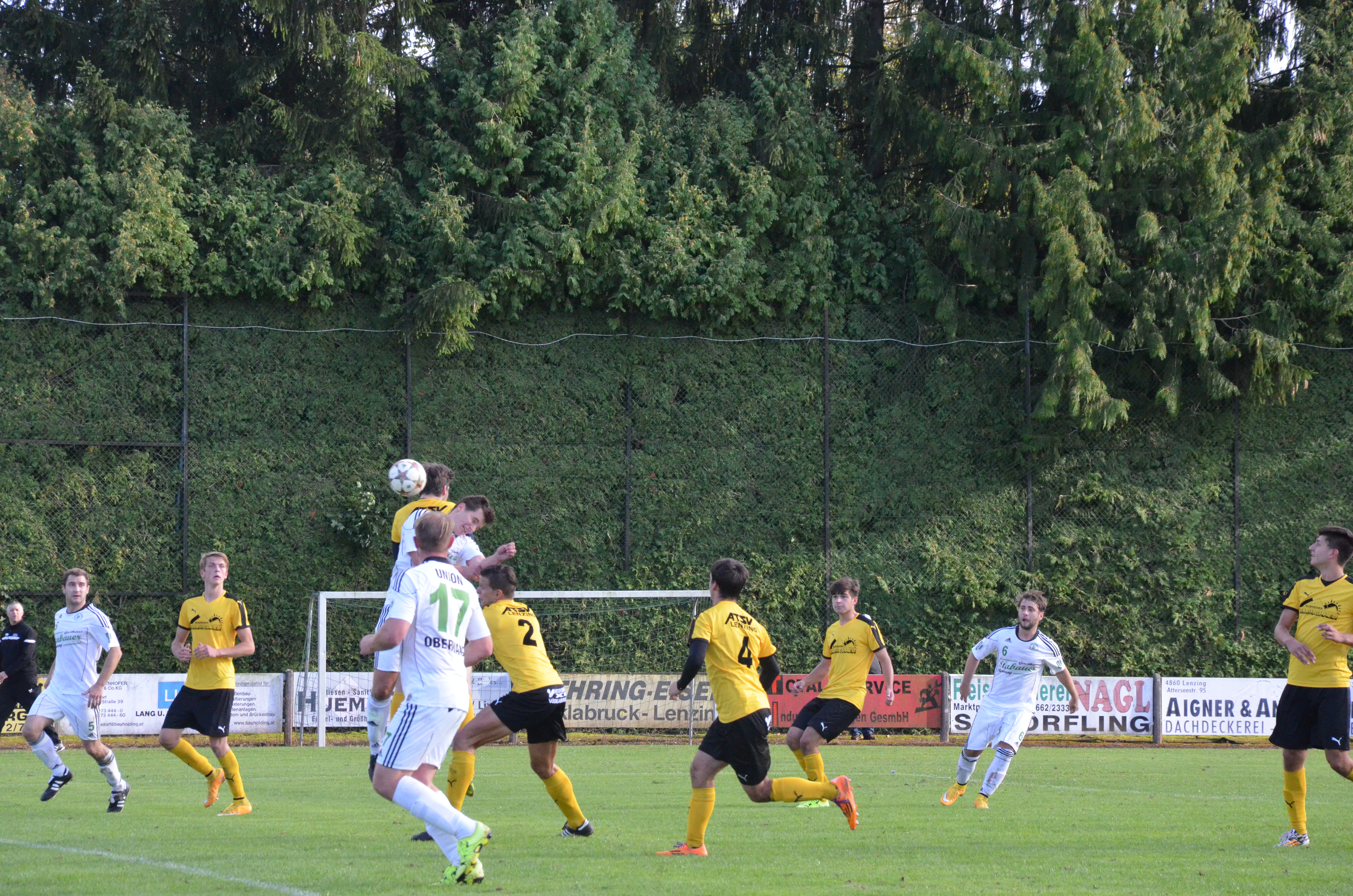 Bei Oberwang ersetzt Christoph Soriat den erkrankten Alexander Breitenthaler im Tor. In den ersten Minuten bekommt er auch schon ordentlich Arbeit, die Lenzinger treten gleich mal aufs Gas. Nach einem Missverständnis der Oberwanger Verteidigung kann Markus Bauer alleine aufs Tor zulaufen, doch Soriat kommt gut heraus und blockt den Schuss ab. (17.) In der 22. Minute hat Oberwang Glück, Lenzing trifft per Kopf nach einem Eckball nur die Latte. Oberwang wird dann durch Robert Speer gefährlich, er scheitert nach guter Flanke aber an Torwart Trinker. (27.) Immerhin haben die Gäste mittlerweile ebenfalls ins Spiel gefunden, vor allem über die Flügel geht viel. So kommt auch die 1:0 Führung zustande. Nach einer Flanke von rechts bringen die Lenzinger beim anschließenden Gestocher den Ball nicht weg und Emanuel Lacher trifft zur Führung für Oberwang nach einer halben Stunde. In den kommenden Minuten wird die Partie richtig intensiv, ein Auf und Ab mit einigen sehenswerten Szenen. Auf Seiten von Oberwang wird Robert Speer in der Mitte gut von Rene Putz bedient, schießt aber knapp am rechten Eck vorbei. (32.) Lenzing wird in Person von Armin Salihovic gefährlich, der nach einem hohen Ball alleine vor Tormann Soriat auftaucht, sein Lupfer geht aber neben das Tor. (34.) Im Minutentakt geht es weiter. Bernhard Asen spielt einen katastrophalen Rückpass, Lenzings Stürmer Markus Bauer kann den Ball erobern und wird von Tormann Soriat knapp außerhalb des Strafraums gelegt. Soriat sieht glücklicherweise nur Gelb, doch der Freistoß wird gefährlich. Die Lenzinger führen flach aus, der Ball wird mehrmals abgeblockt und landet dann bei Simon Sailer, der volley danebenschießt. (38.) Bernhard Asen hat in einer ereignisreichen ersten Hälfte die letzte Chance, sein Dropkick geht knapp rechts neben das Tor.