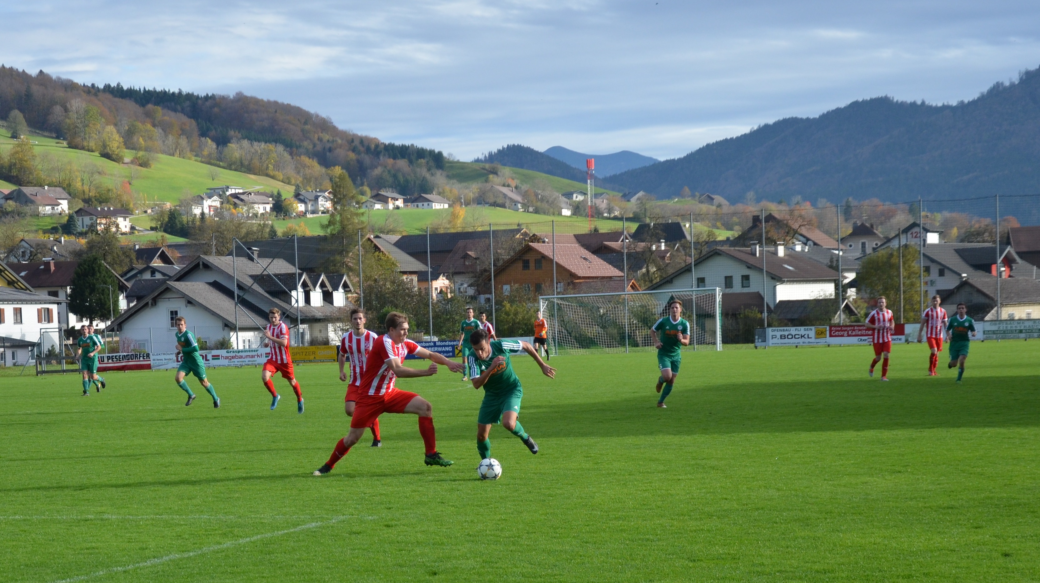 Das Derby braucht etwas um in Schwung zu kommen, beide Mannschaften tun sich auf dem tiefen Boden schwer. In der 14. Minute gibt es die erste Topchance für Oberwang, Josef Heisler setzt den Ball aber an die Innenstange. Zwei Minuten später versucht es wieder Josef Heisler mit einem Schuss, dieses Mal geht der Ball übers Tor. In der 22. Minute muss Mathias Schmidt angeschlagen raus, er wird durch Michael Heiml ersetzt. Nach 26 Minuten gibt es einen Freistoß für Oberwang. Mario Lettner bringt den Ball zur Mitte und Marco Szalay köpfelt wuchtig in die Zeller Maschen – 1:0. Defensiv sind die Oberwanger vor dem Seitenwechsel stabil, offensiv konnte man eine der wenigen Torchancen zur Führung nutzen.