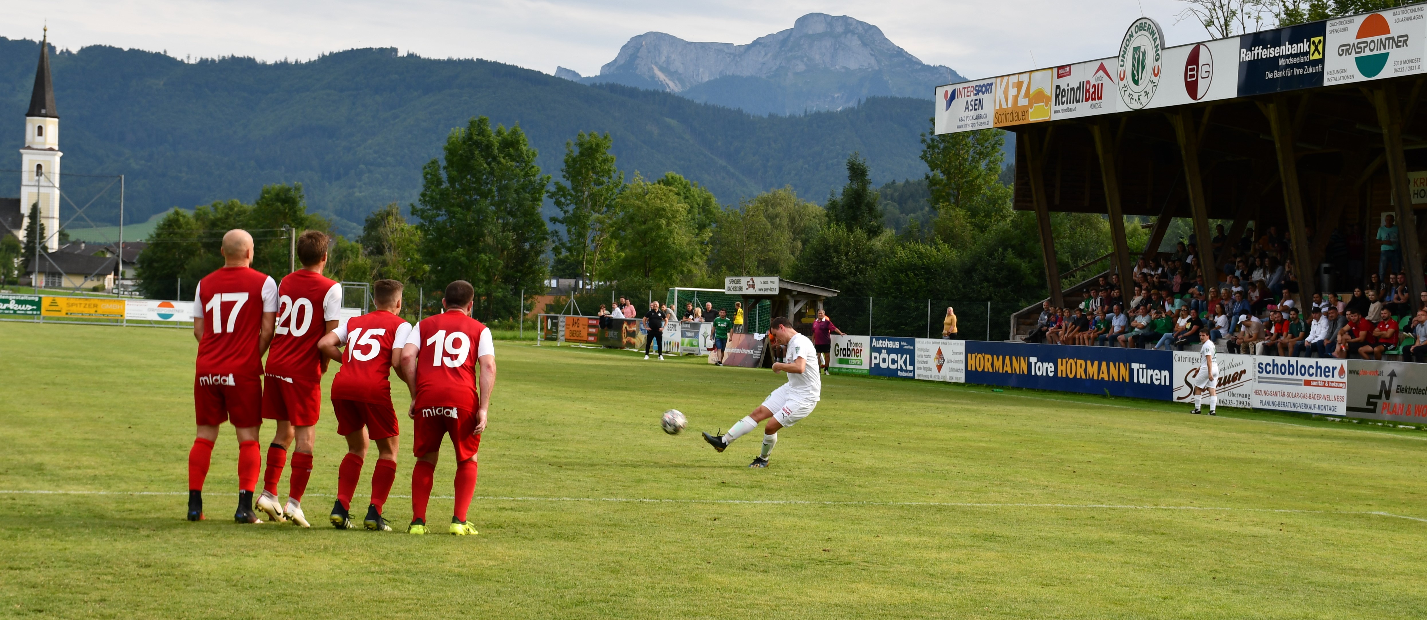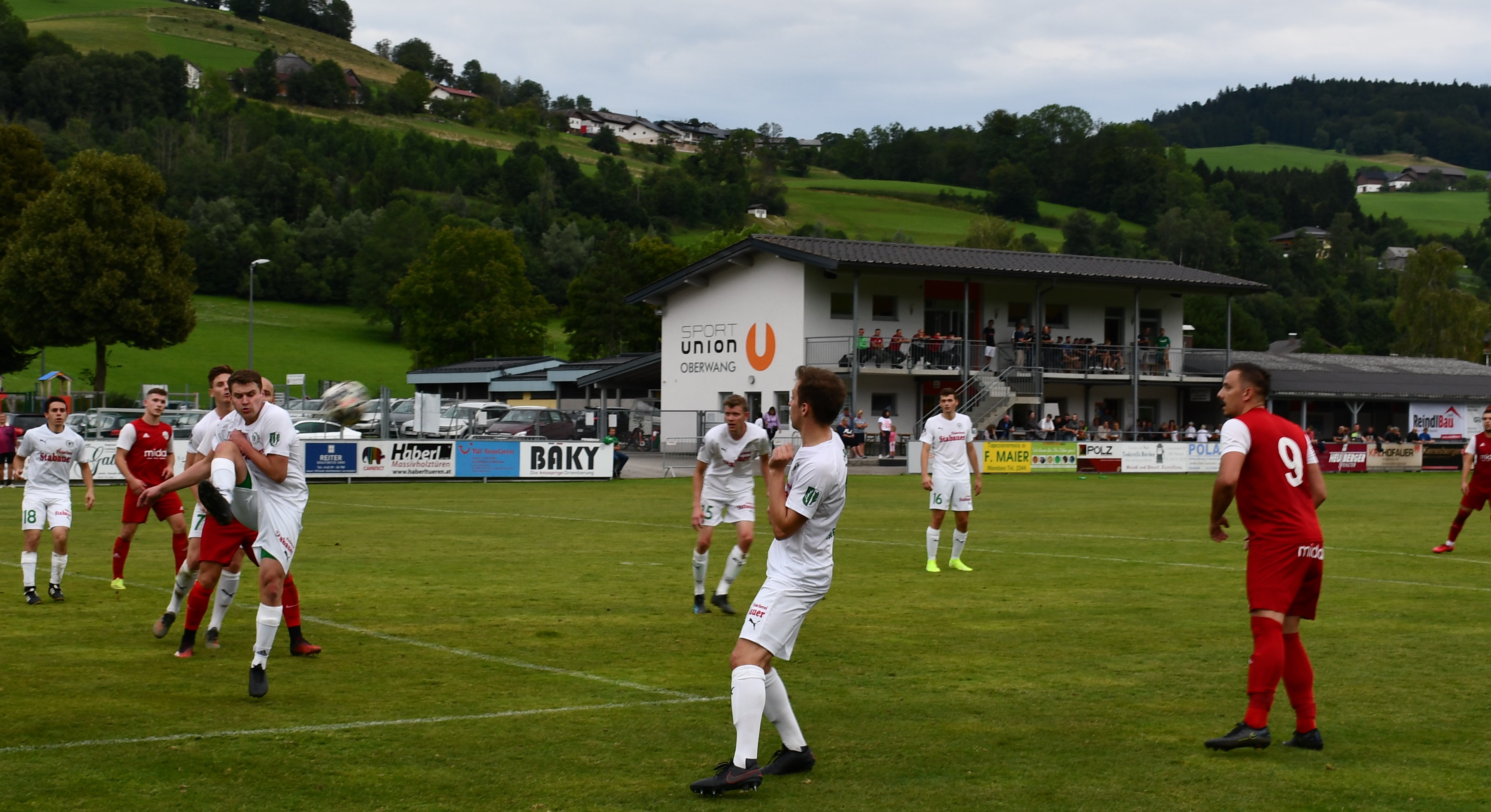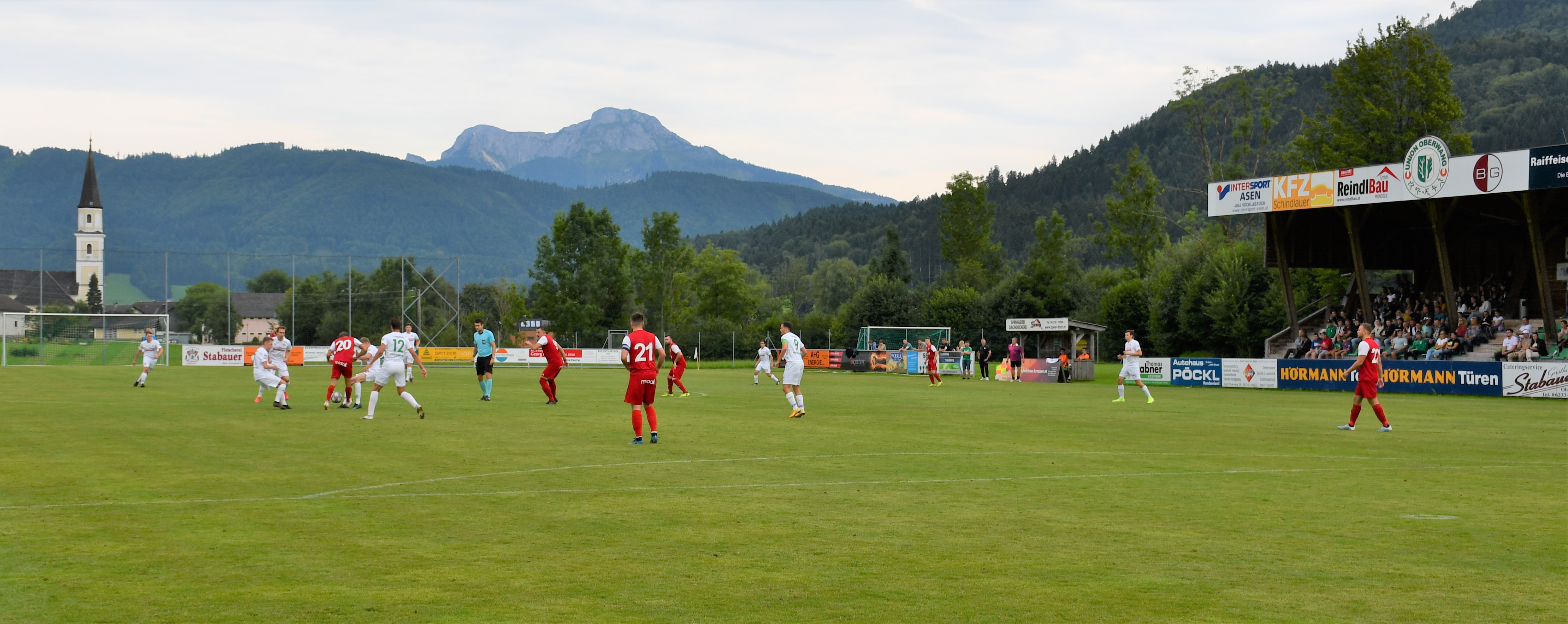 Oberwang startet druckvoll und kommt gleich in der ersten Minute durch Niklas Sperr zur ersten Chance, der setzt seinen Schuss aber am Tor vorbei. In der 4. Minute folgt der erste Auftritt von Christoph König, der dieses Mal in der Startelf steht. Er schießt mit dem Außenrist aufs Tor und liefert so die perfekte Vorlage für Robert Speer, der zum 1:0 trifft. Der Goalgetter hätte in der 9. Minute beinahe das nächste Tor nachgelegt, aber dieses Mal wird der Schuss abgeblockt. Statt 2:0 für Oberwang steht es dann aber plötzlich 1:1. Nenad Vuckovic tankt sich durch die Abwehr und knallt den Ball ins Netz – keine Chance für Leo Karlinger, der dieses Mal das Oberwanger Tor hütet. Die Heimmannschaft lässt sich durch den Ausgleich aber nicht beirren und greift weiter an. Bei einem Freistoß von Mario Lettner prüft Nemanja Spasojevic per Kopf seinen eigenen Torhüter. (19.) Auf der Gegenseite setzt sich Johannes Beißkammer im Zweikampf gegen Peter Lametschwandtner durch, trifft aber aus spitzem Winkel nur die Stange. Nur eine Minute später probiert es Mario Lettner mit einem Weitschuss. Der Ball geht an die Latte und springt zurück zu Christoph König, der aber den Nachschuss nicht am Tormann vorbeibringt. Dafür glänzt Christoph König in der nächsten Szene, er flankt optimal in den Strafraum für Robert Speer, der volley zum 2:1 einschießt. (31.) Wieder nur eine Minute später hätte Robert Speer beinahe den Hattrick geschnürt, aber sein Schuss geht knapp rechts am Tor vorbei. In der 42. Minute geht das Aluminiumfestival weiter. Bei einem Freistoß von Peter Lametschwandtner scheitert Simon Loindl im ersten Versuch an Tormann Feichtinger, kann im Sitzen aber noch einmal schießen und trifft die Latte. Die erste Hälfte ist durchaus ereignisreich und unterhaltsam, aber ein Treffer fällt sogar noch. In der Schlussminute wird Robert Speer ideal in den Lauf geschickt und der lässt sich diese Chance nicht entgehen und schnürt mit dem 3:1 jetzt wirklich seinen zweiten Hattrick. Oberwang geht also mit einer Zwei-Tore-Führung in die Pause.