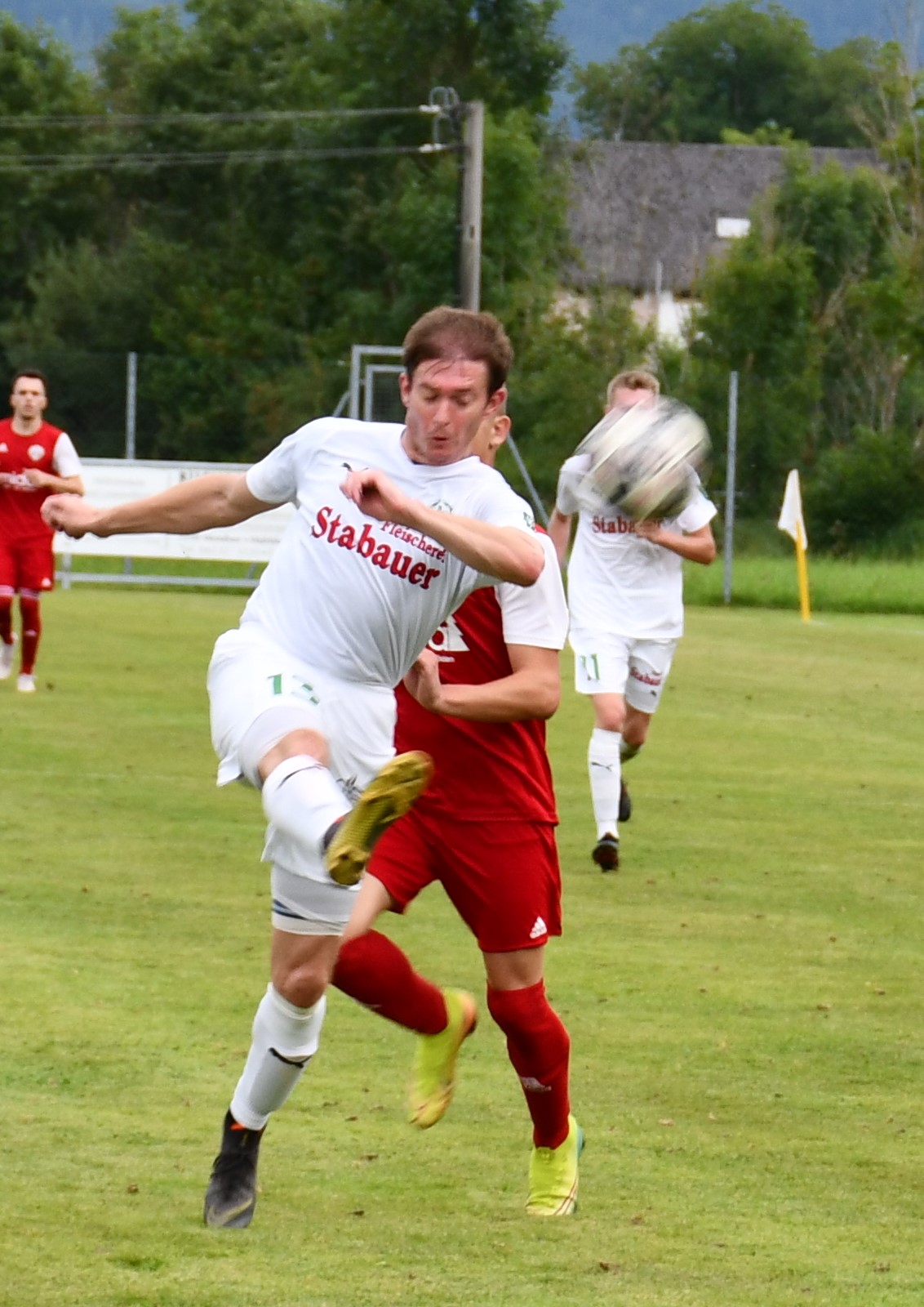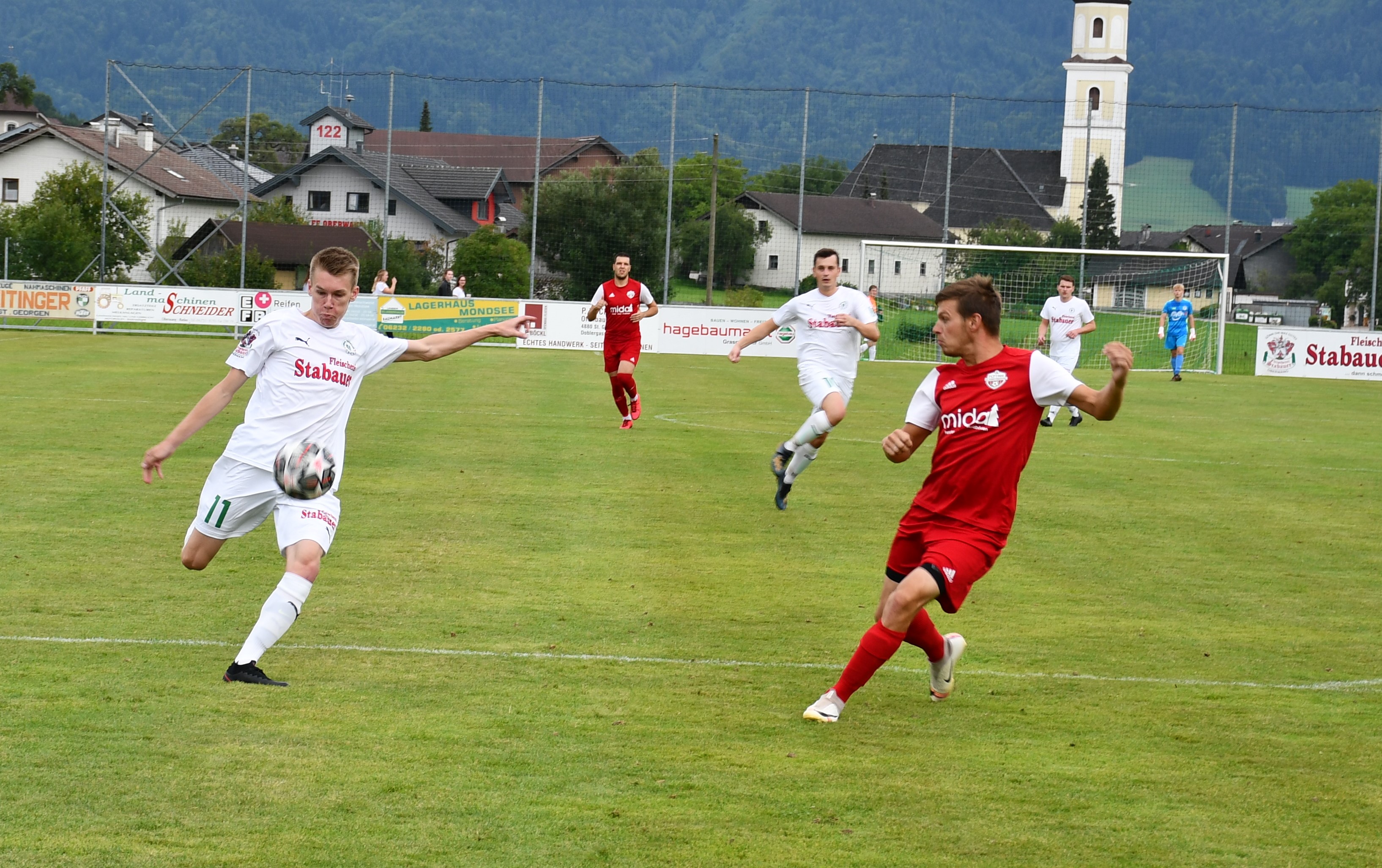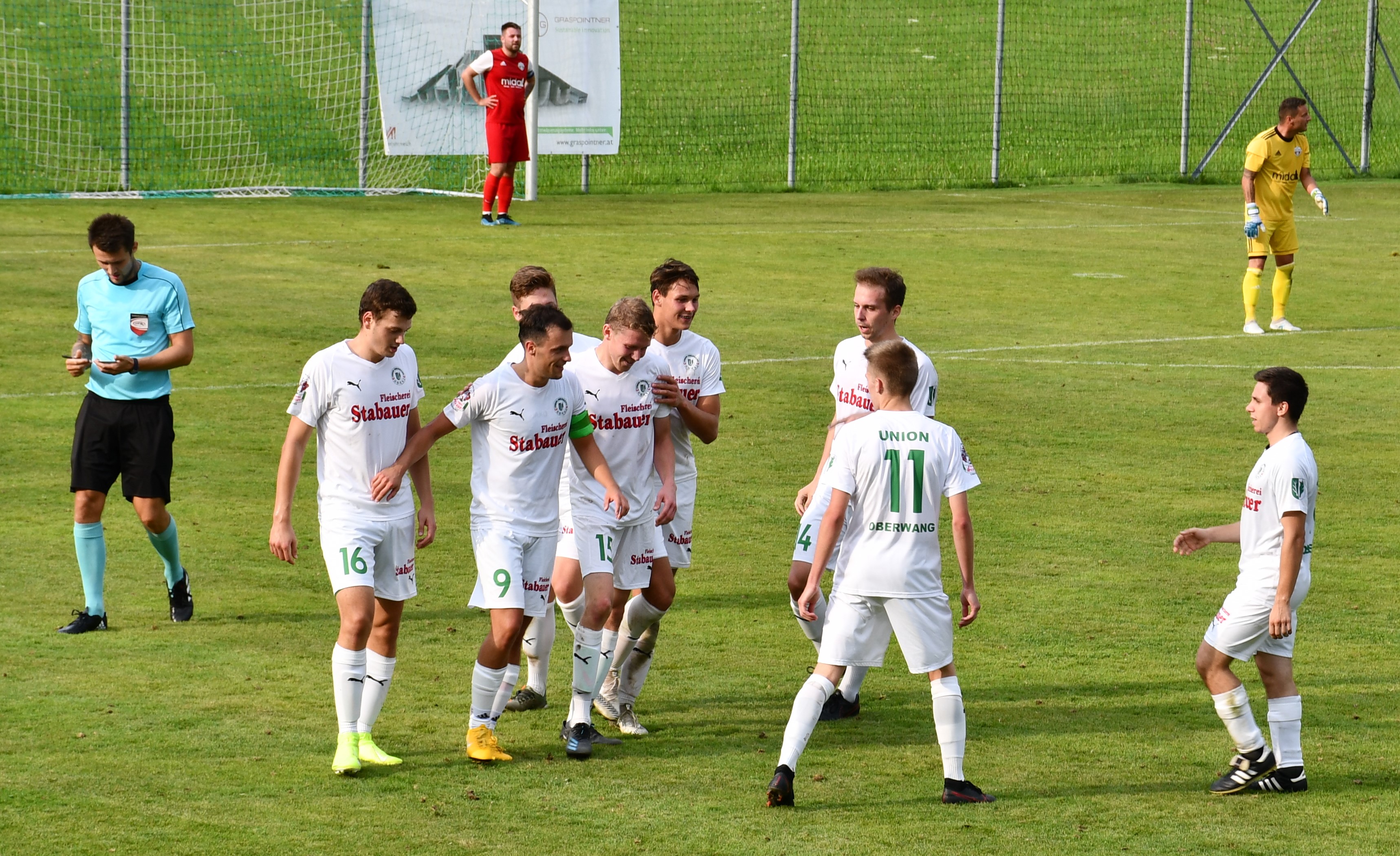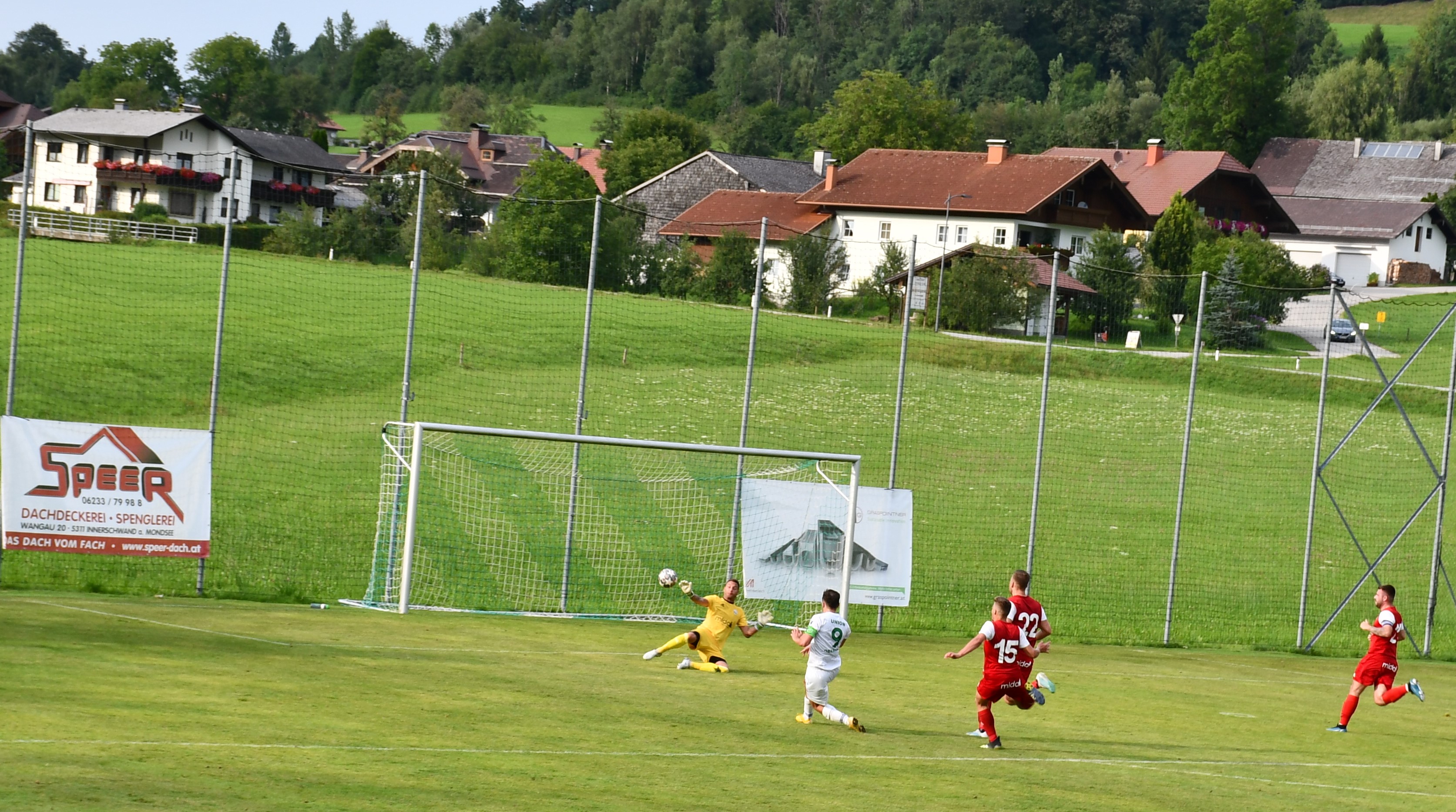 Oberwang startet druckvoll und kommt gleich in der ersten Minute durch Niklas Sperr zur ersten Chance, der setzt seinen Schuss aber am Tor vorbei. In der 4. Minute folgt der erste Auftritt von Christoph König, der dieses Mal in der Startelf steht. Er schießt mit dem Außenrist aufs Tor und liefert so die perfekte Vorlage für Robert Speer, der zum 1:0 trifft. Der Goalgetter hätte in der 9. Minute beinahe das nächste Tor nachgelegt, aber dieses Mal wird der Schuss abgeblockt. Statt 2:0 für Oberwang steht es dann aber plötzlich 1:1. Nenad Vuckovic tankt sich durch die Abwehr und knallt den Ball ins Netz – keine Chance für Leo Karlinger, der dieses Mal das Oberwanger Tor hütet. Die Heimmannschaft lässt sich durch den Ausgleich aber nicht beirren und greift weiter an. Bei einem Freistoß von Mario Lettner prüft Nemanja Spasojevic per Kopf seinen eigenen Torhüter. (19.) Auf der Gegenseite setzt sich Johannes Beißkammer im Zweikampf gegen Peter Lametschwandtner durch, trifft aber aus spitzem Winkel nur die Stange. Nur eine Minute später probiert es Mario Lettner mit einem Weitschuss. Der Ball geht an die Latte und springt zurück zu Christoph König, der aber den Nachschuss nicht am Tormann vorbeibringt. Dafür glänzt Christoph König in der nächsten Szene, er flankt optimal in den Strafraum für Robert Speer, der volley zum 2:1 einschießt. (31.) Wieder nur eine Minute später hätte Robert Speer beinahe den Hattrick geschnürt, aber sein Schuss geht knapp rechts am Tor vorbei. In der 42. Minute geht das Aluminiumfestival weiter. Bei einem Freistoß von Peter Lametschwandtner scheitert Simon Loindl im ersten Versuch an Tormann Feichtinger, kann im Sitzen aber noch einmal schießen und trifft die Latte. Die erste Hälfte ist durchaus ereignisreich und unterhaltsam, aber ein Treffer fällt sogar noch. In der Schlussminute wird Robert Speer ideal in den Lauf geschickt und der lässt sich diese Chance nicht entgehen und schnürt mit dem 3:1 jetzt wirklich seinen zweiten Hattrick. Oberwang geht also mit einer Zwei-Tore-Führung in die Pause.