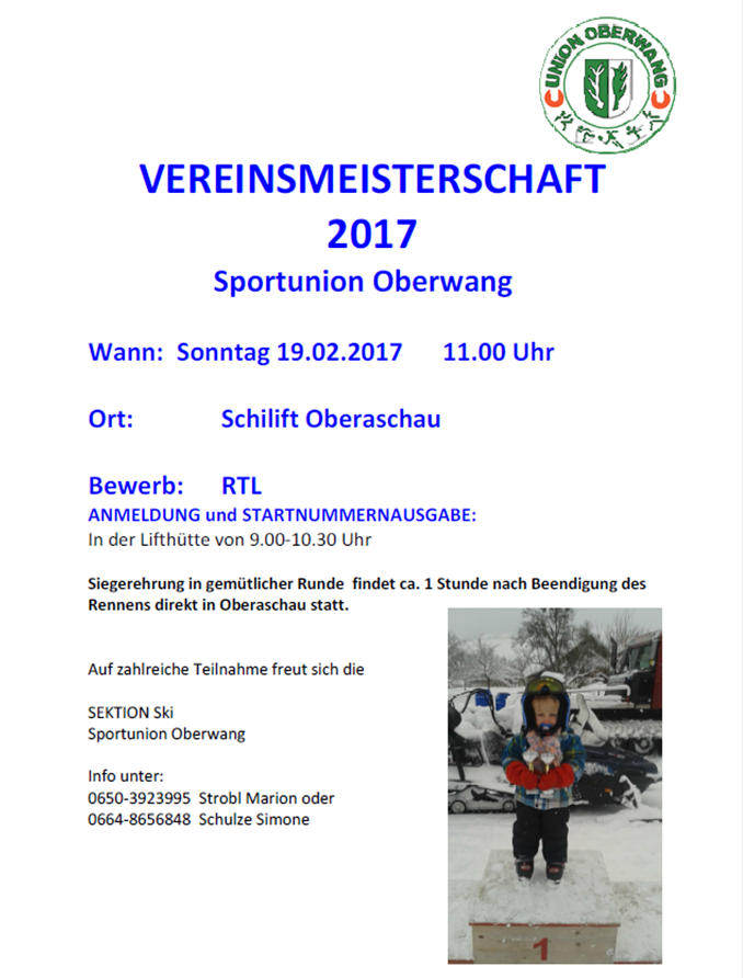 10. Februar 2017 - Sektion Ski Alpin Am Sonntag, 19.02.2017 findet die Vereinsmeisterschaft in Oberaschau statt. Das Rennen beginnt um 11:00 Uhr. Alle schibegeisterten Mitglieder sind recht herzlich eingeladen! Downloads Vereinsmeisterschaft