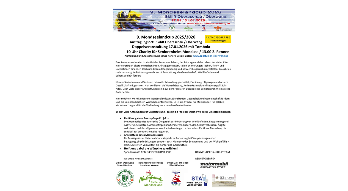 17. Jänner 2026 - Sektion Ski Alpin Am 17.01.2026 starten die ersten beiden Rennen unseres alljährlichen Mondseelandcups. Hier geht es zur Anmeldung: Anmeldung Mondseelandcup 2026 Weitere Infos zum Mondseelandcup findet ihr hier in der Ausschreibung: Ausschreibung Mondseelandcup 2026.pdf Downloads Details