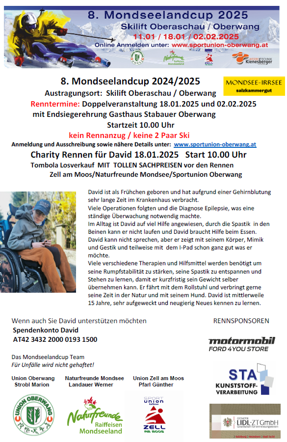 Am Samstag, 18.01.2025 findet das Charity-Rennen in Form einer Doppelveranstaltung des Mondseelandcups für David statt.