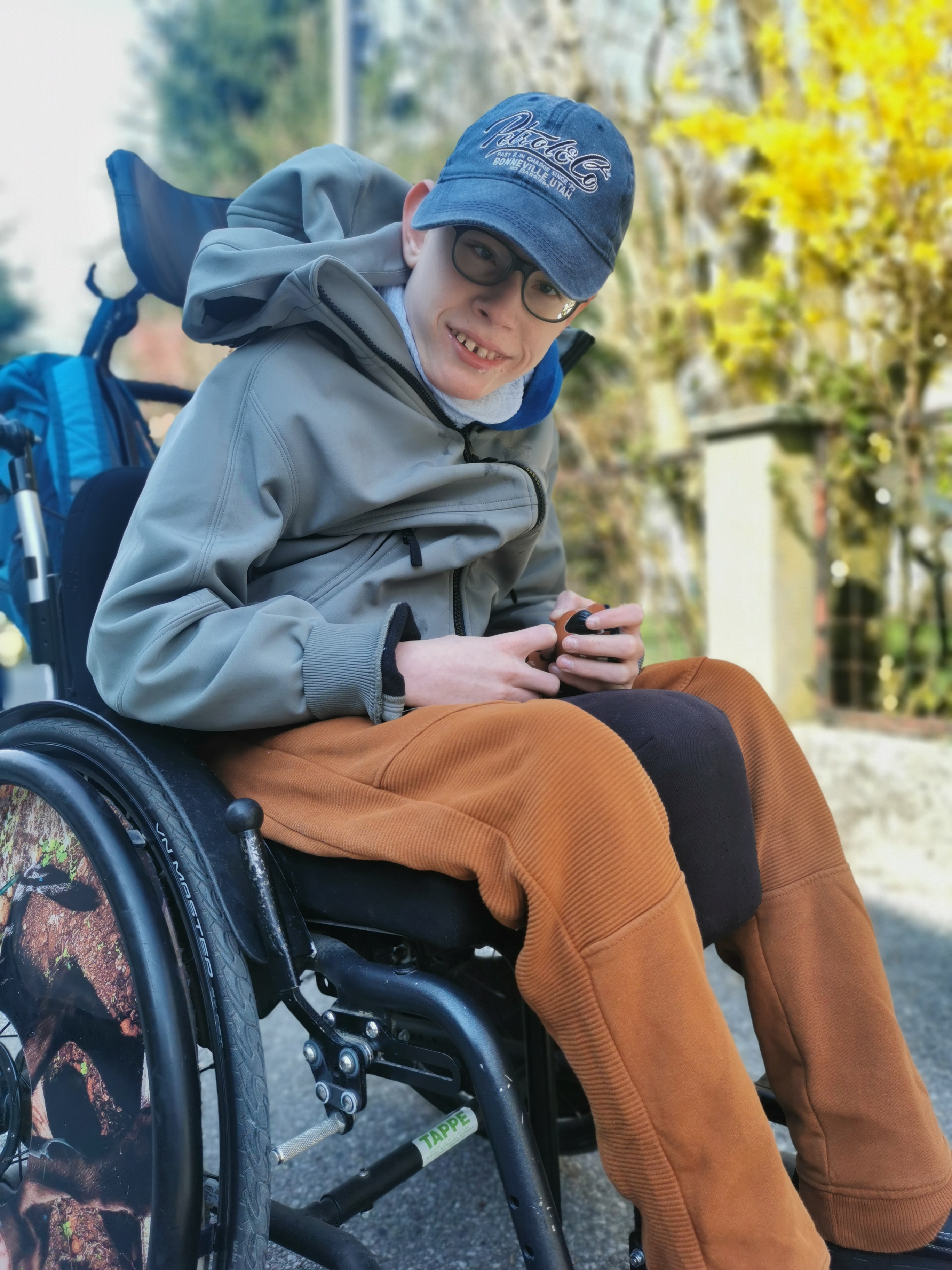 Viele verschiedene Therapien und Hilfsmittel werden benötigt um seine Rumpfstabilität zu stärken, seine Spastik zu entspannen und Stehen zu lernen, damit er kurzfristig sein Gewicht selber übernehmen kann. Er fährt mit dem Rollstuhl und verbringt gerne seine Zeit in der Natur und mit seinem Hund. David ist mittlerweile 15 Jahre, sehr aufgeweckt und neugierig Neues kennen zu lernen.